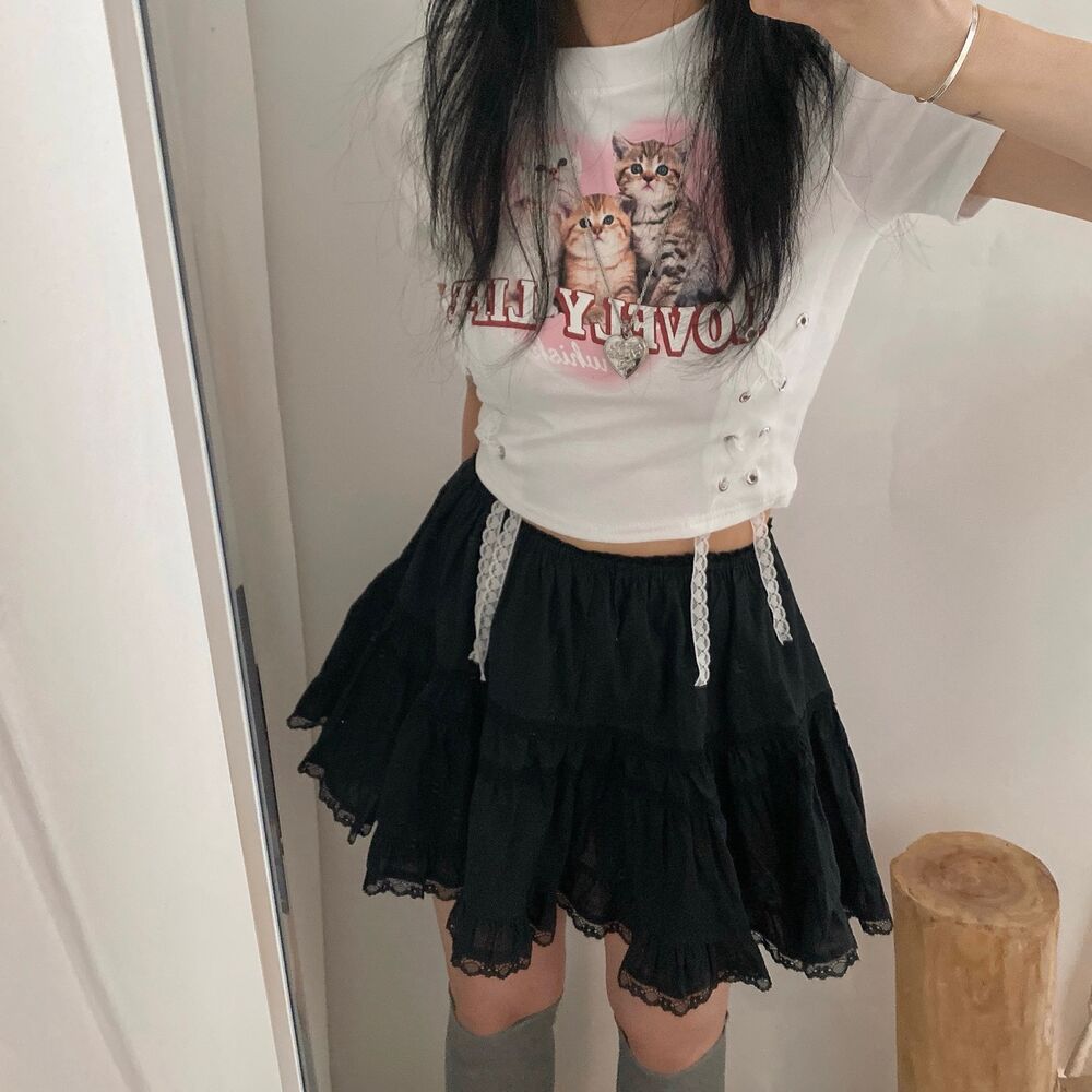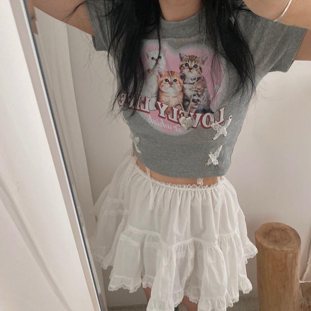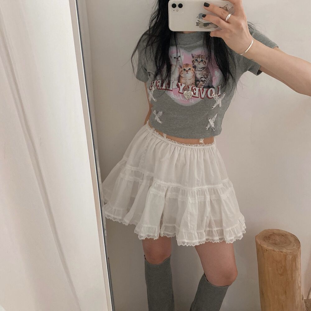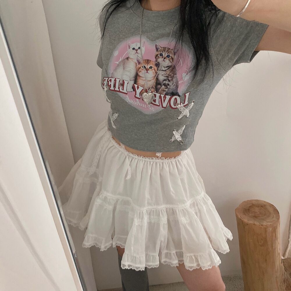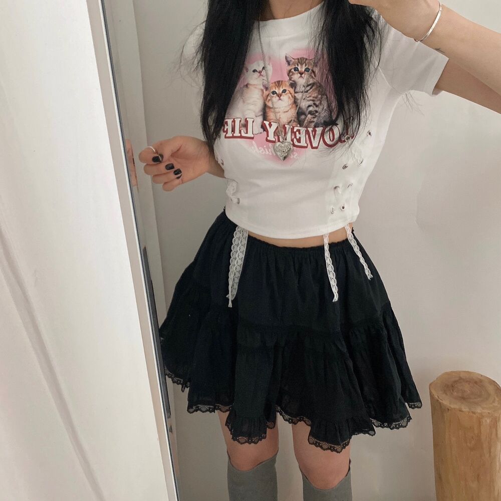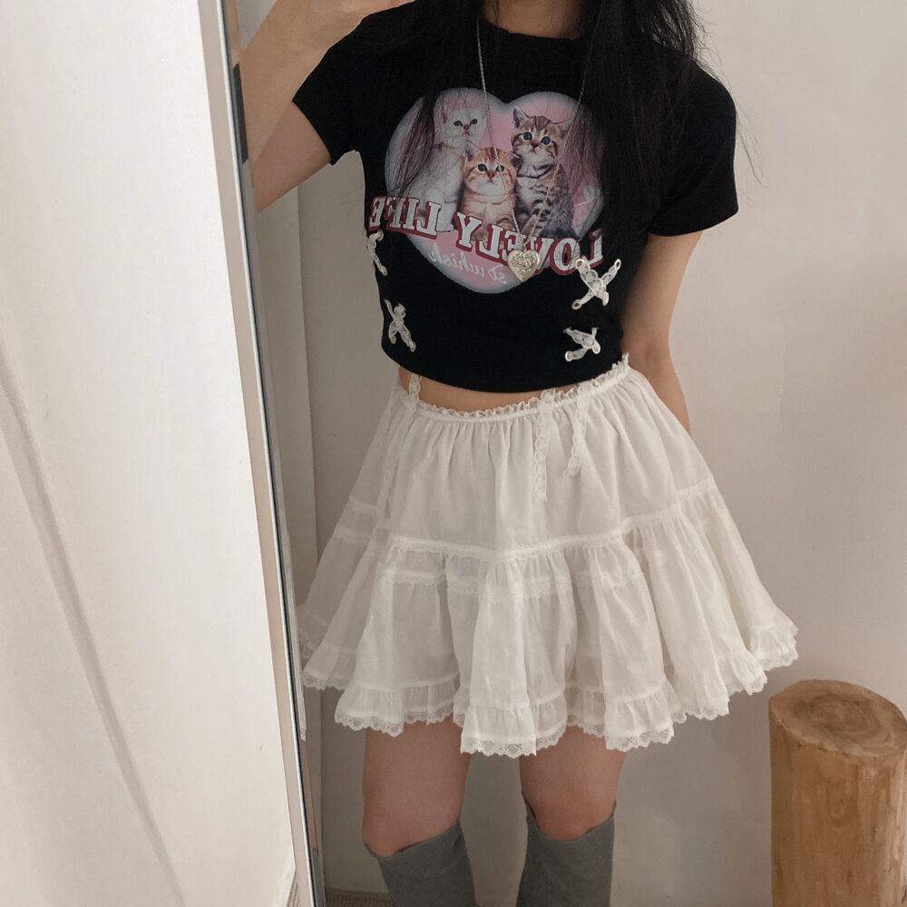 猫ハートプリントクロップドレース半袖Tシャツ