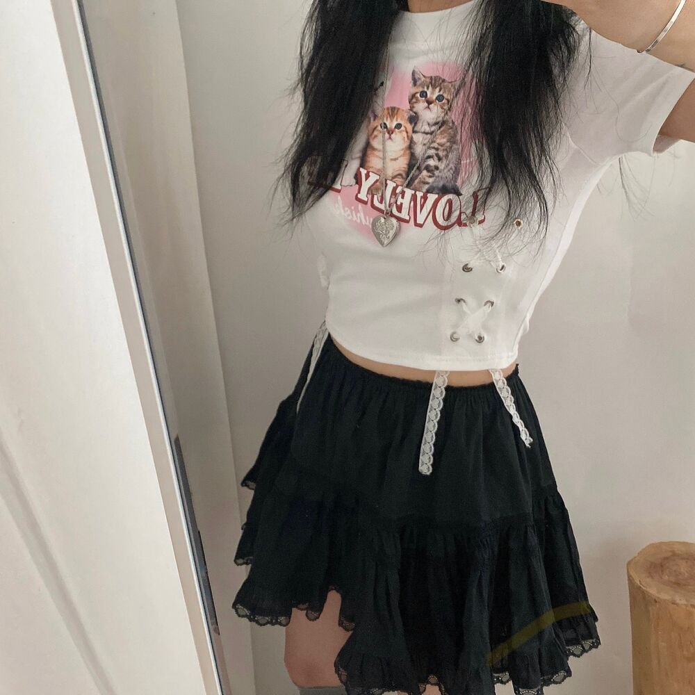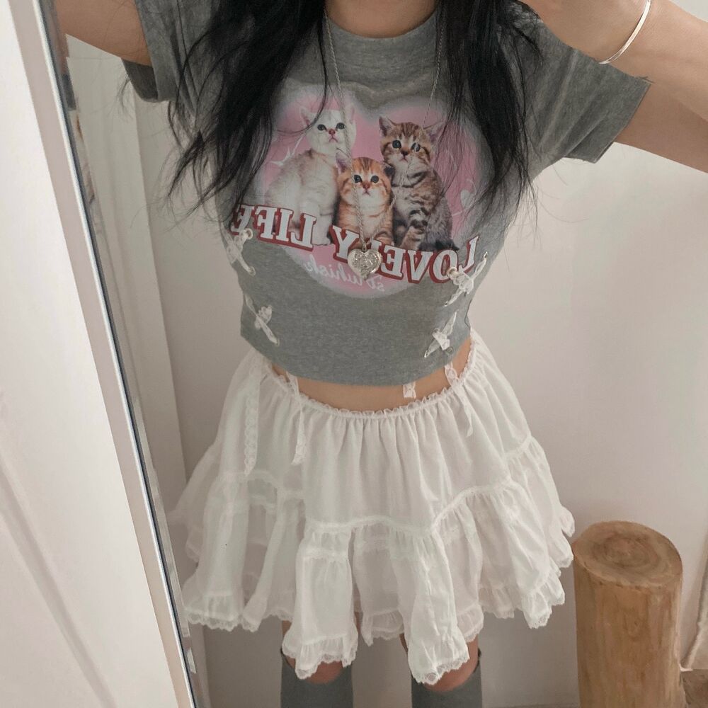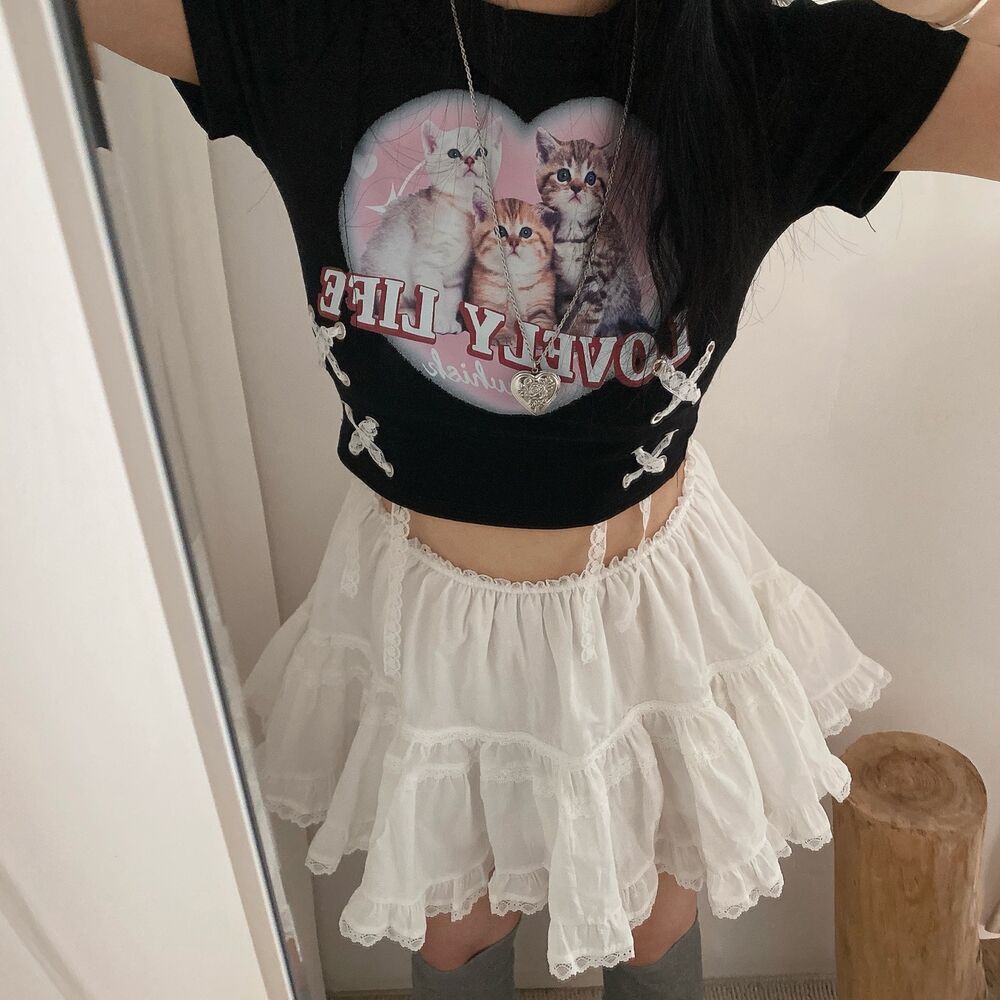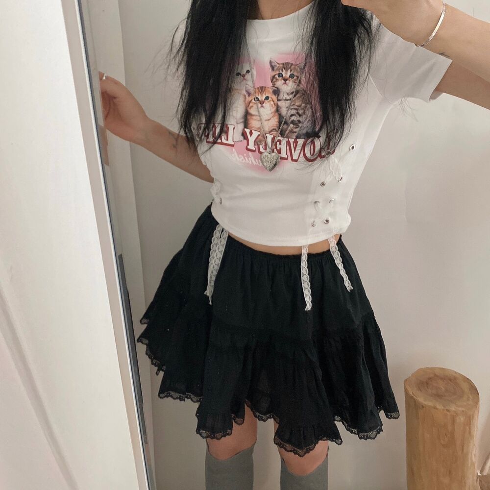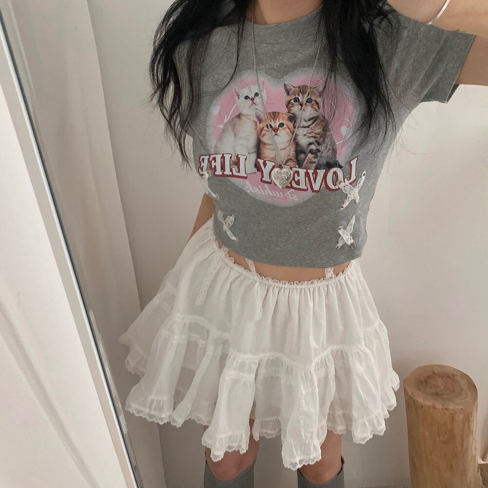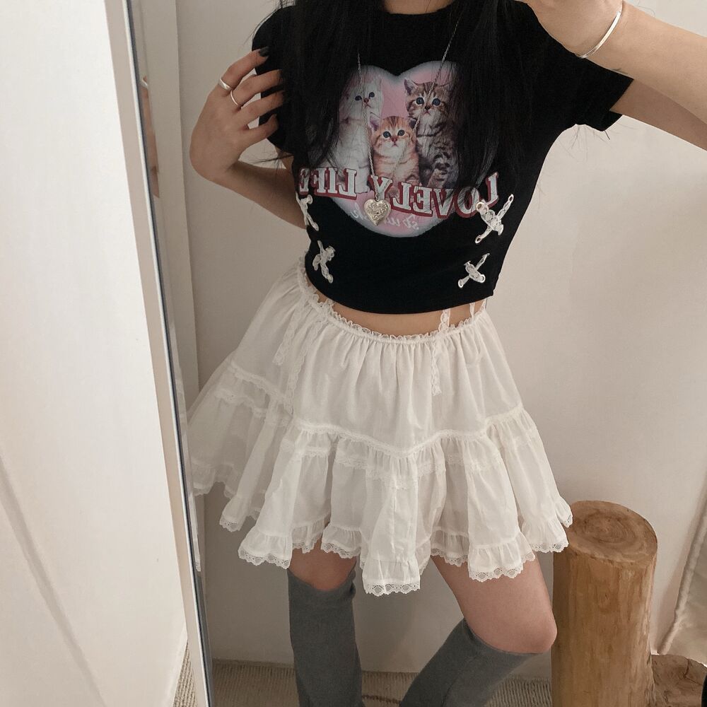 猫ハートプリントクロップドレース半袖Tシャツ