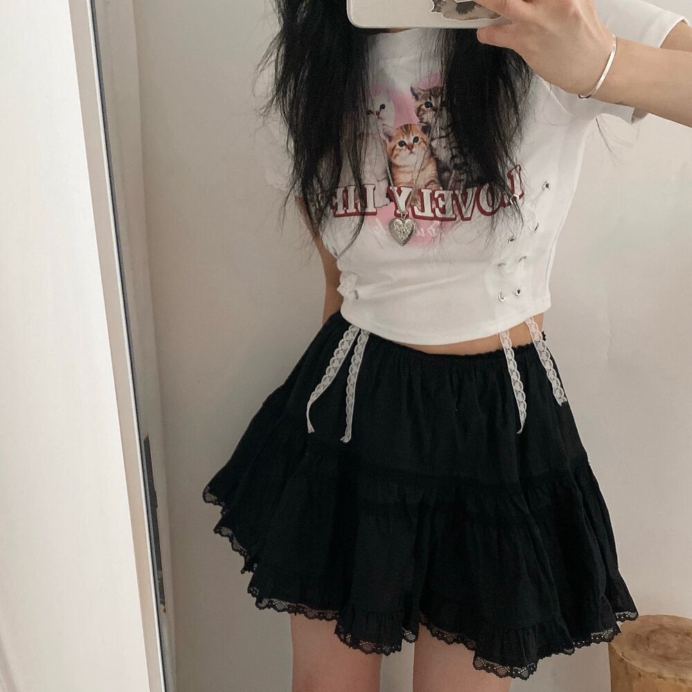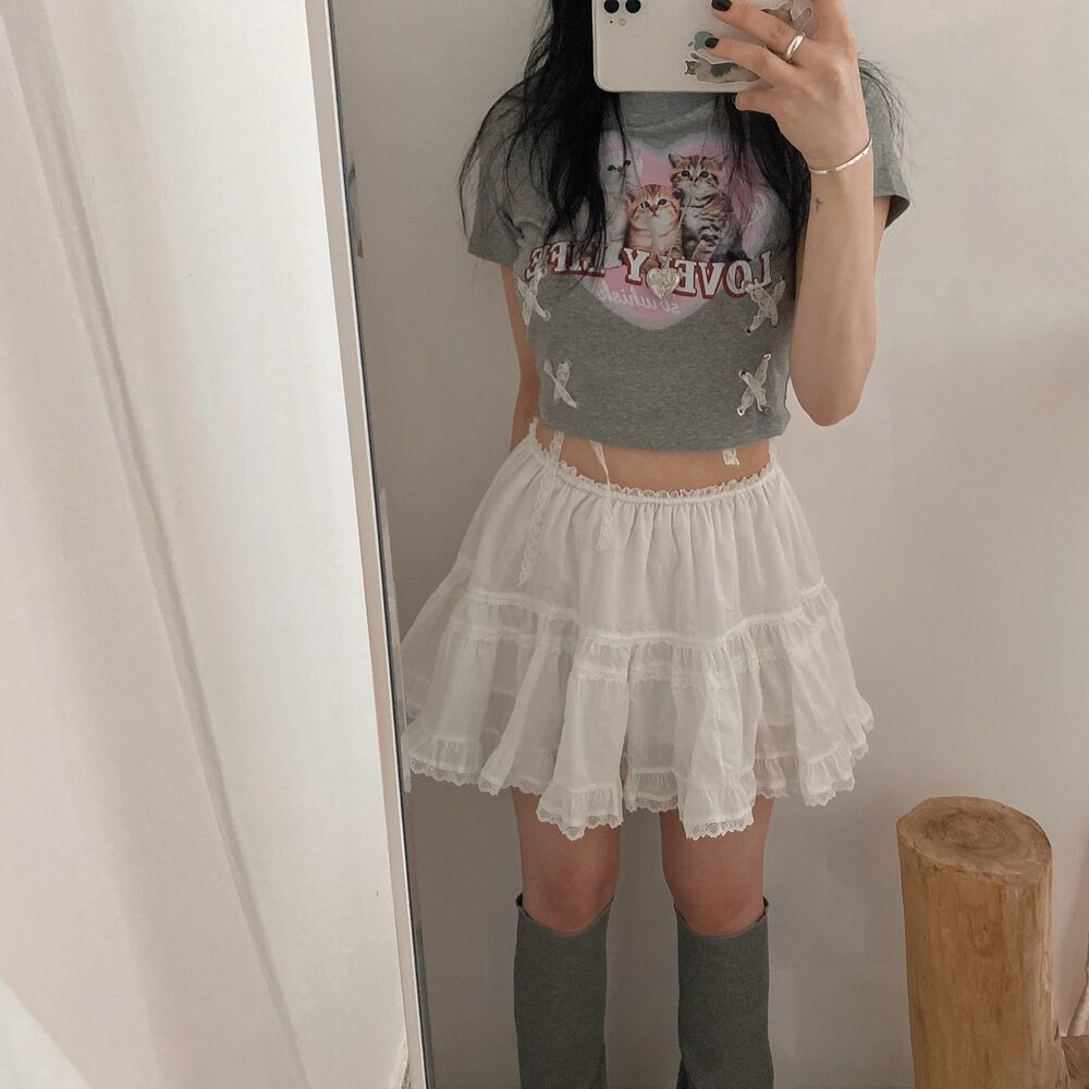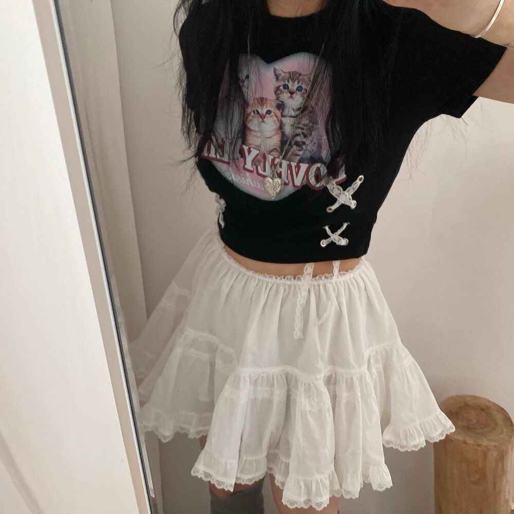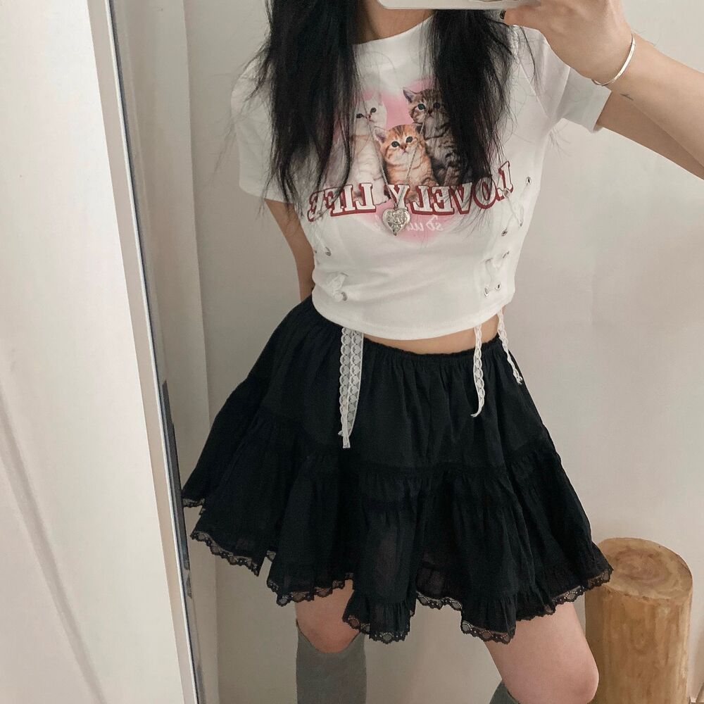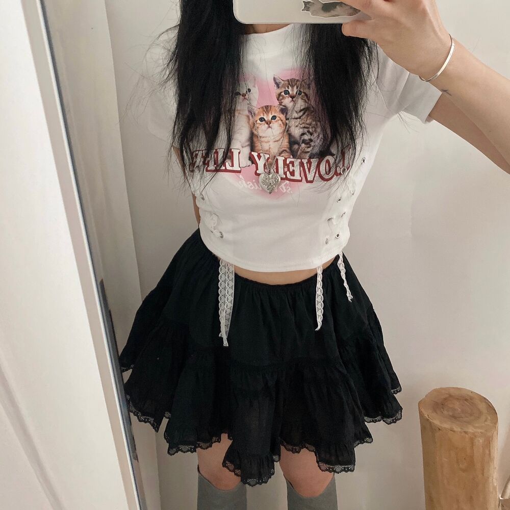 猫ハートプリントクロップドレース半袖Tシャツ