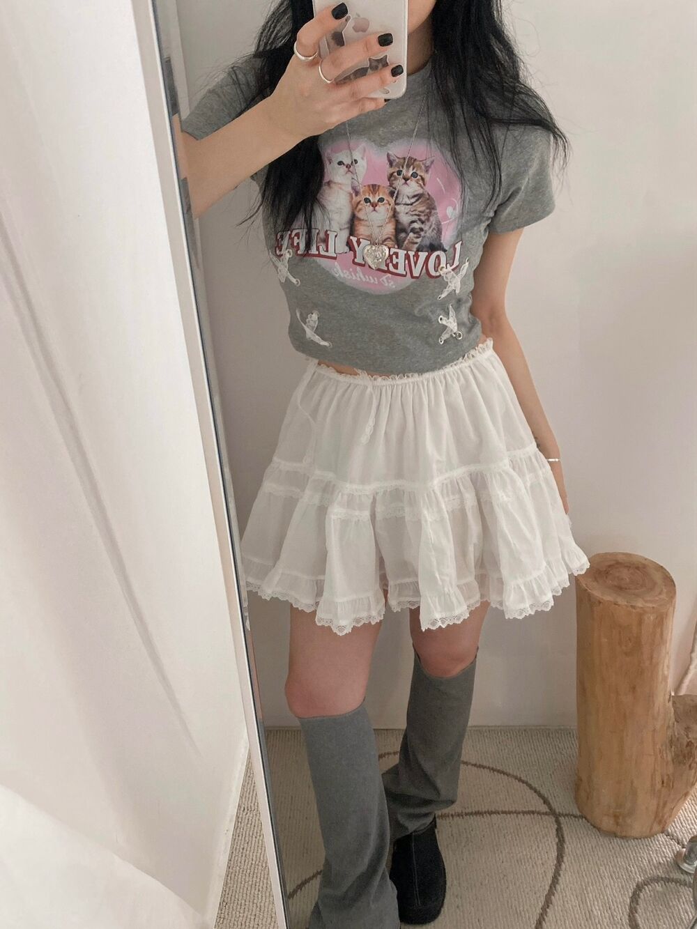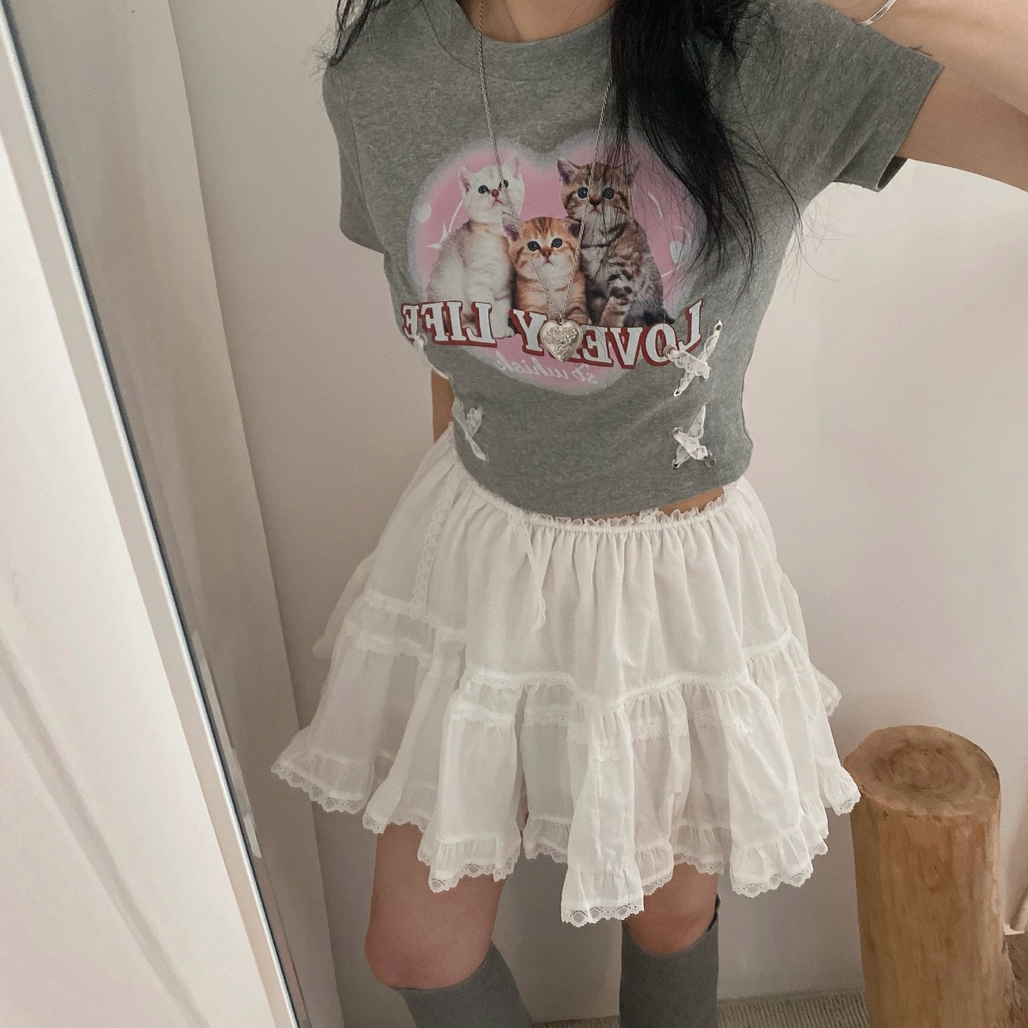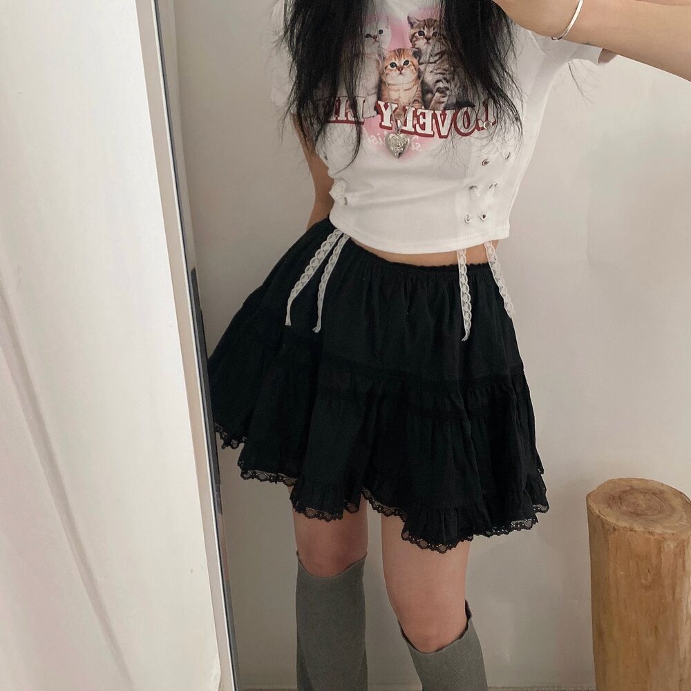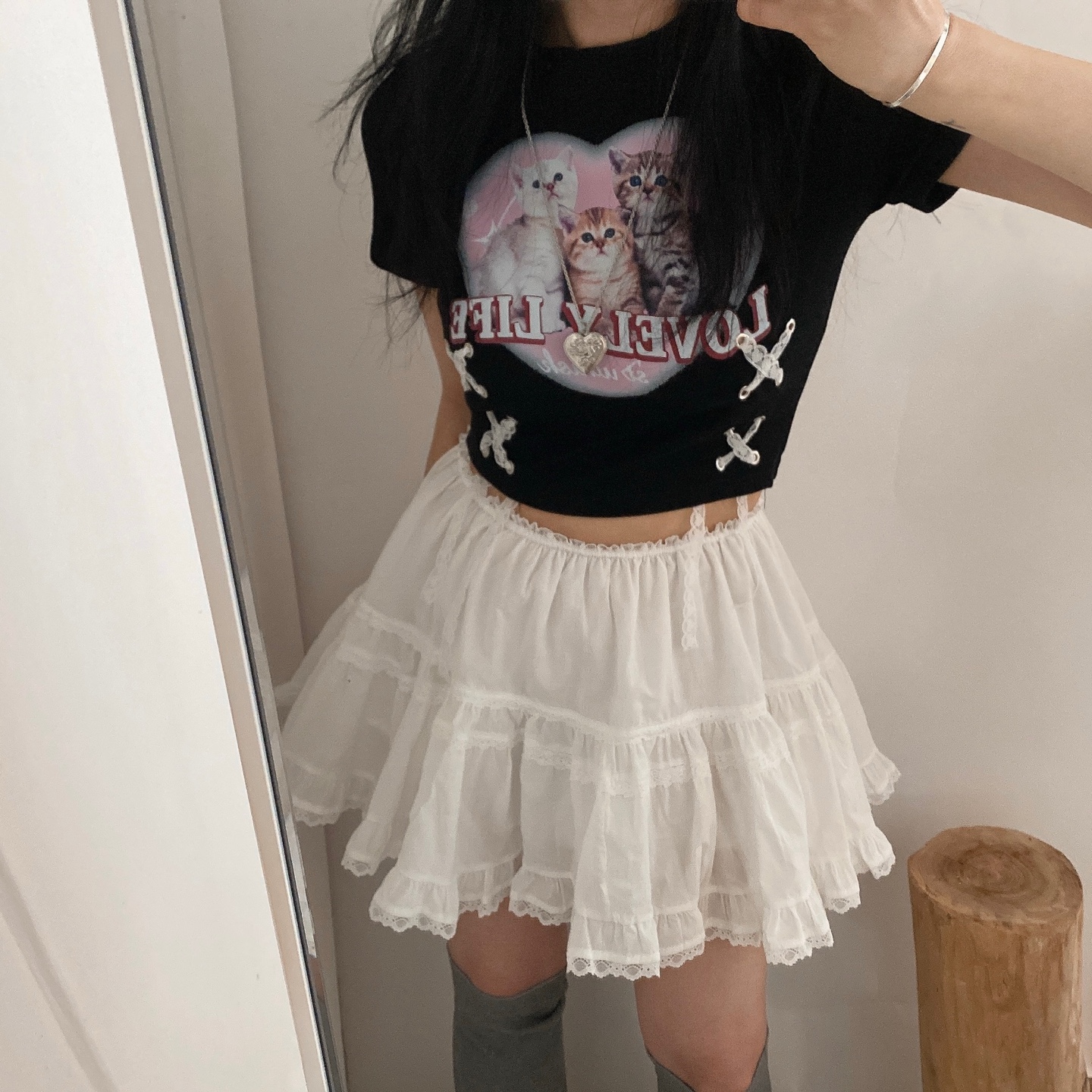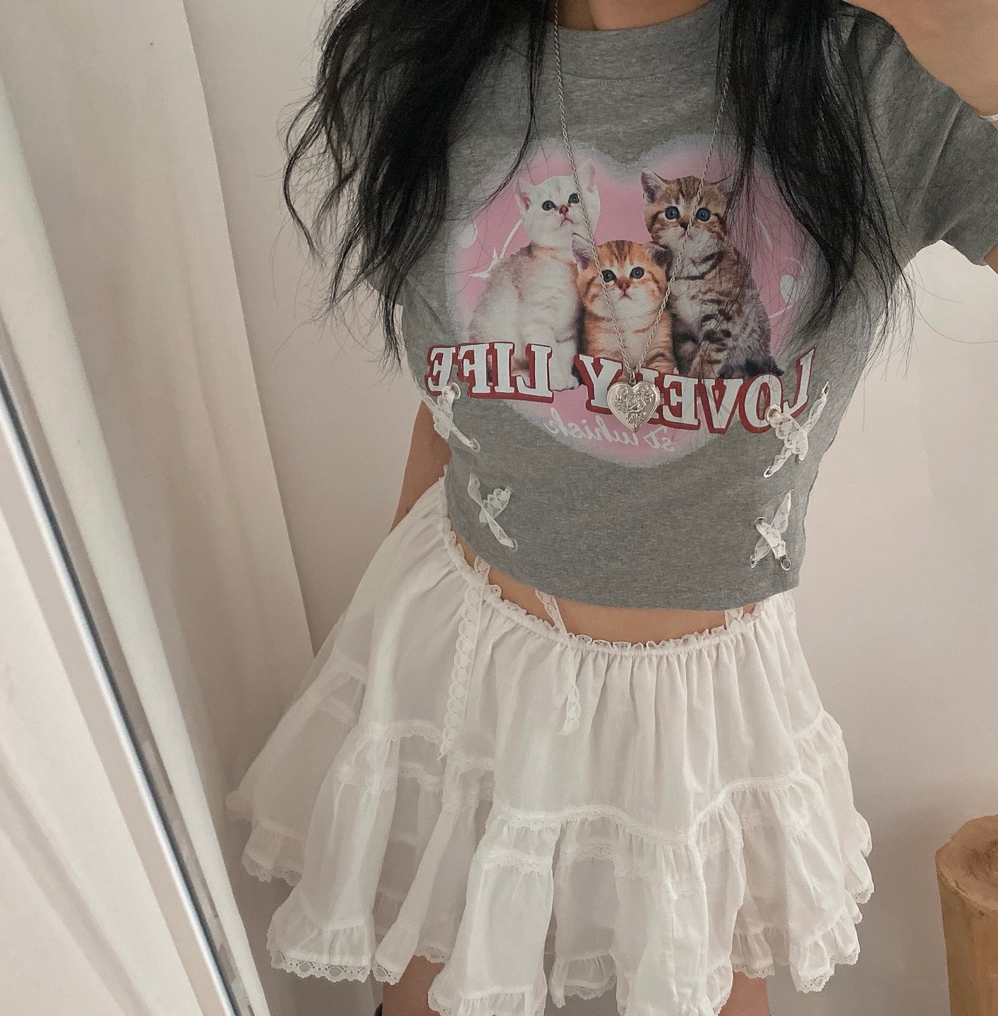猫ハートプリントクロップドレース半袖Tシャツ
