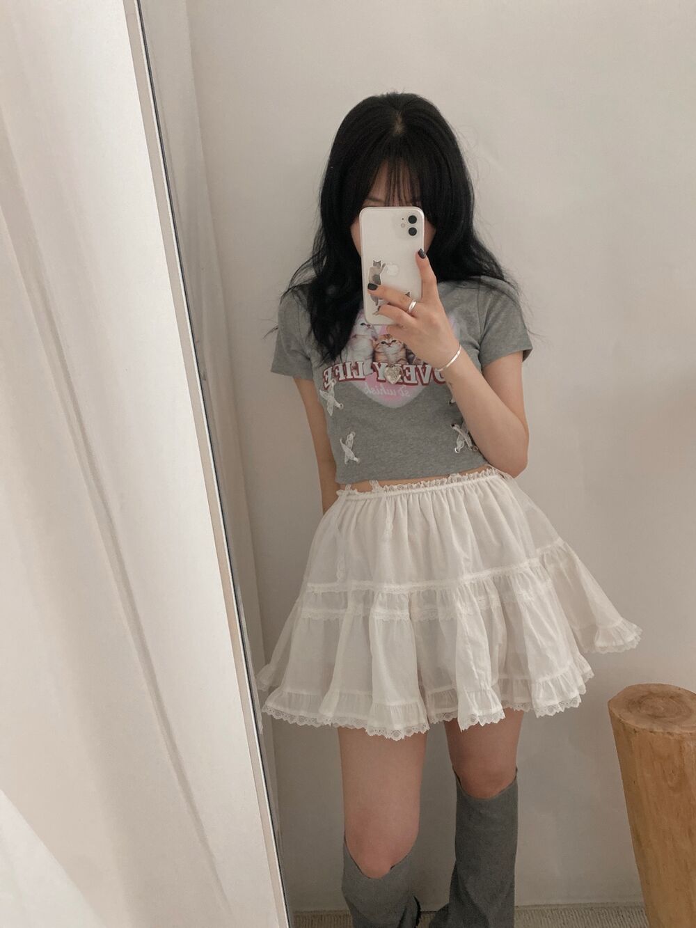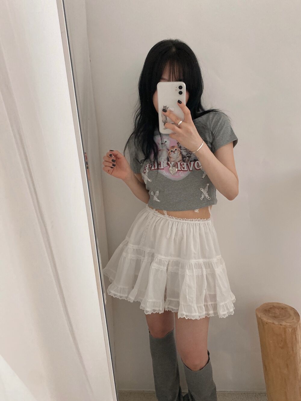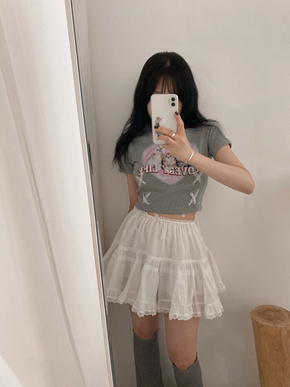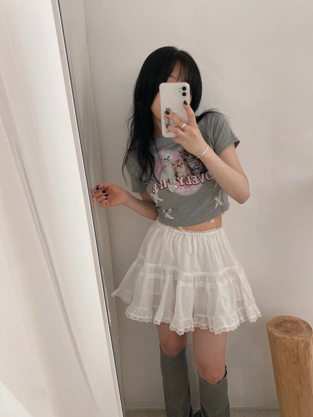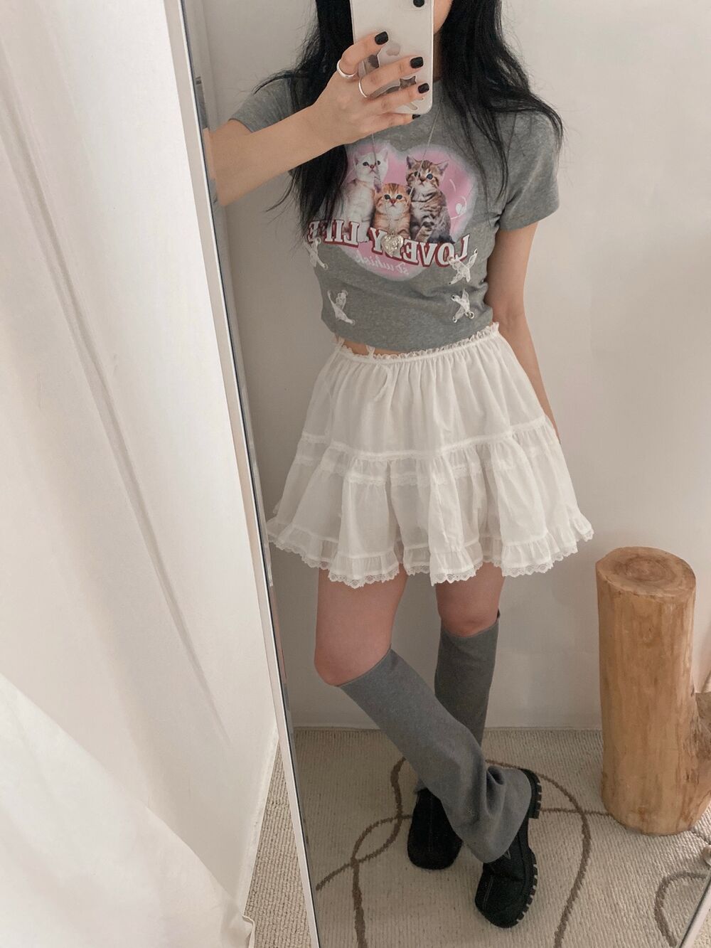 猫ハートプリントクロップドレース半袖Tシャツ