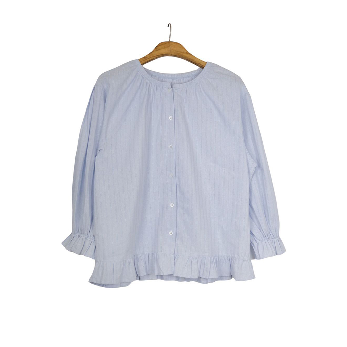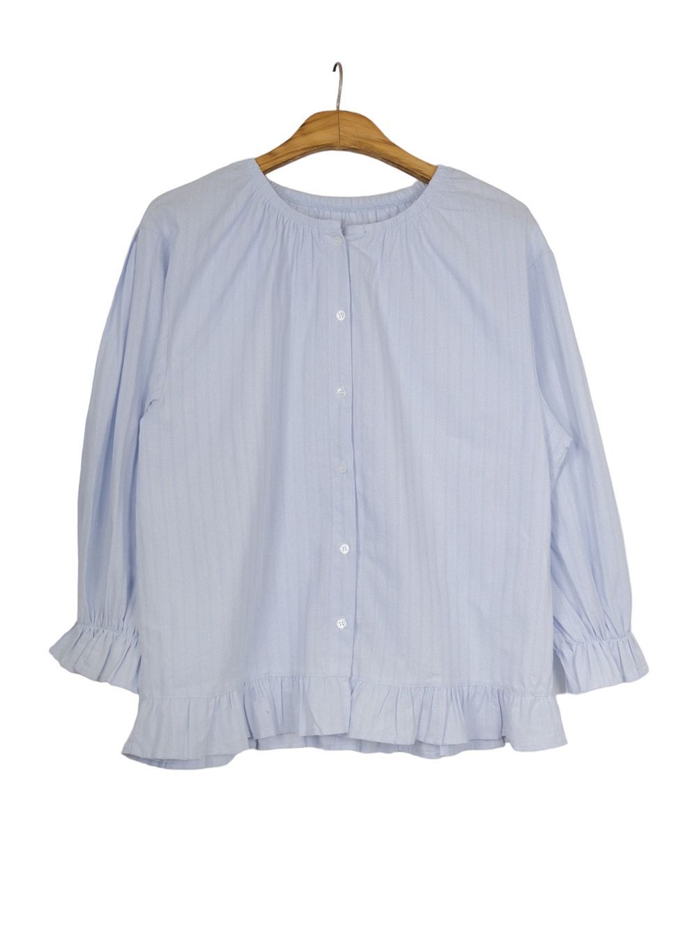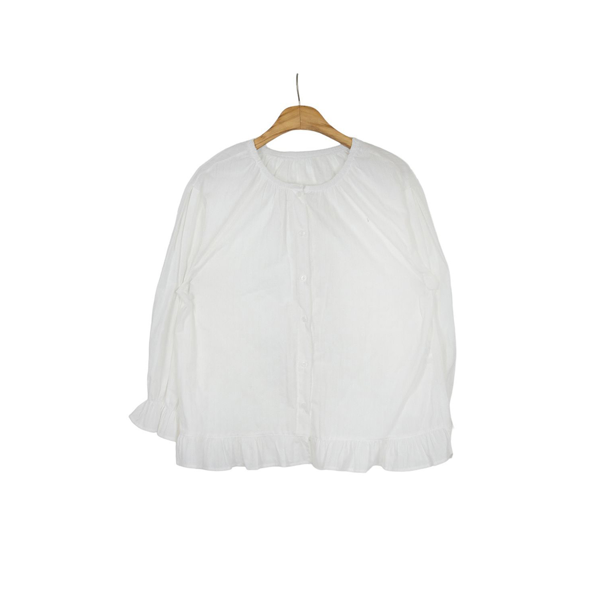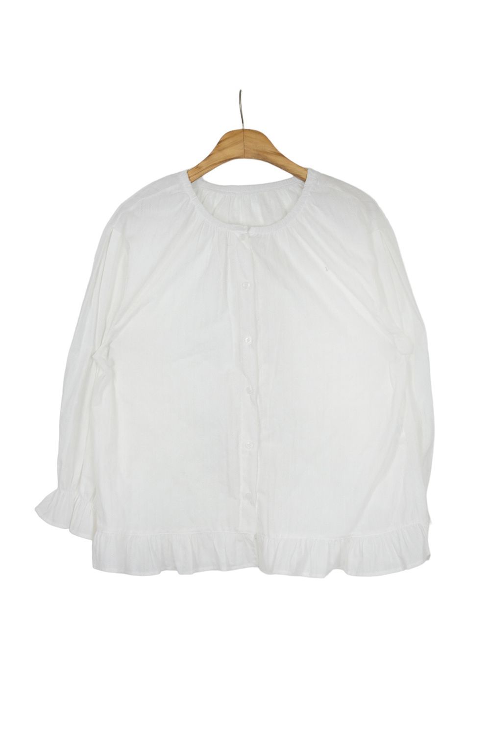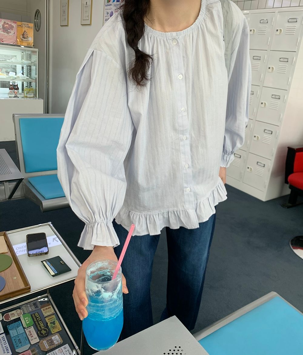 ラウンドネックコットンパフ袖フリルブラウス