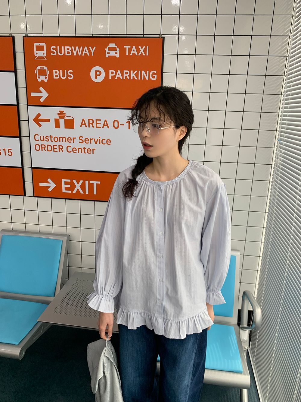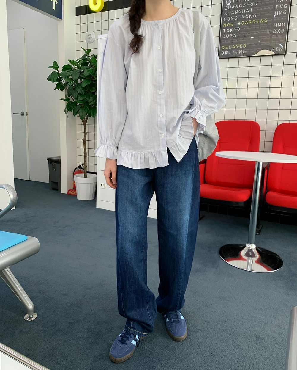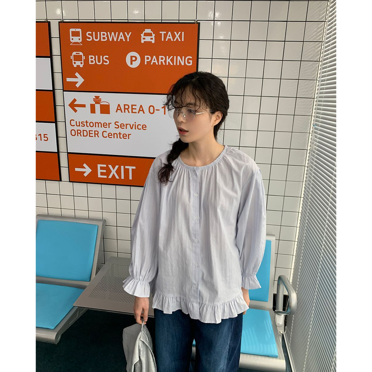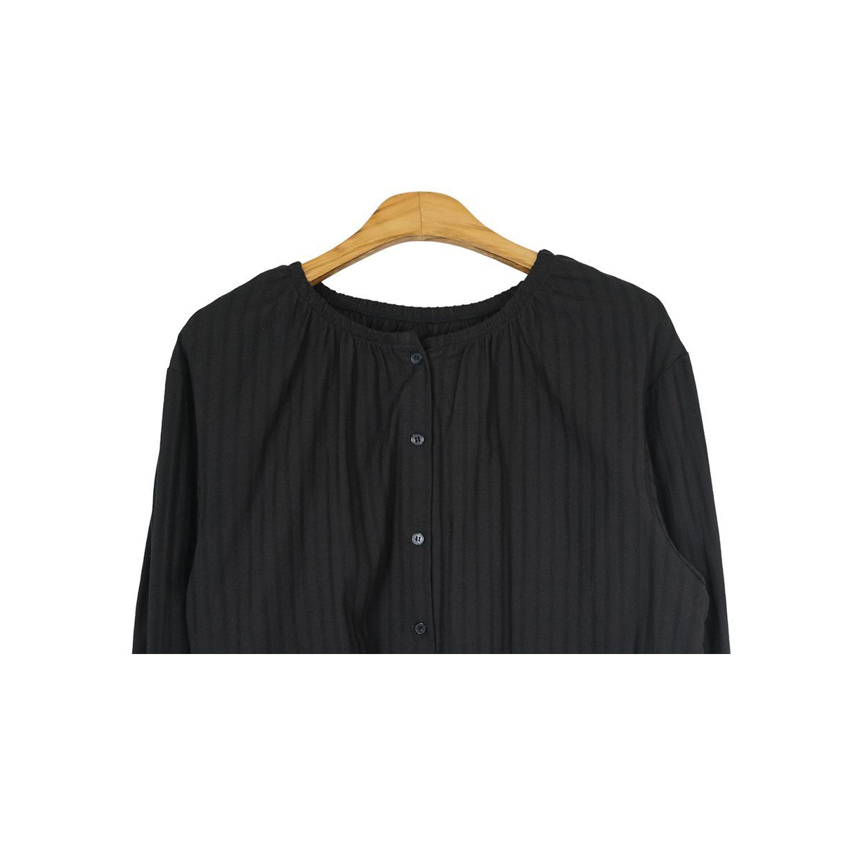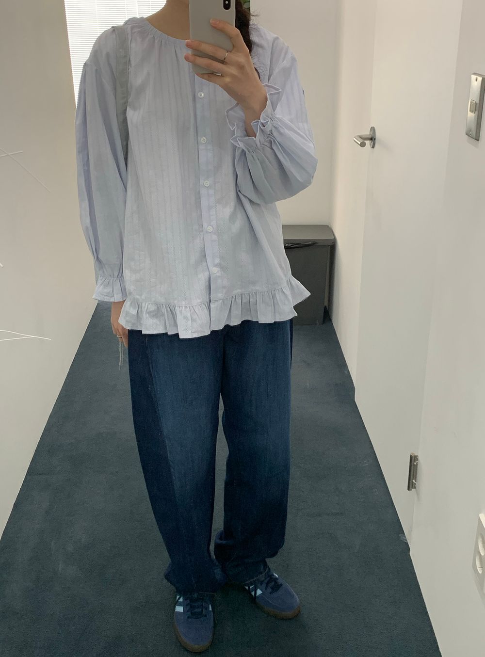 ラウンドネックコットンパフ袖フリルブラウス