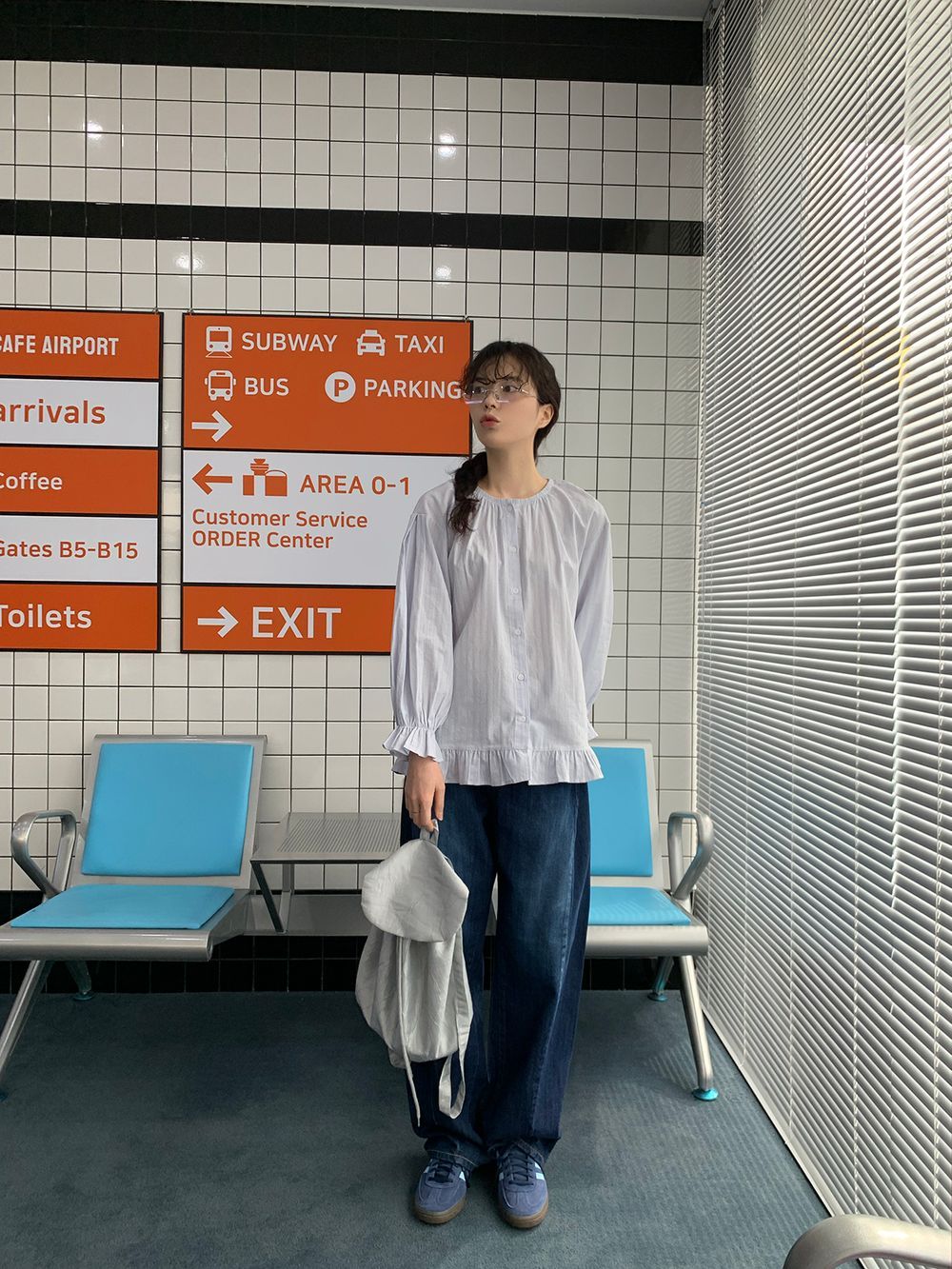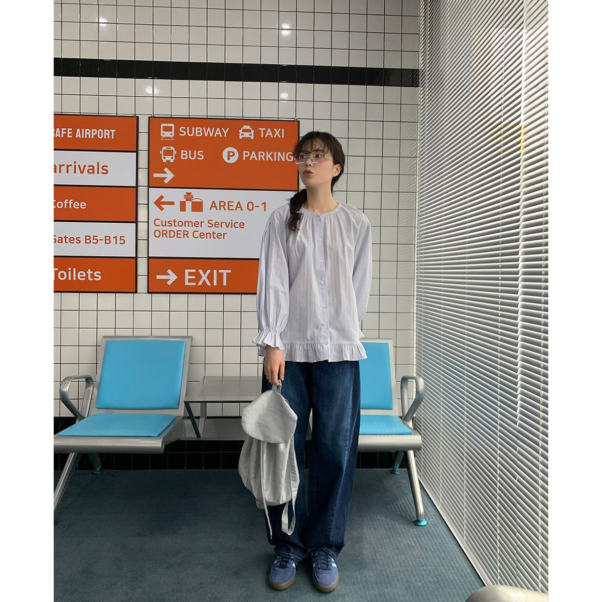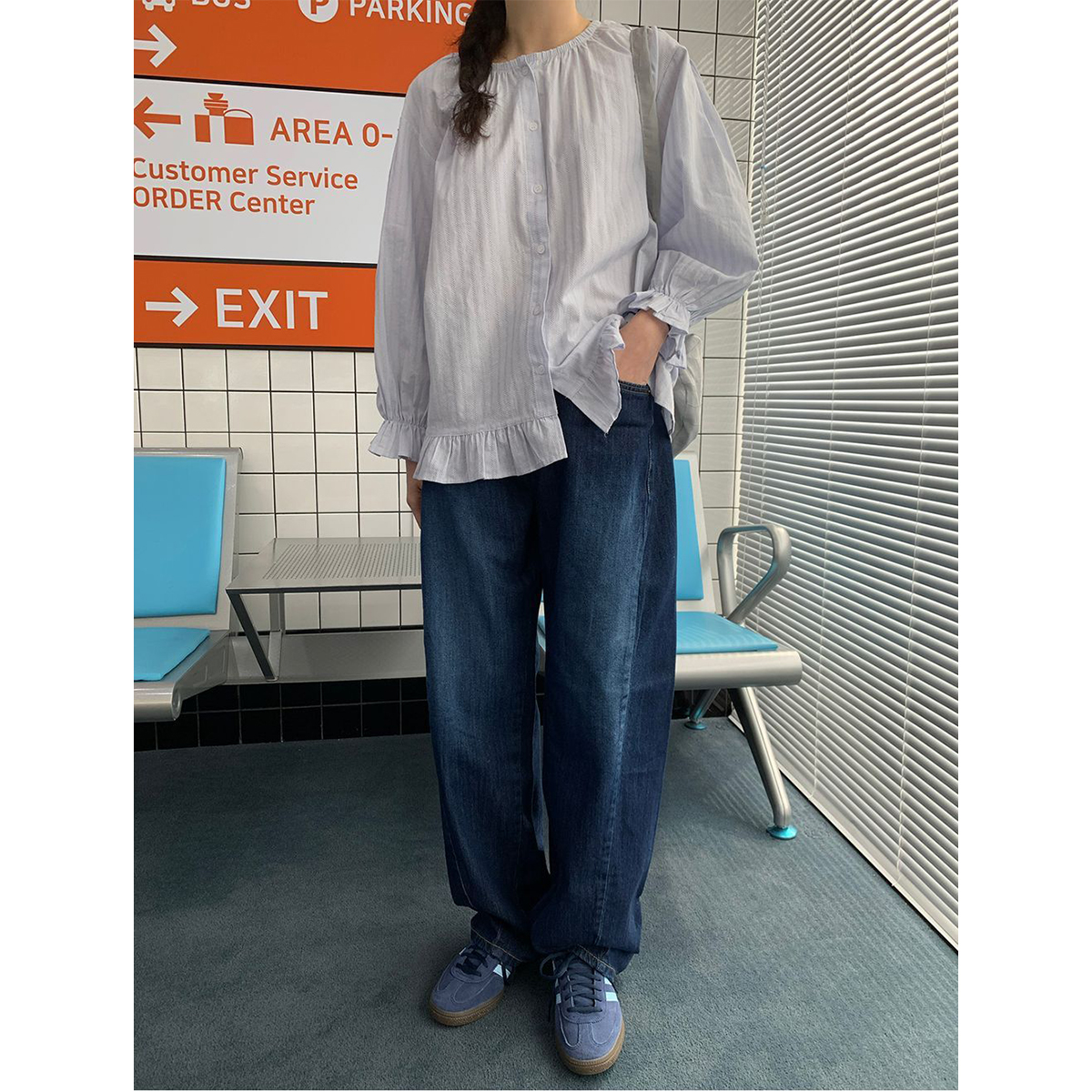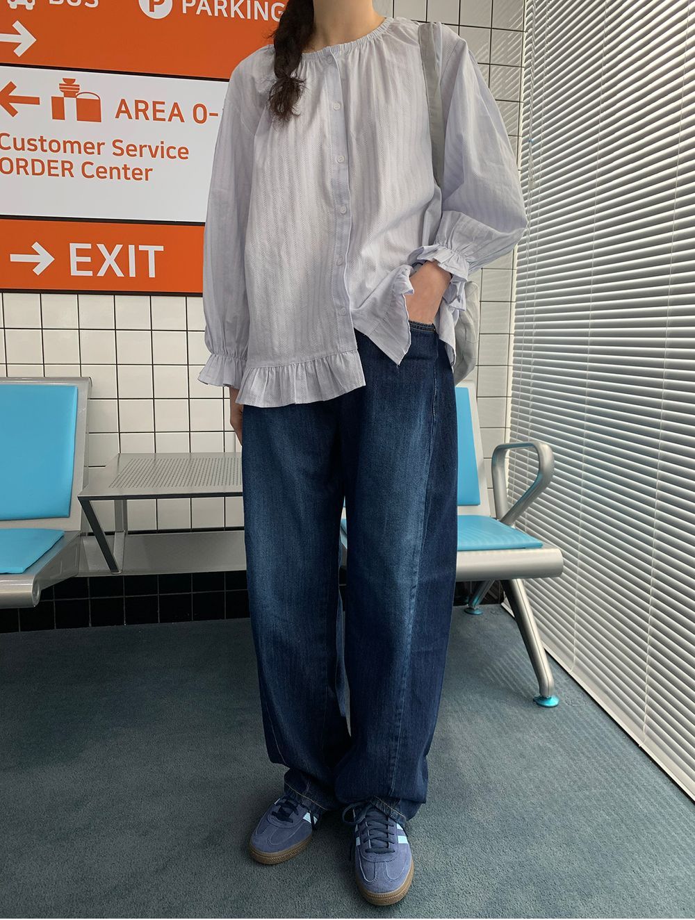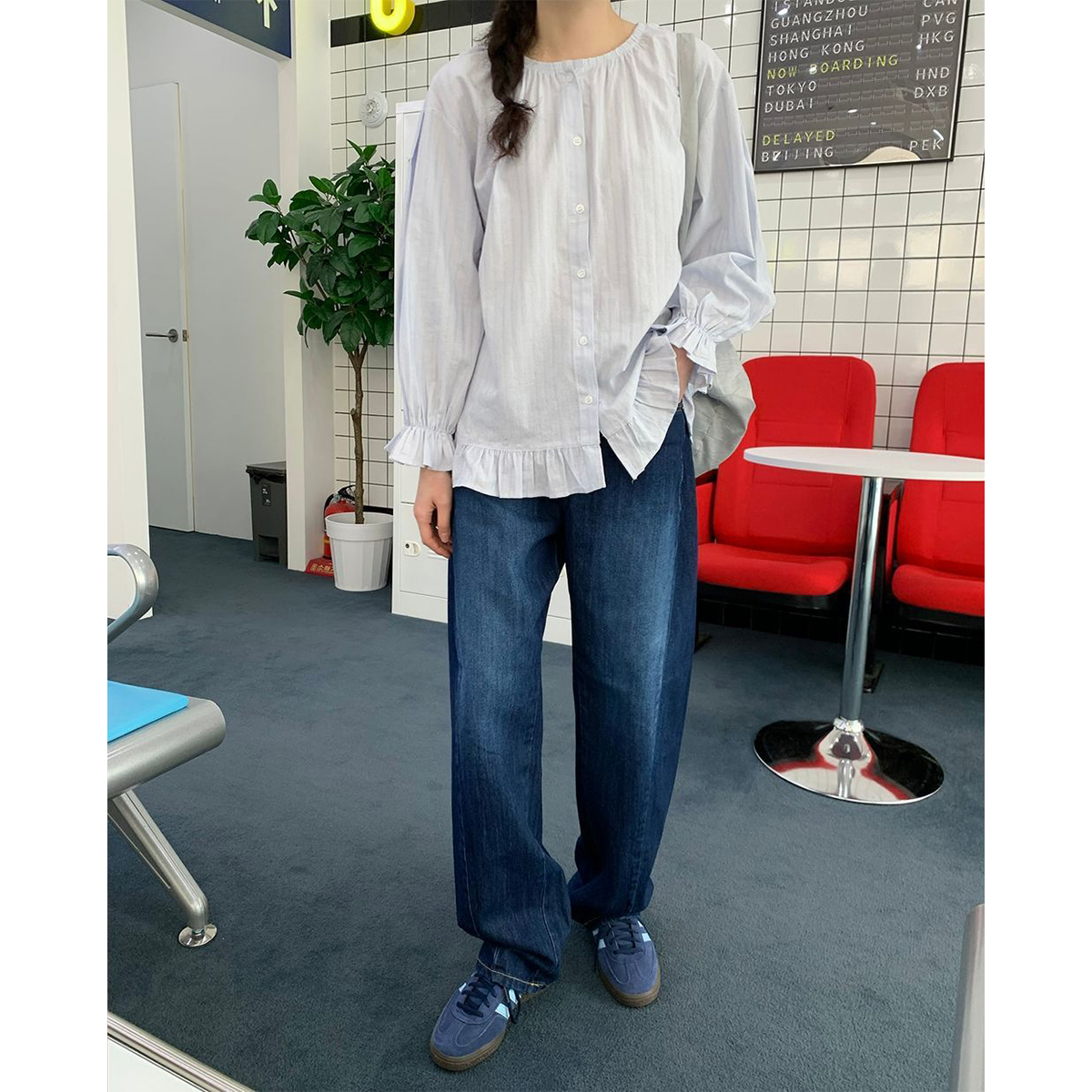 ラウンドネックコットンパフ袖フリルブラウス