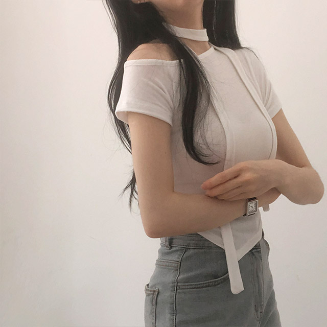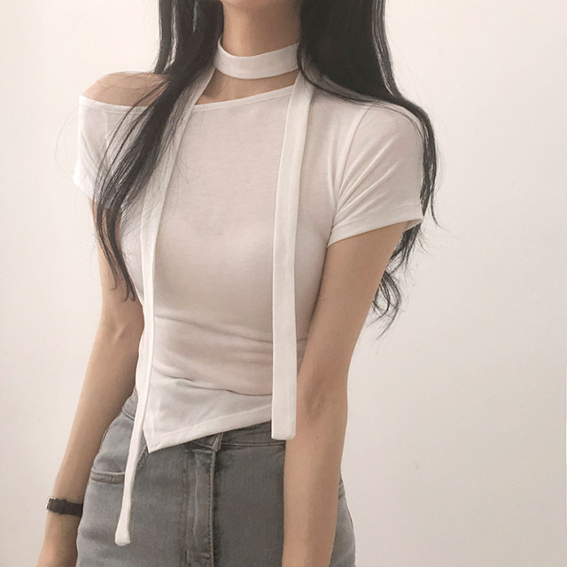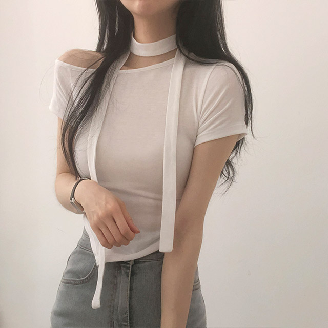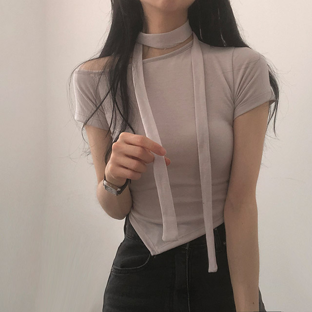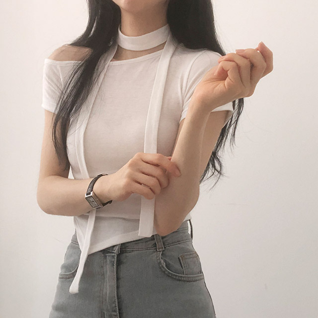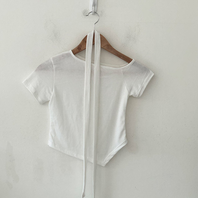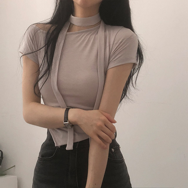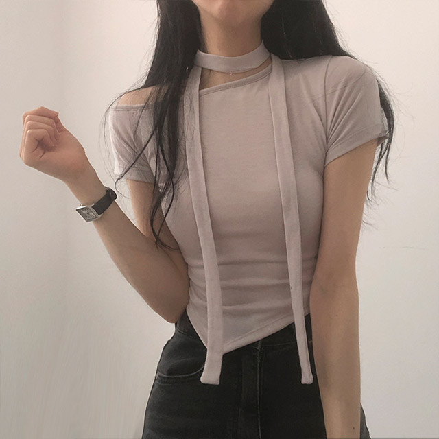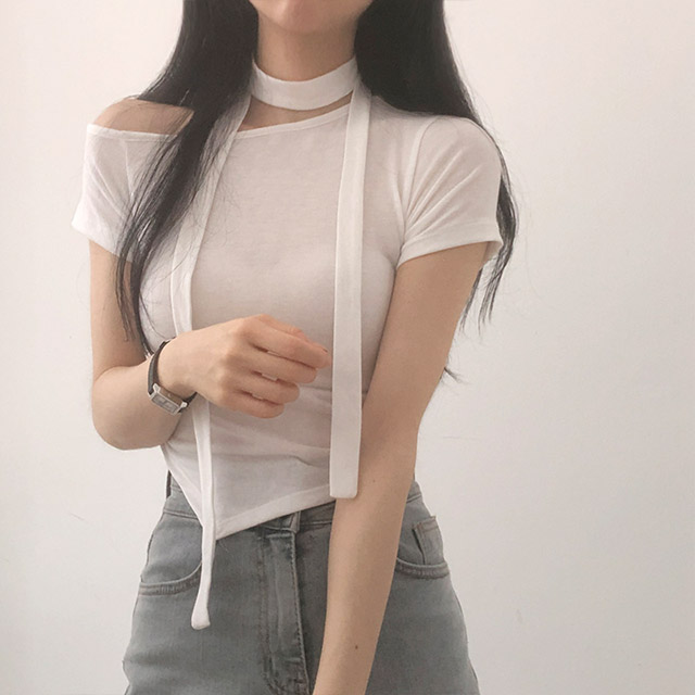 [マフラーセット] 斜めストライプクロップド半袖Tシャツ