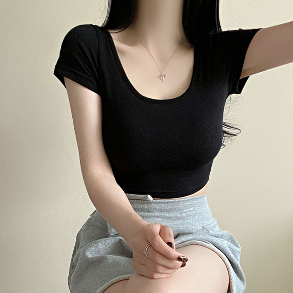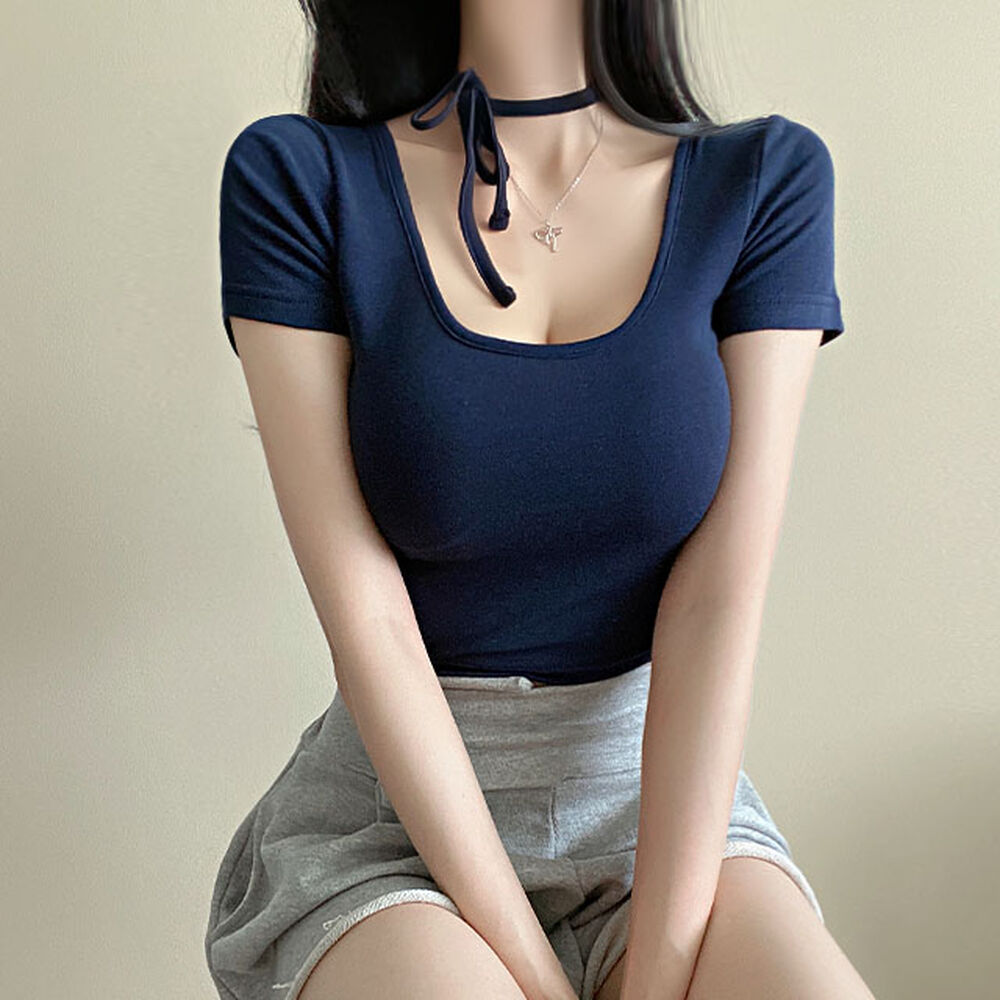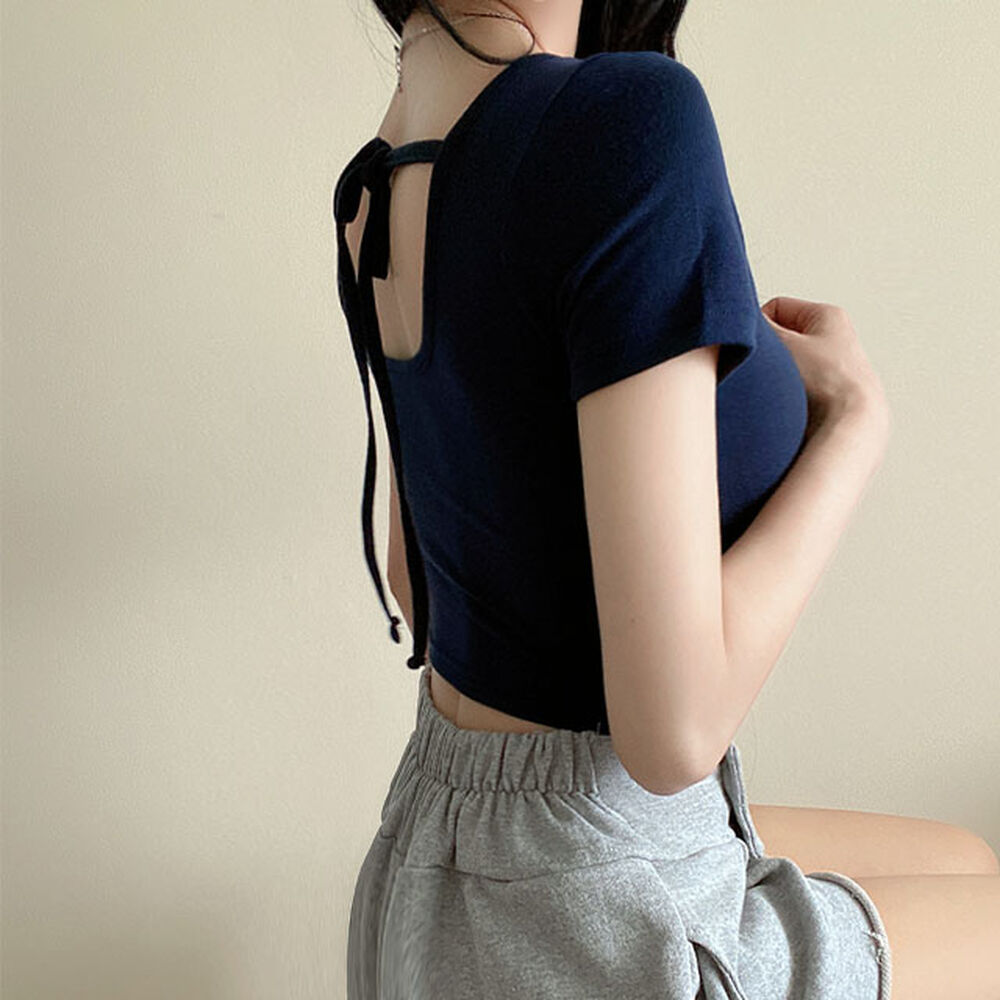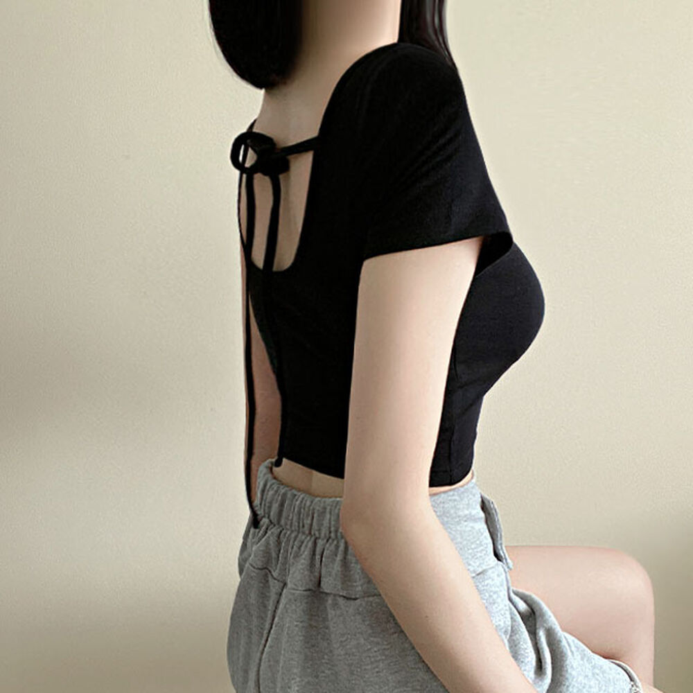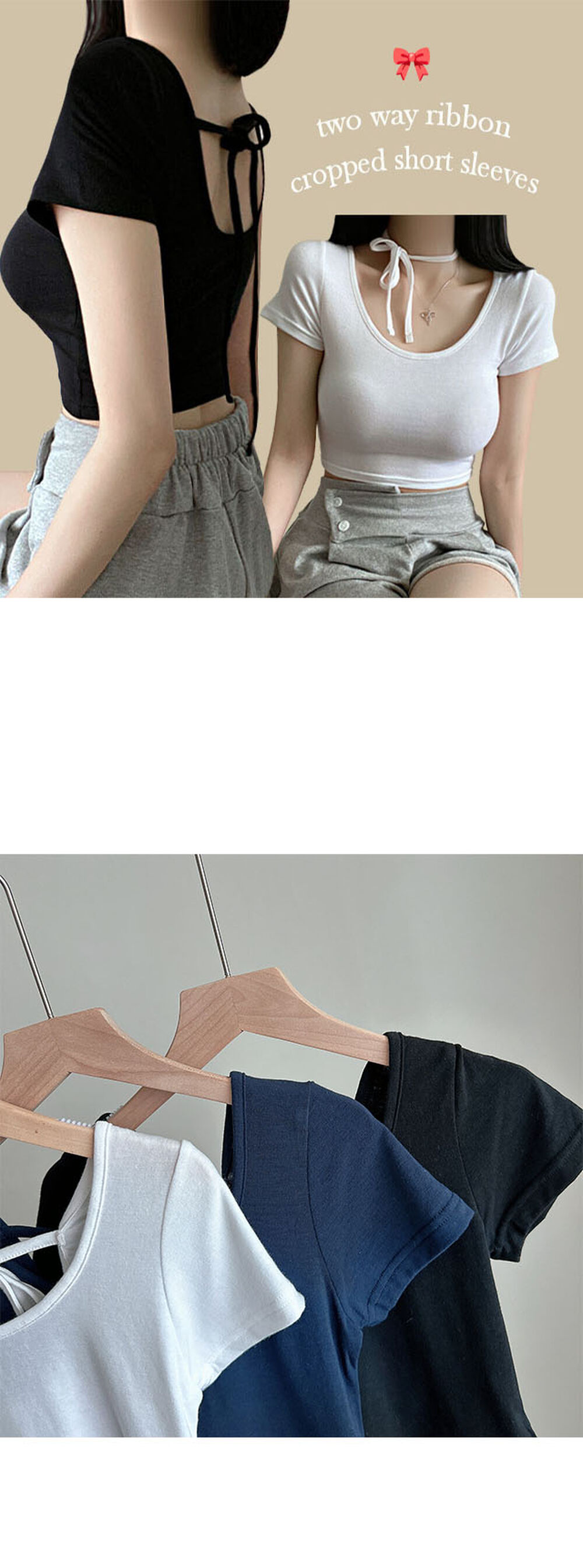 2WAYリボンクロップドスリム無地チョーカーバックリボン半袖Tシャツ