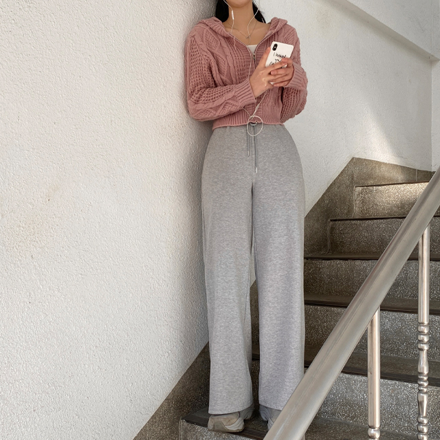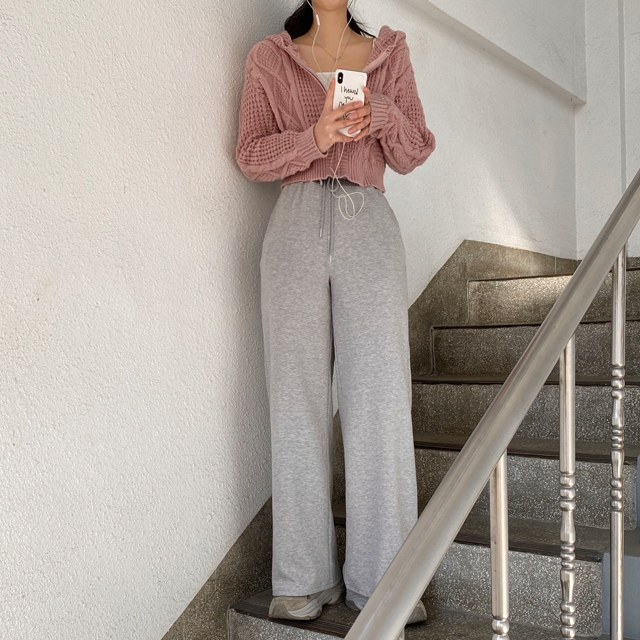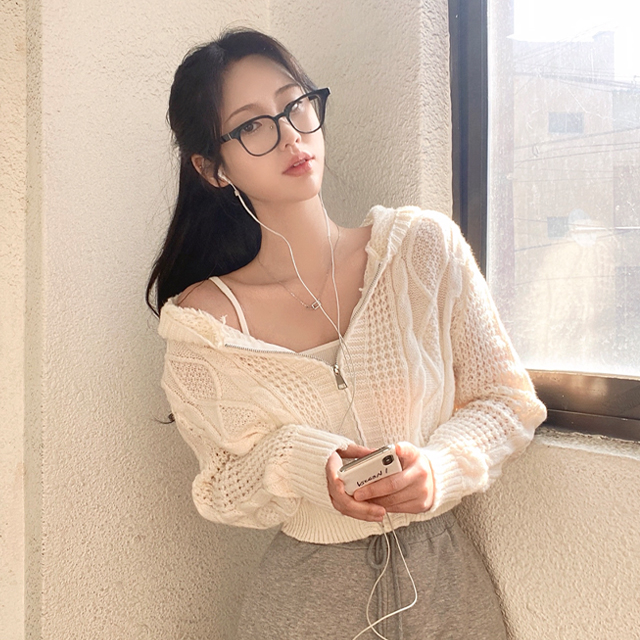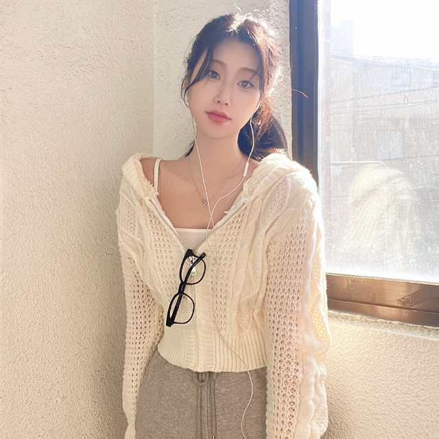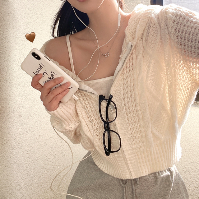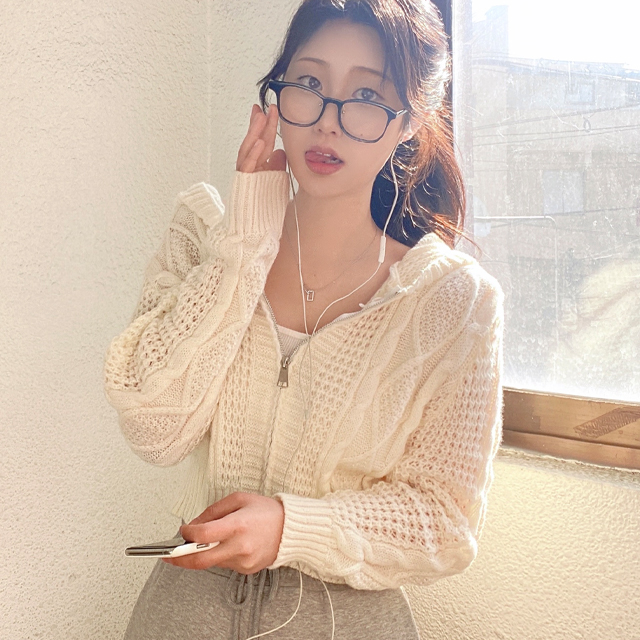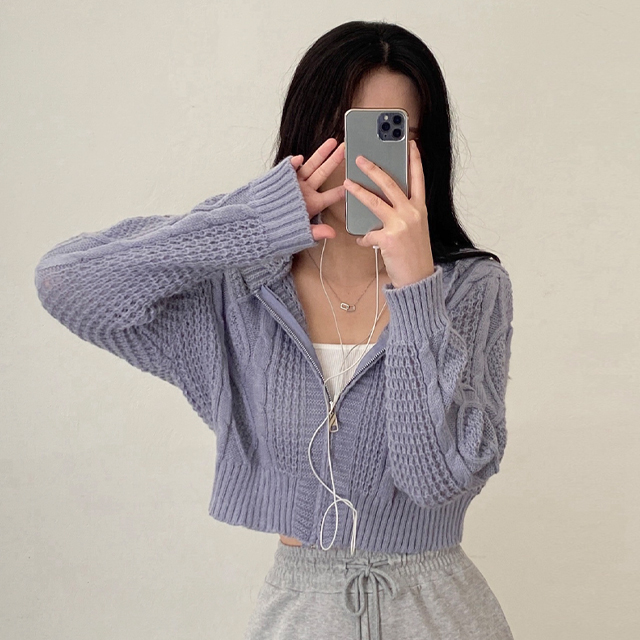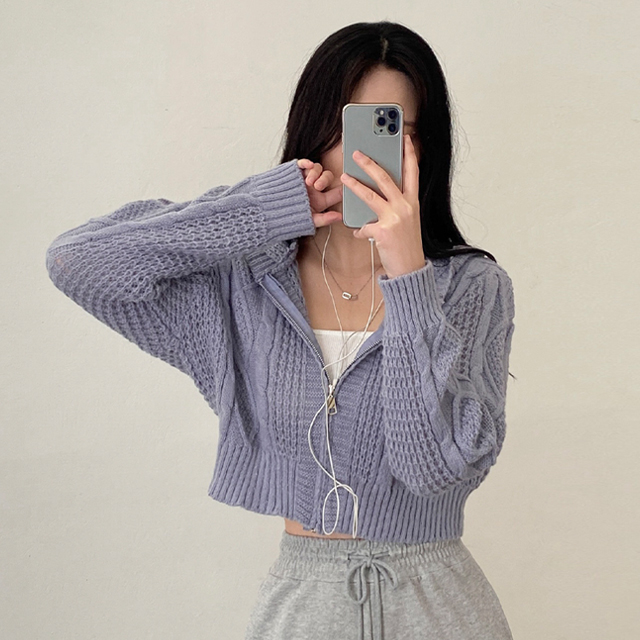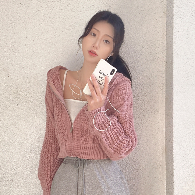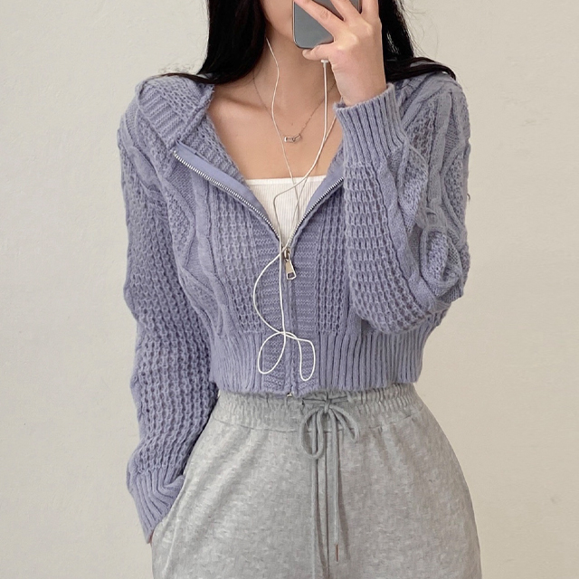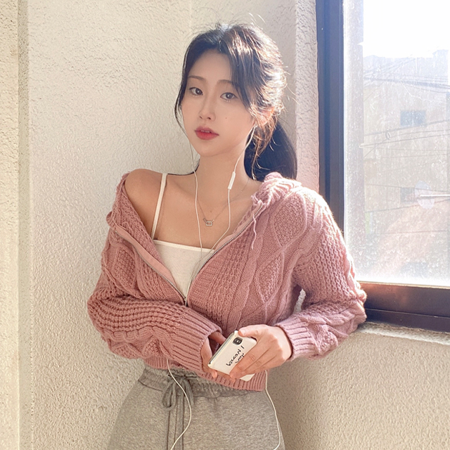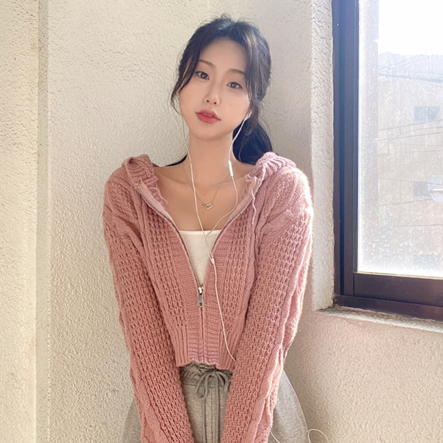 ニットパーカー長袖クロップドピンクパフツイストカーディガン