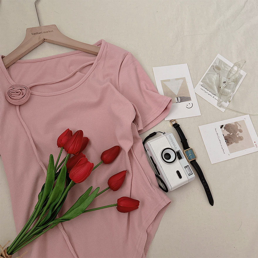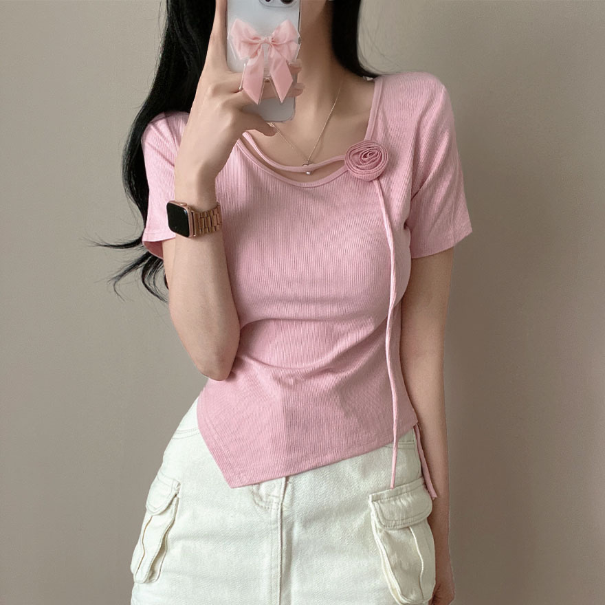 アシンメトリーシャーリングラウンドスリム無地半袖Tシャツ