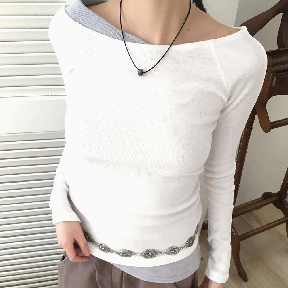 シャーリングレイヤードアシンメトリーオフショル長袖Tシャツ
