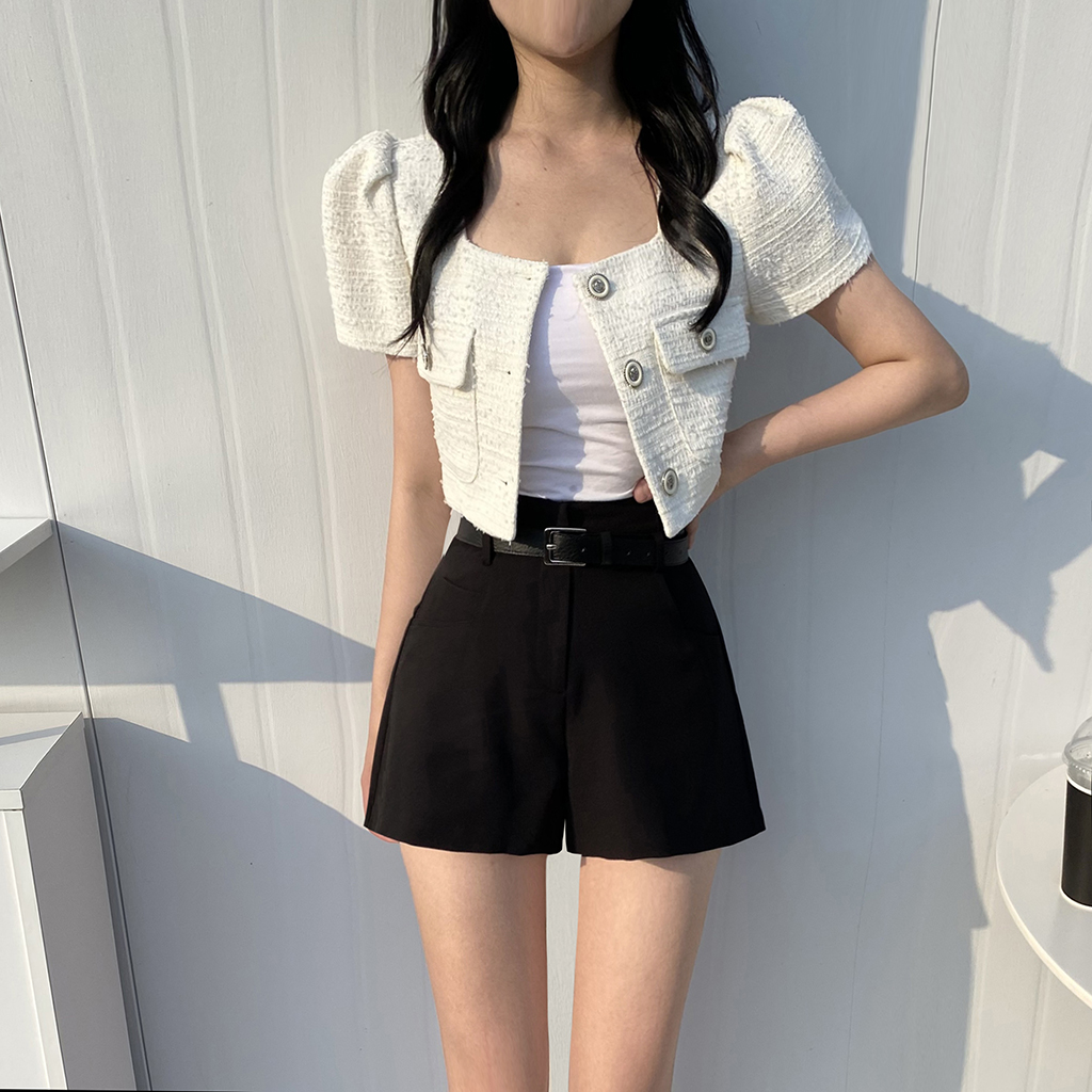 ツイードボタンポケットクロップドパフ半袖ジャケット