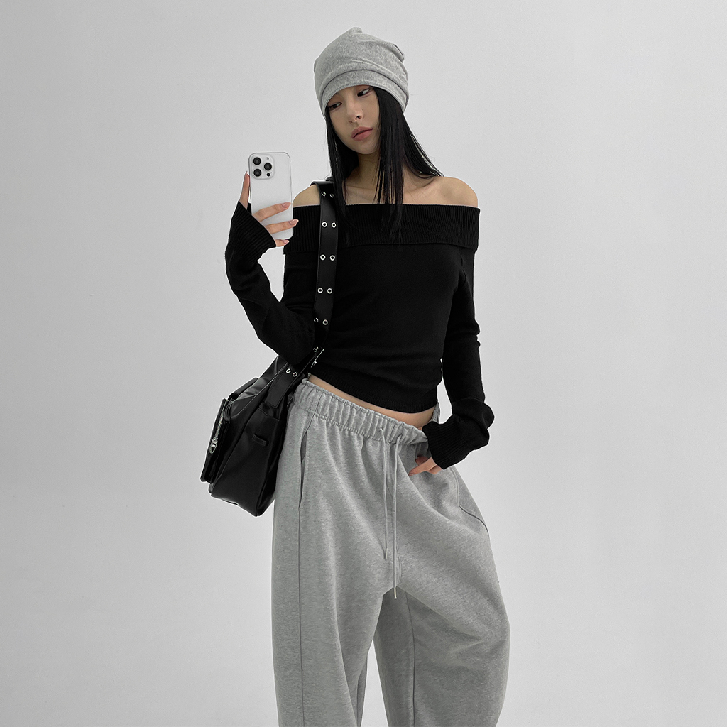 [original]ウィーゼルセミクロップオフショルダーニット