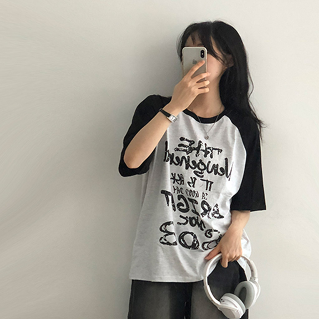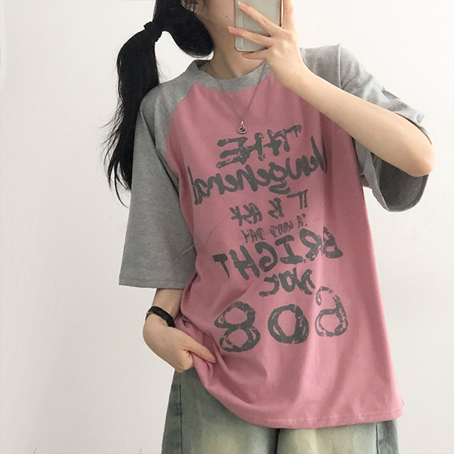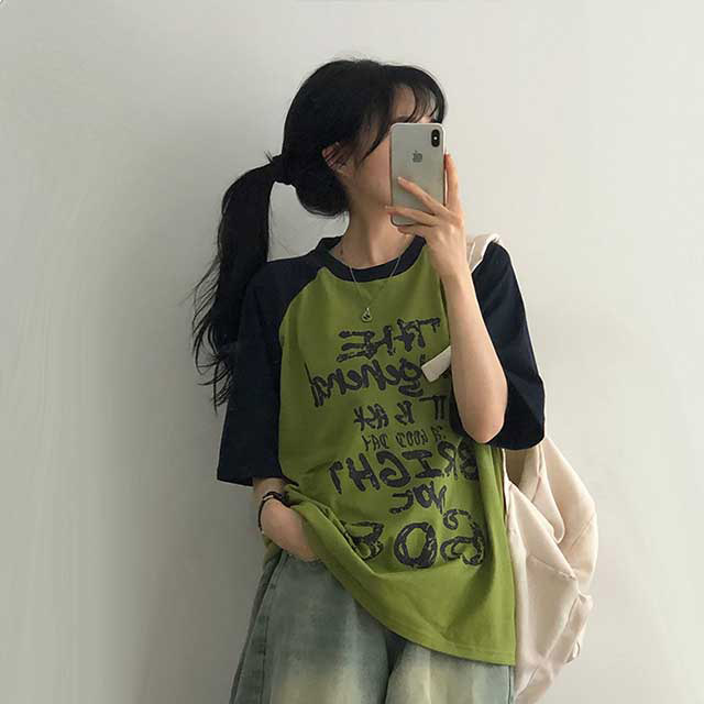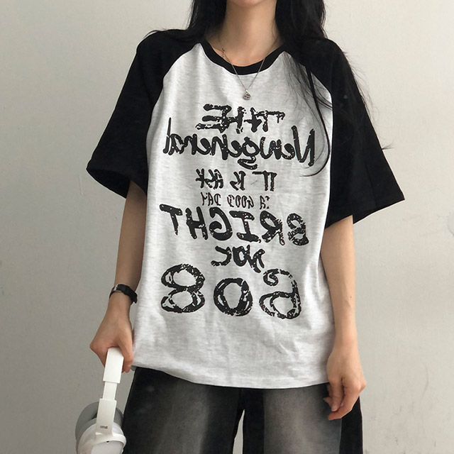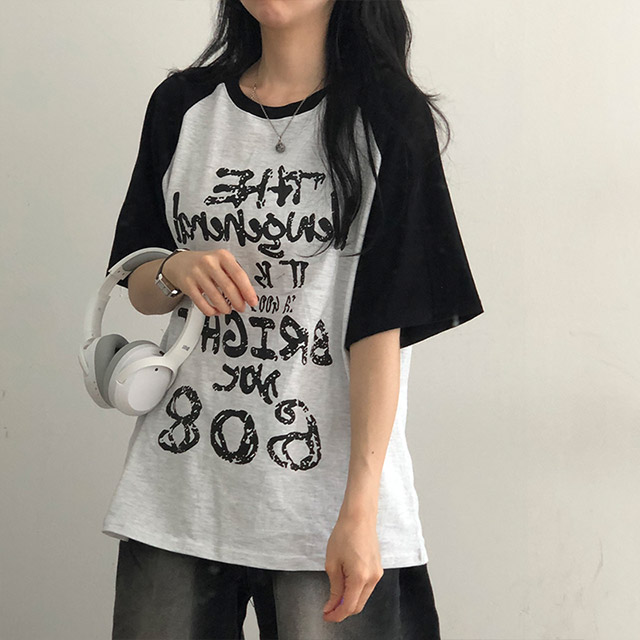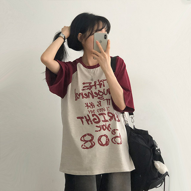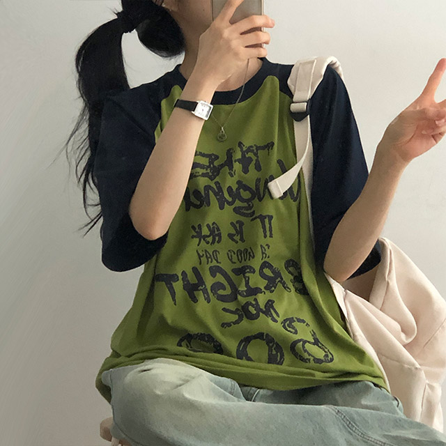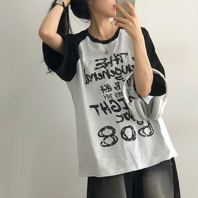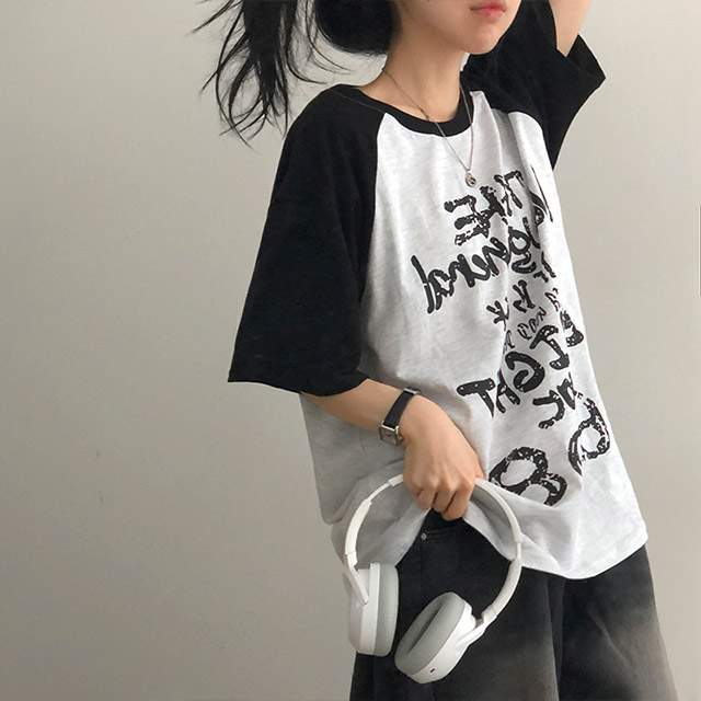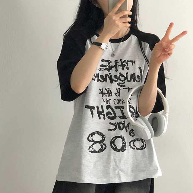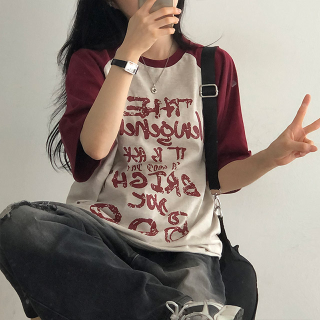 ストリートバイカラーラグランレタリング半袖Tシャツ