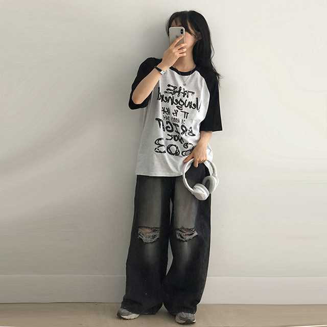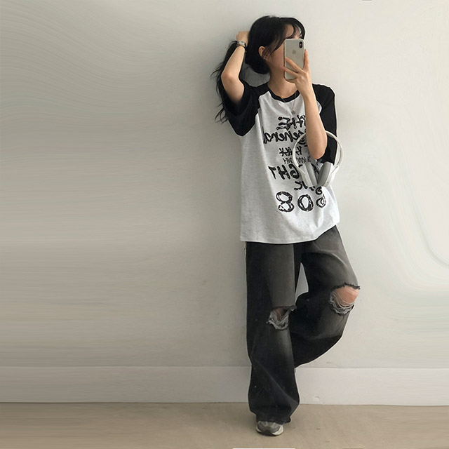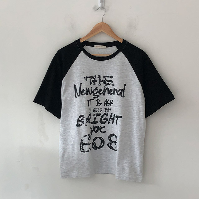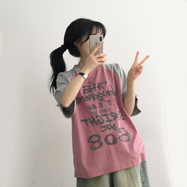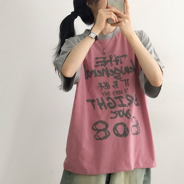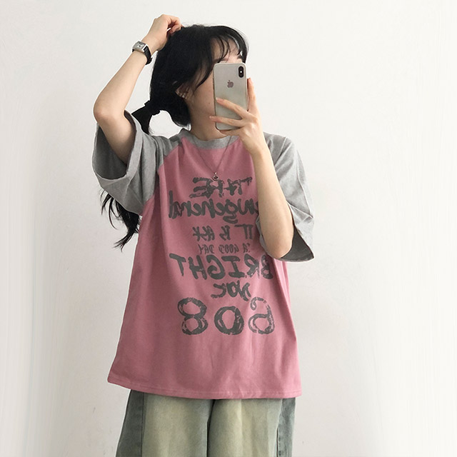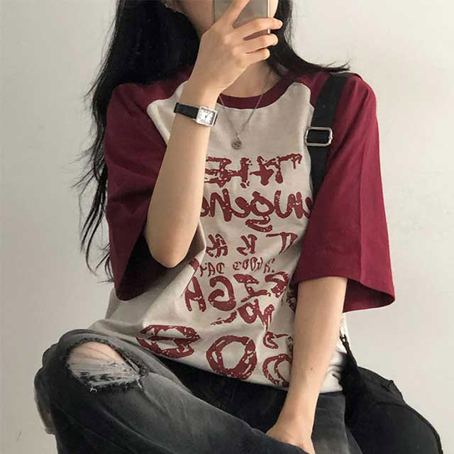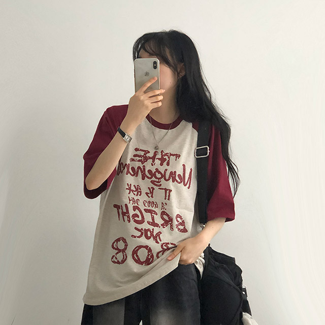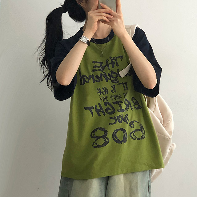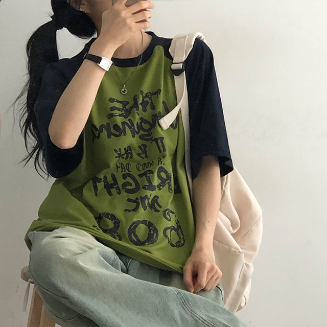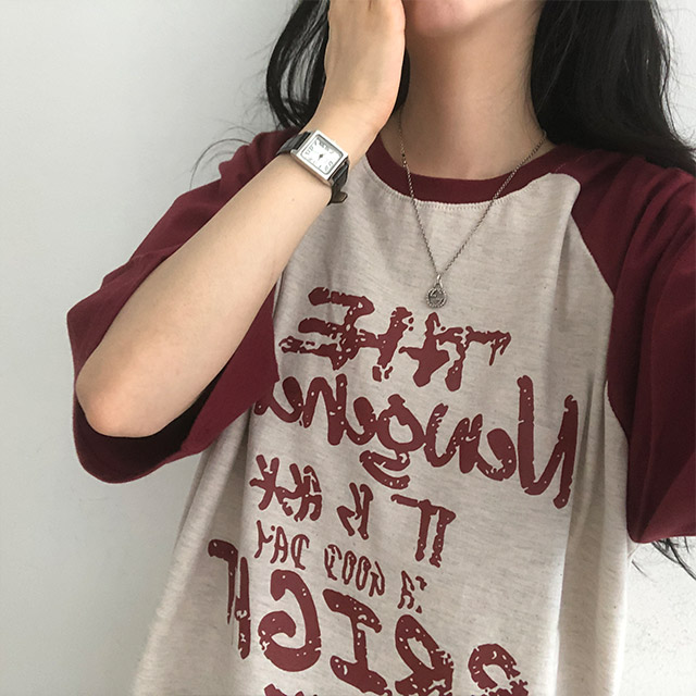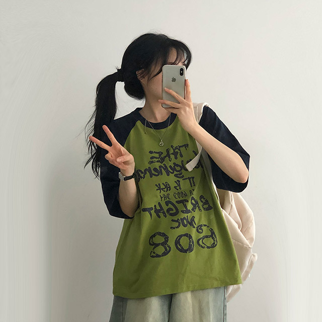 ストリートバイカラーラグランレタリング半袖Tシャツ