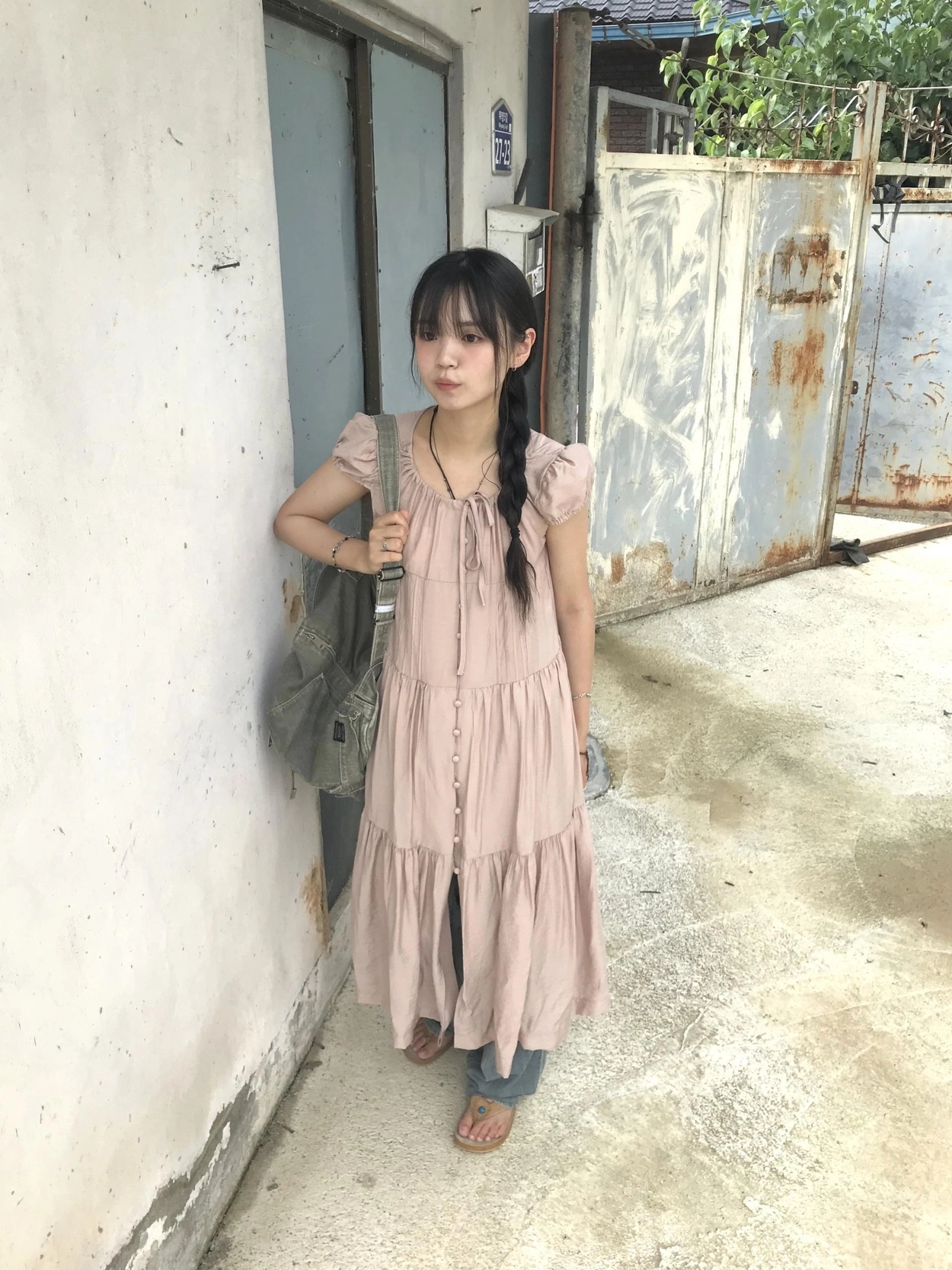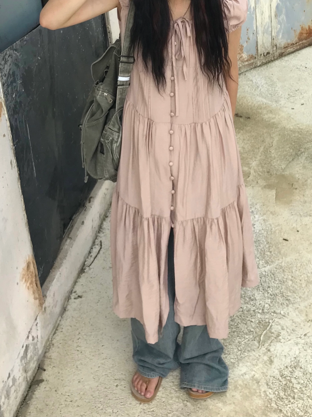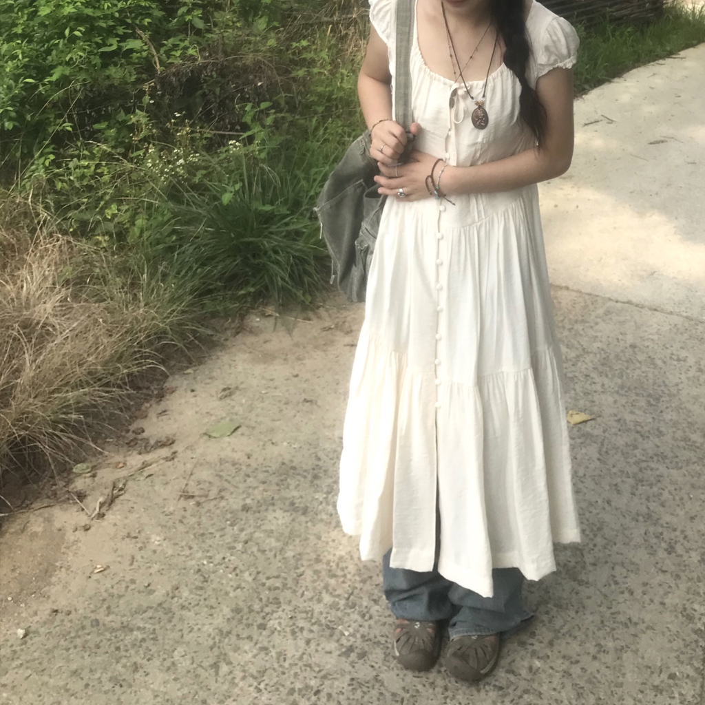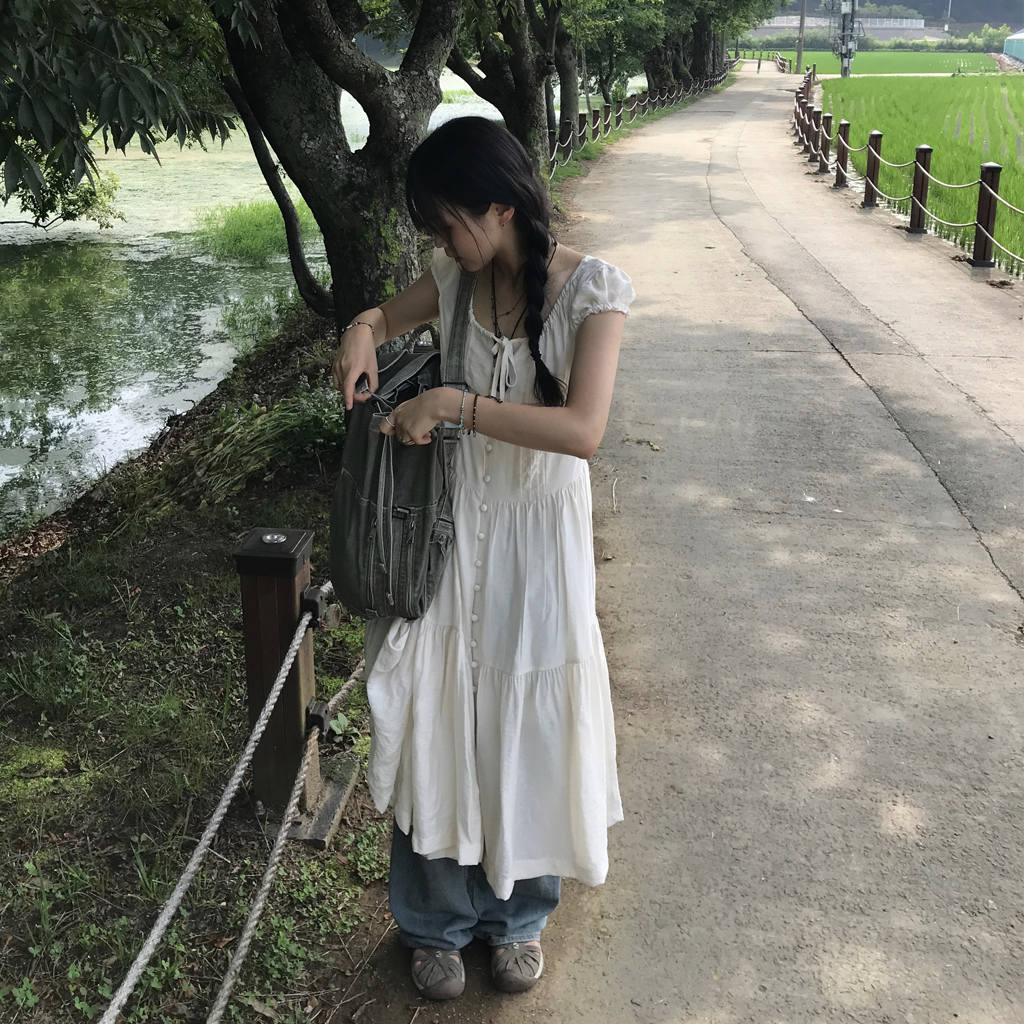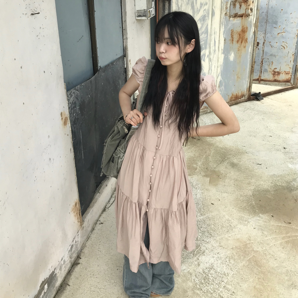 リボン半袖ロングワンピース