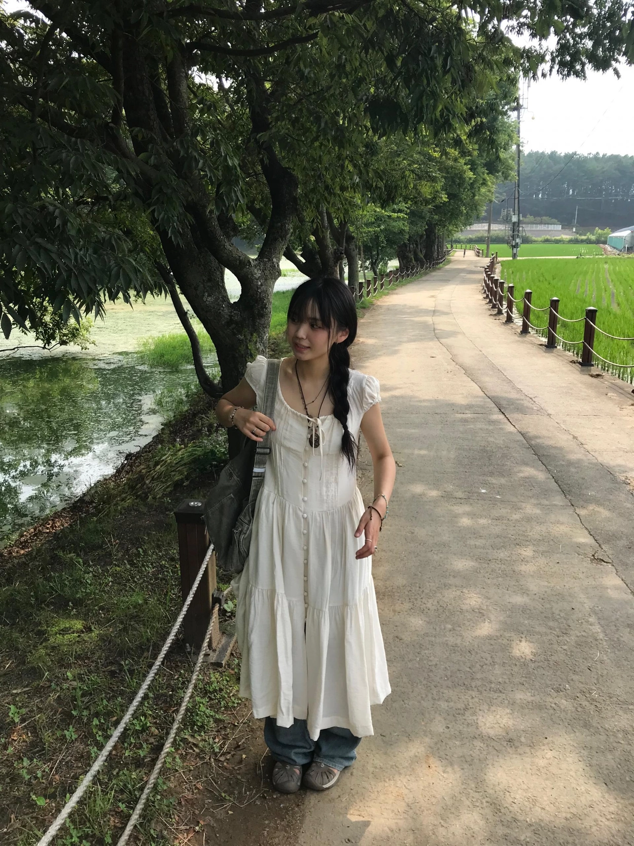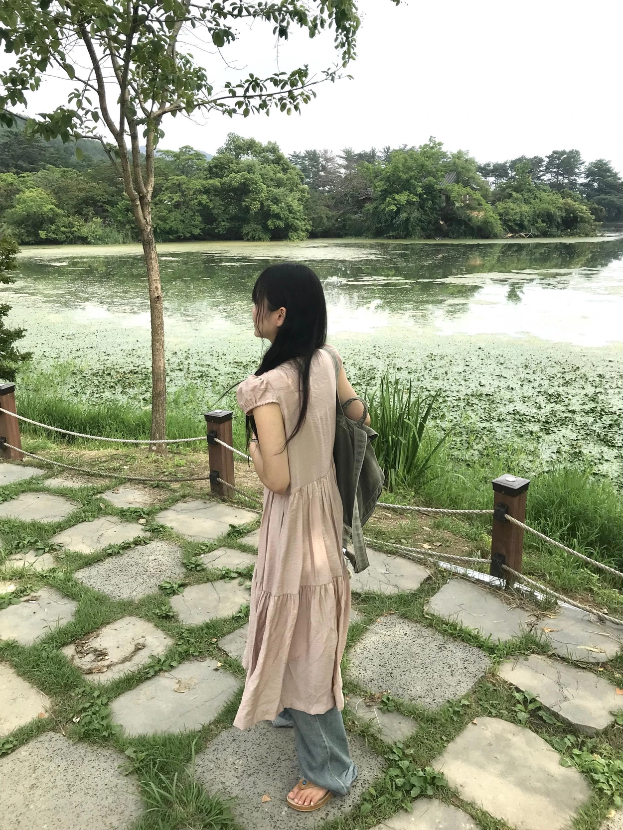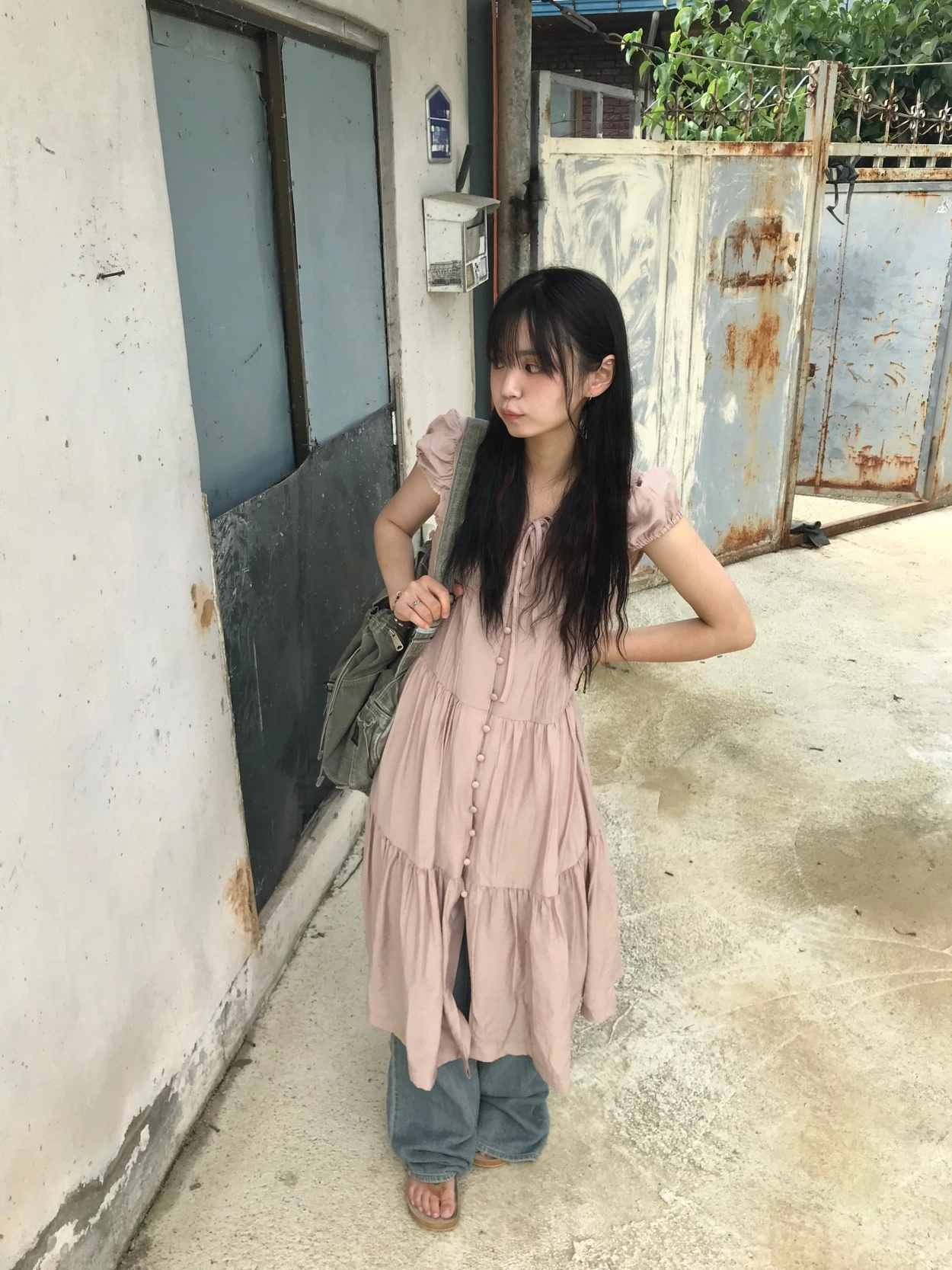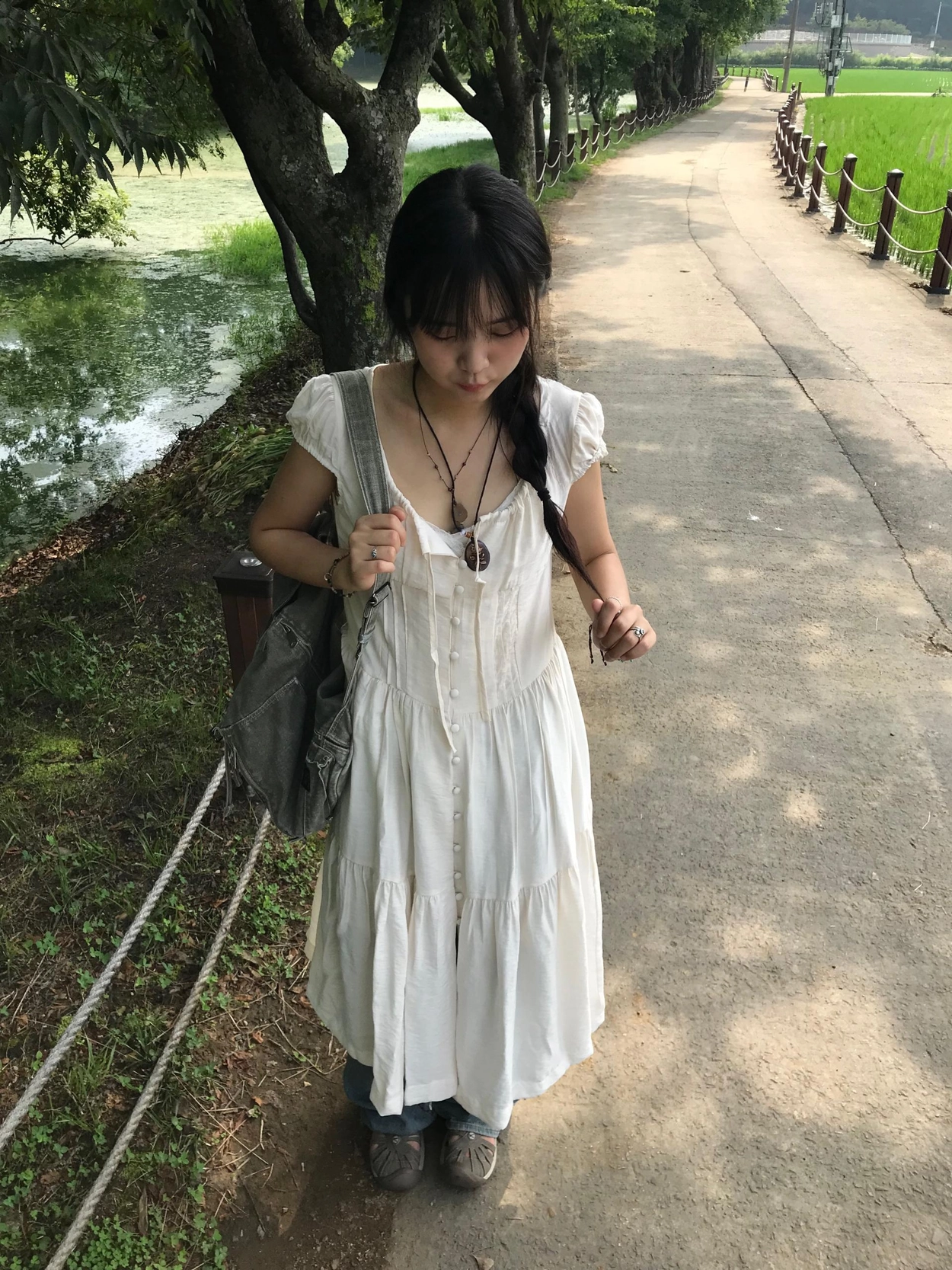 リボン半袖ロングワンピース