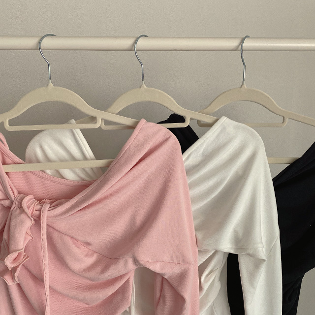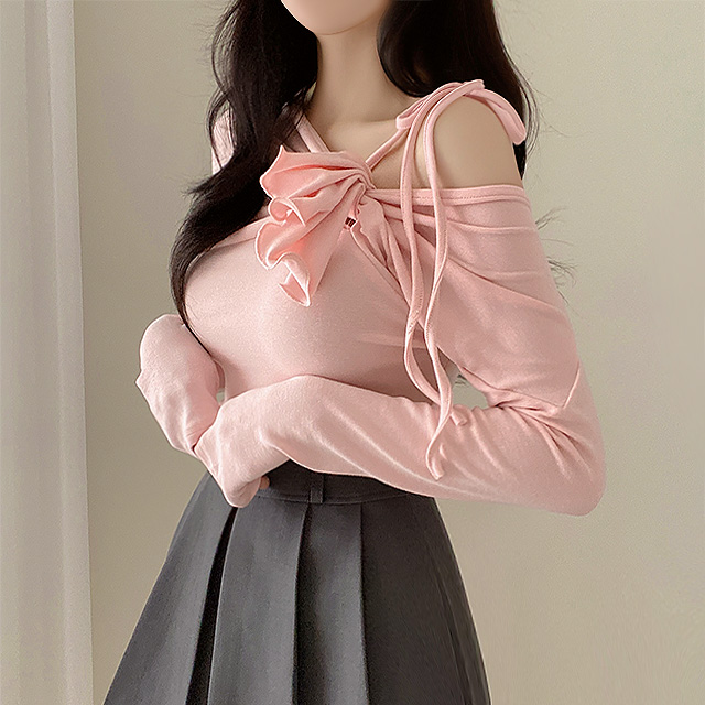 (3col)ラブリーアシンメトリーオフショルリボンシャーリングスリム長袖Tシャツ