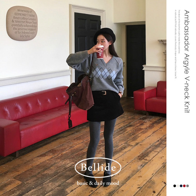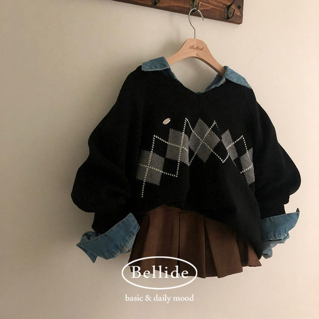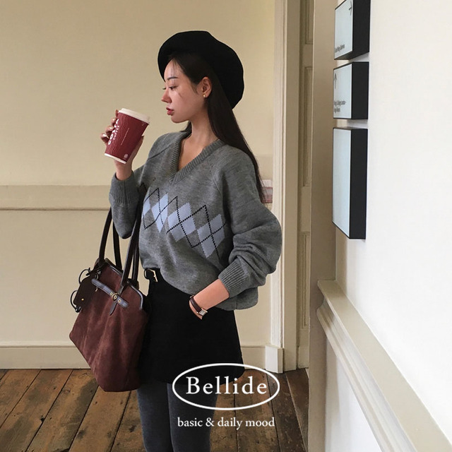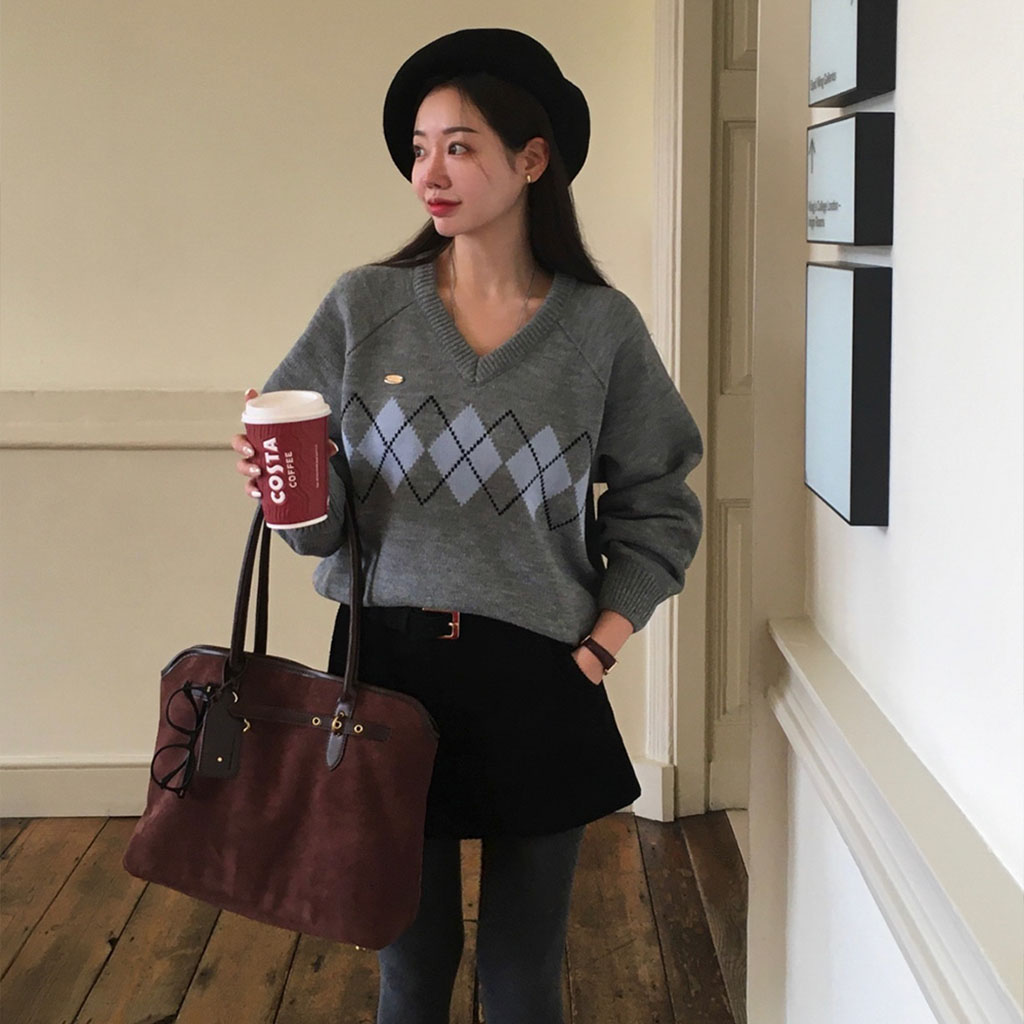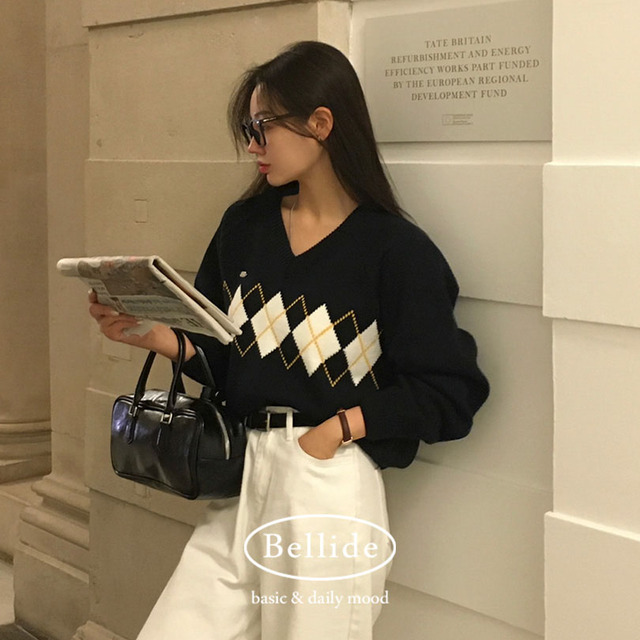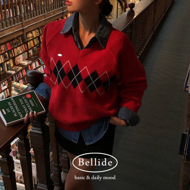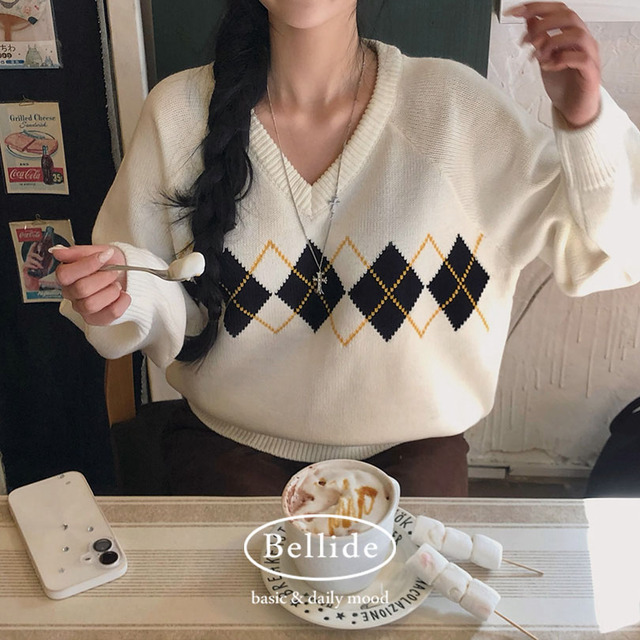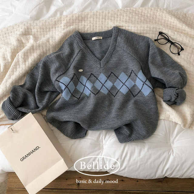 (ORIGINAL) ルーズフィット、アーガイルVネックニット