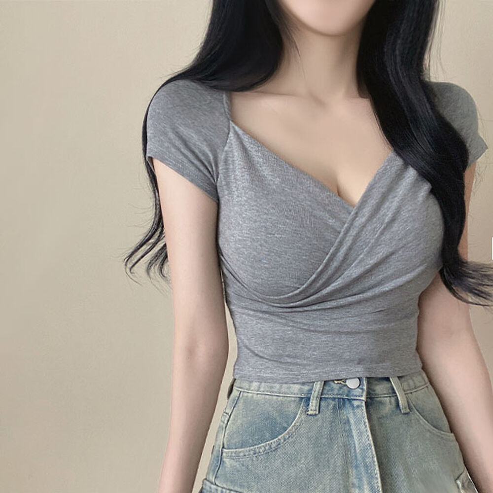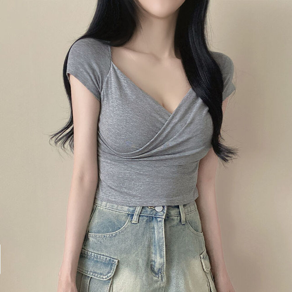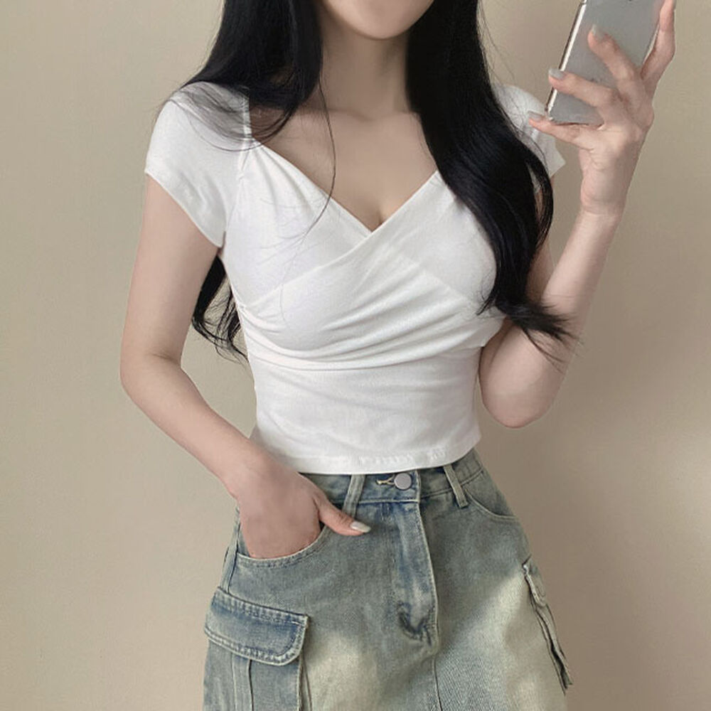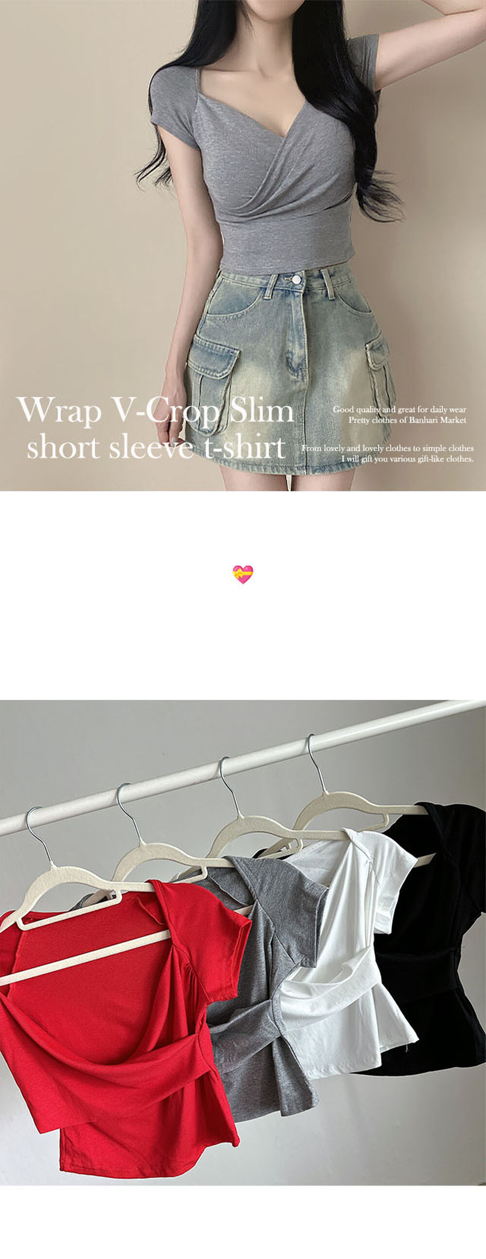 ラップクロップドVネックスリム無地半袖Tシャツ