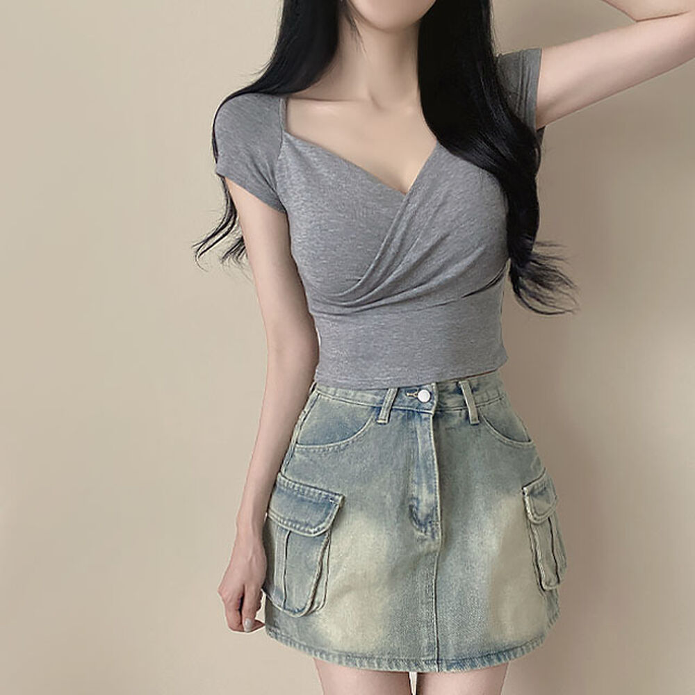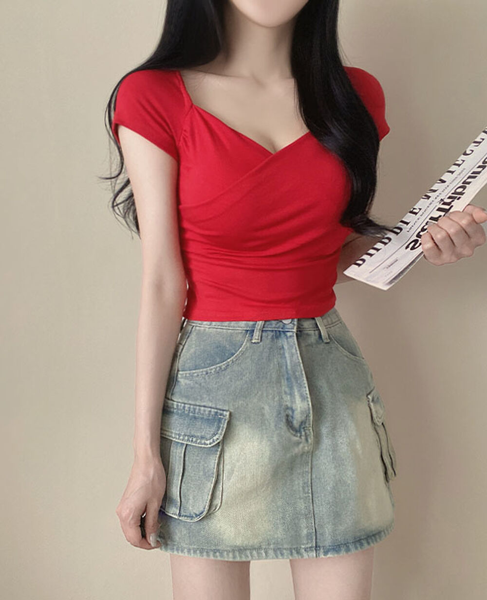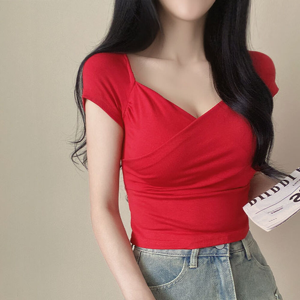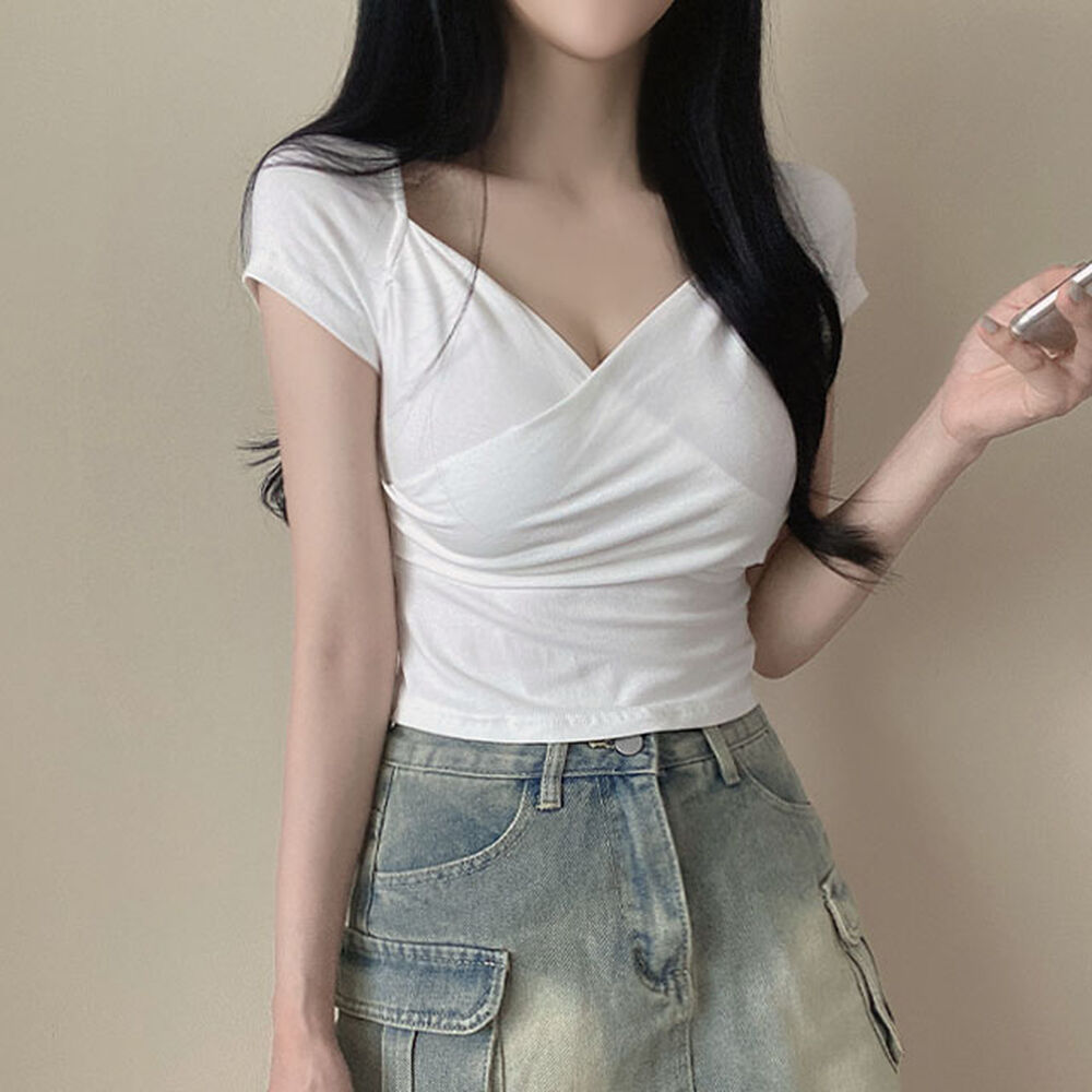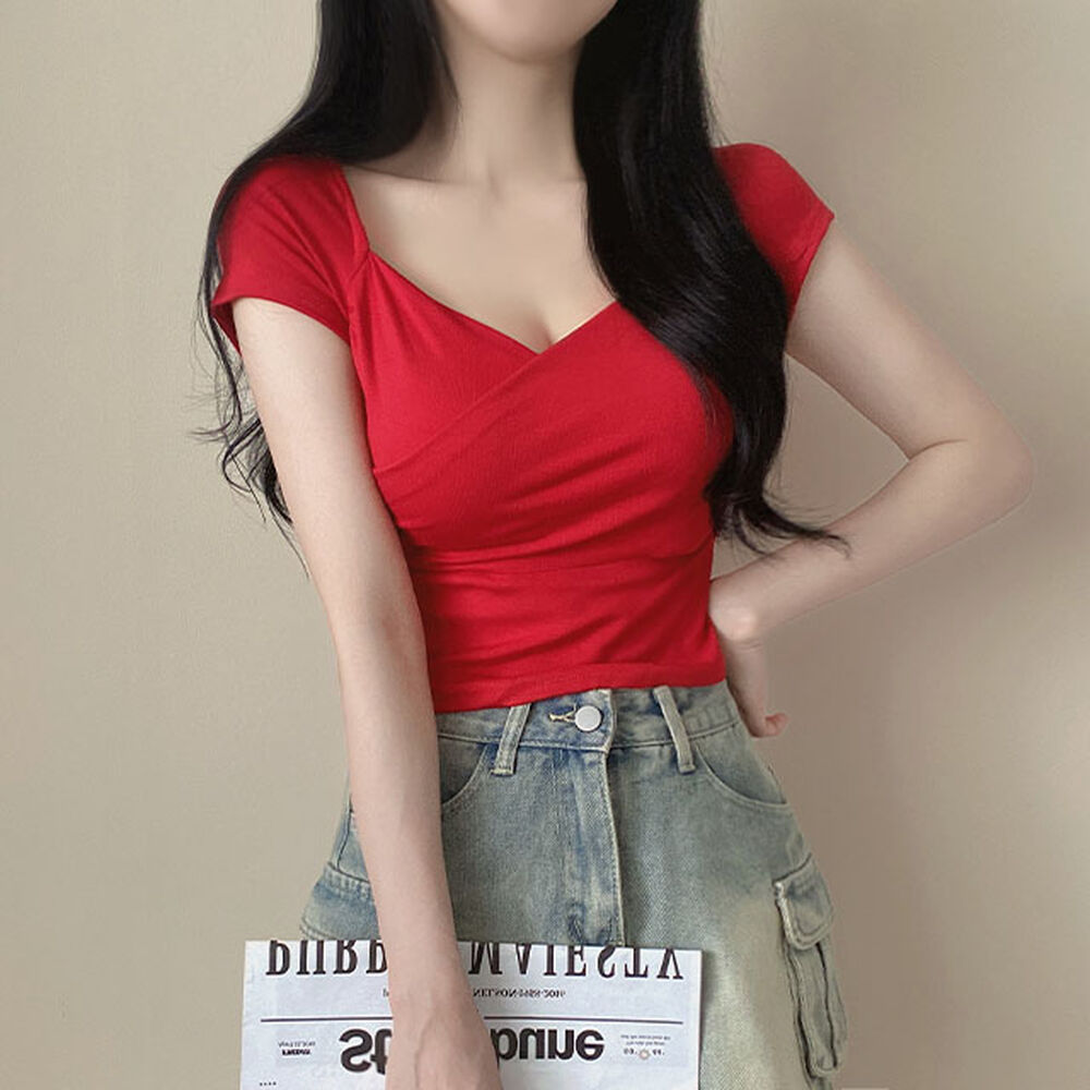 ラップクロップドVネックスリム無地半袖Tシャツ