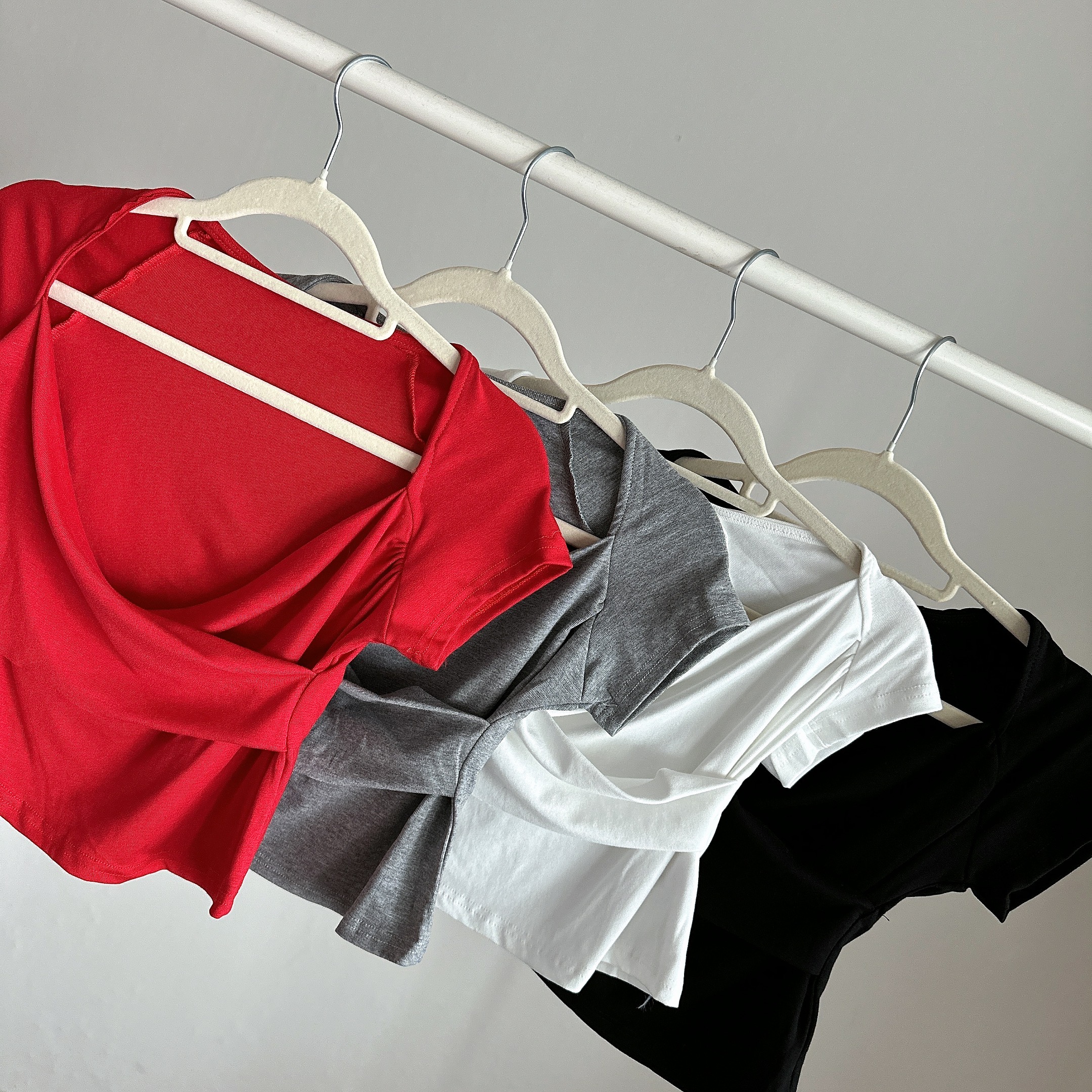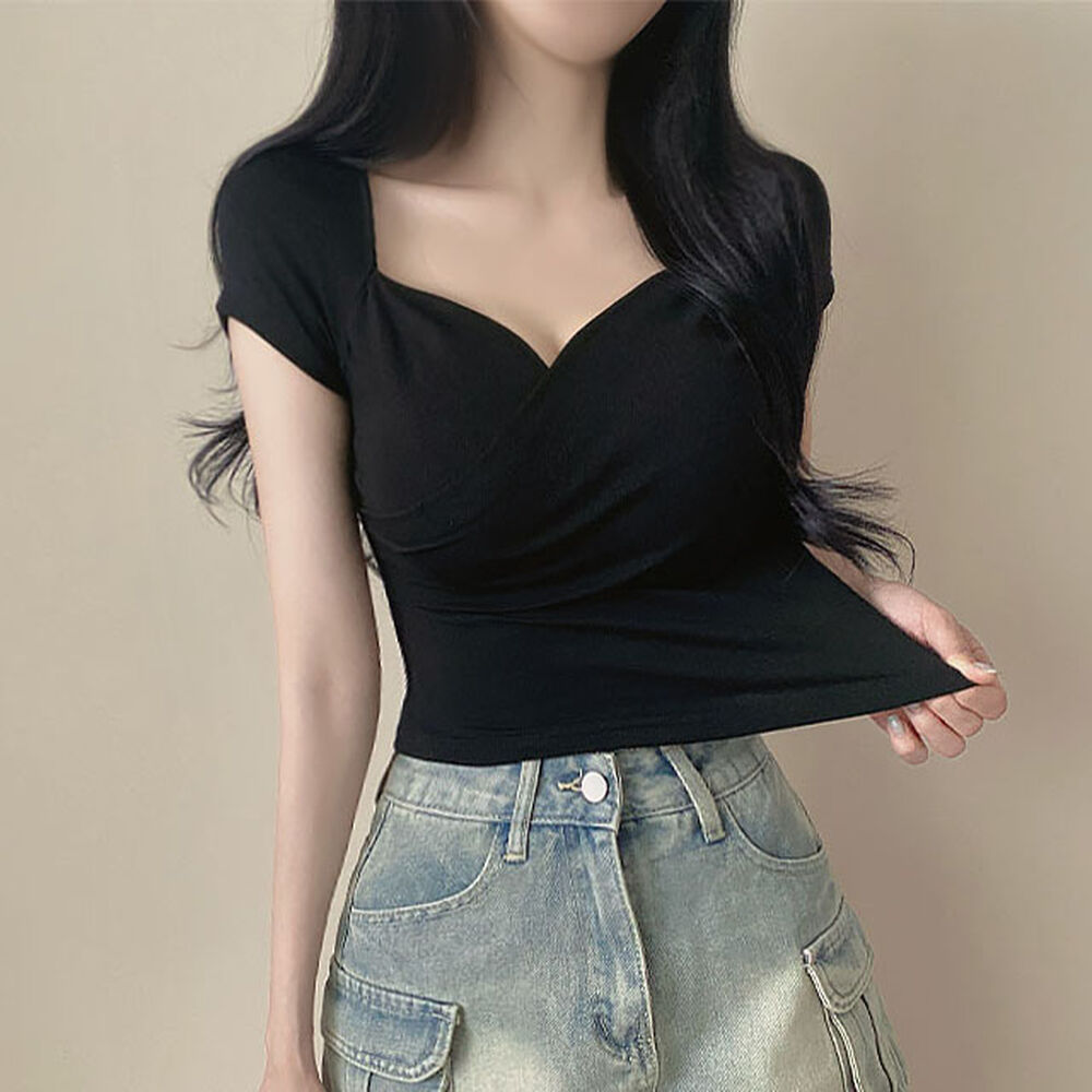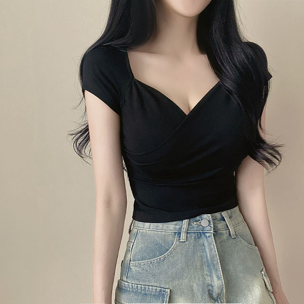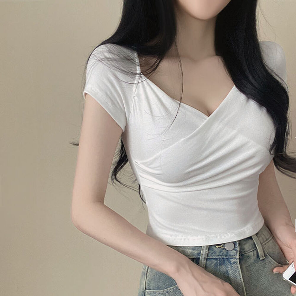 ラップクロップドVネックスリム無地半袖Tシャツ