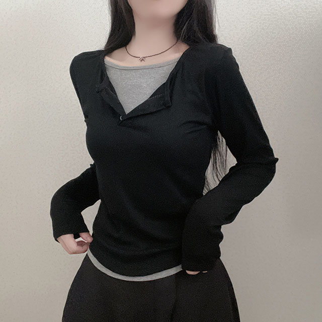 ボタンシャーリングクロップドリブ長袖Tシャツ