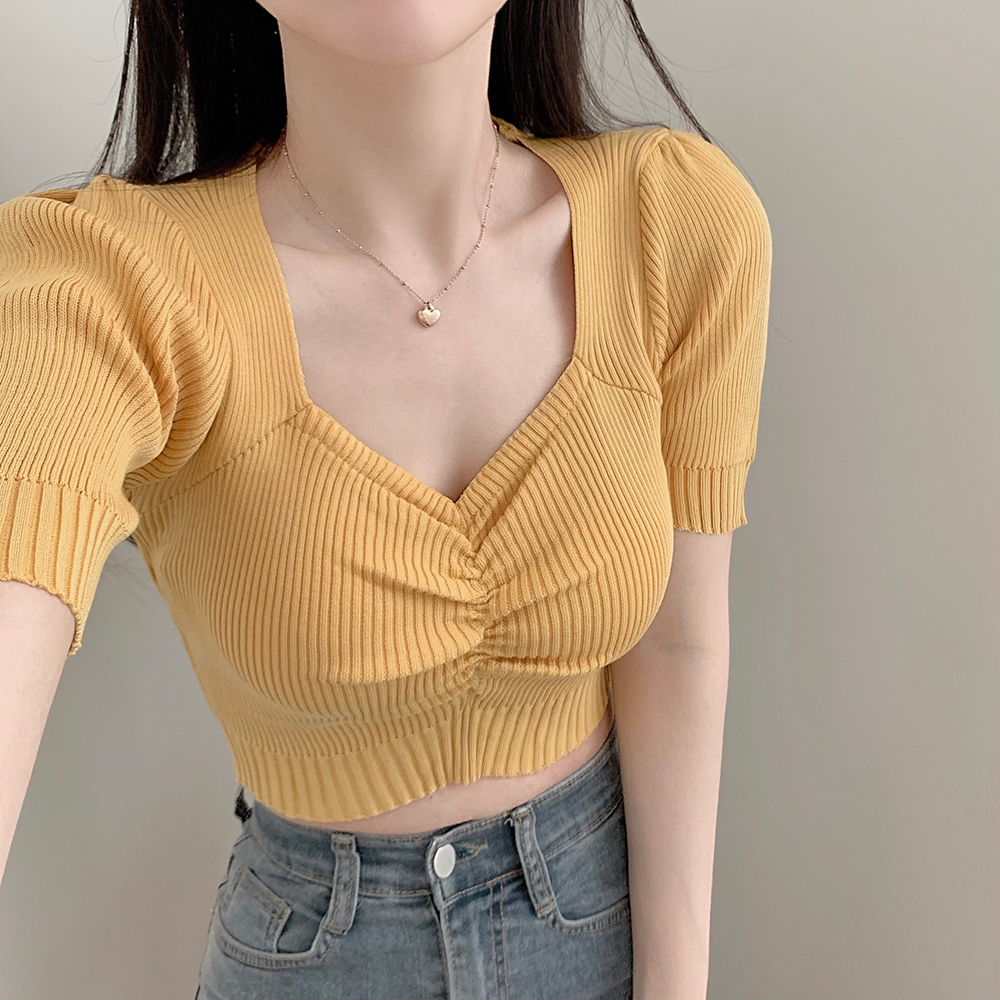 シャーリングクロップド半袖ニットTシャツ(6color)