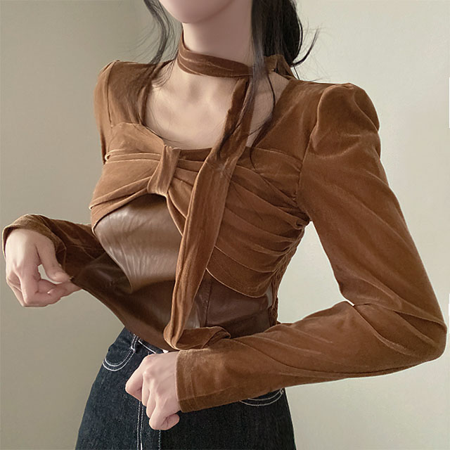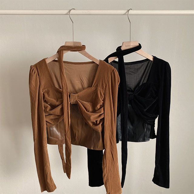 [マフラーSET] ベロアリボンクロップドシャーリングブラウス