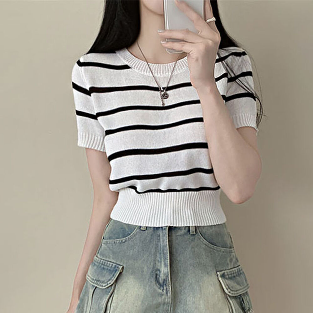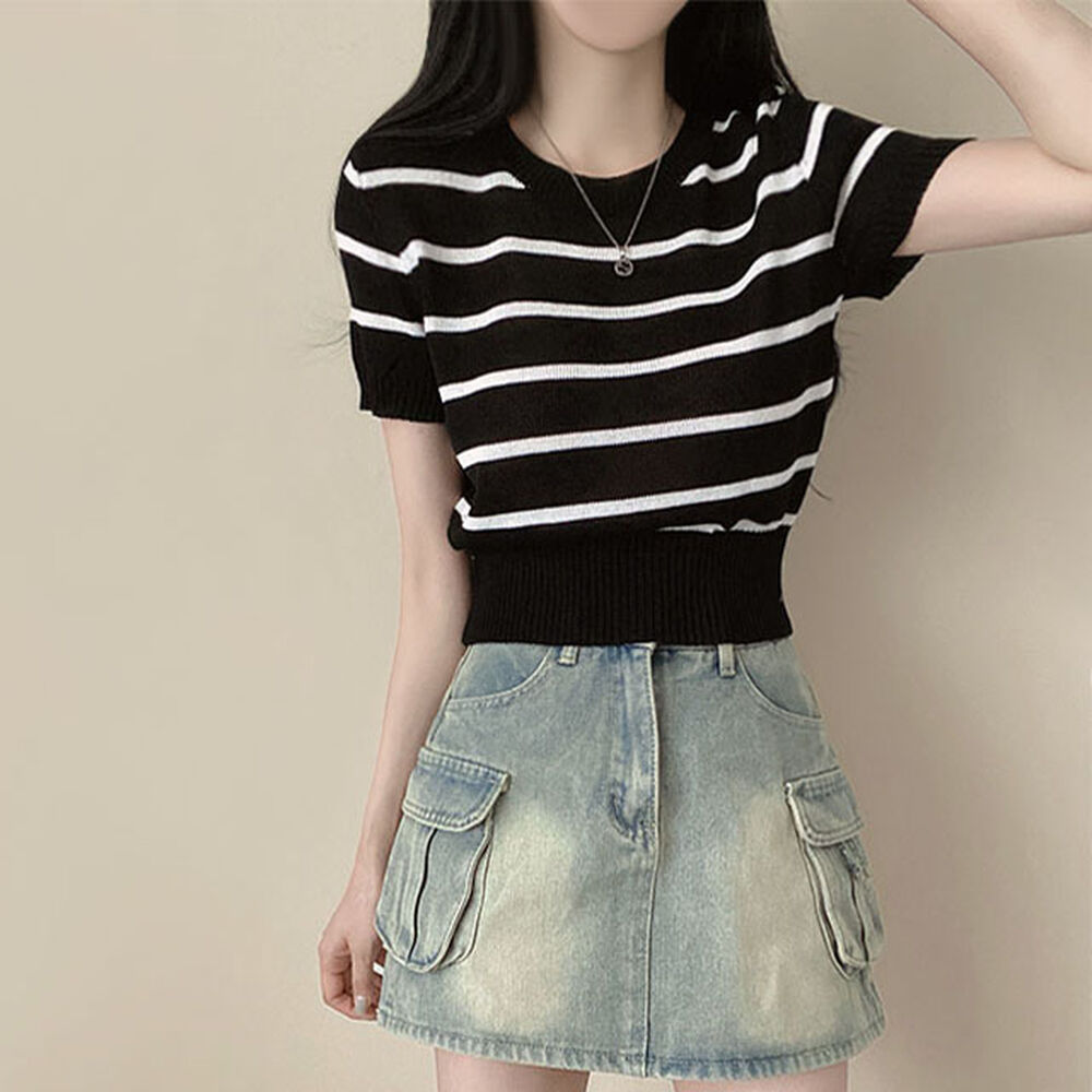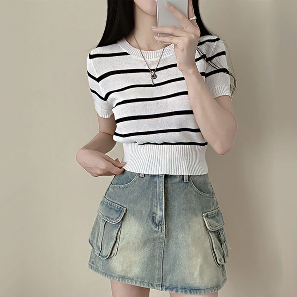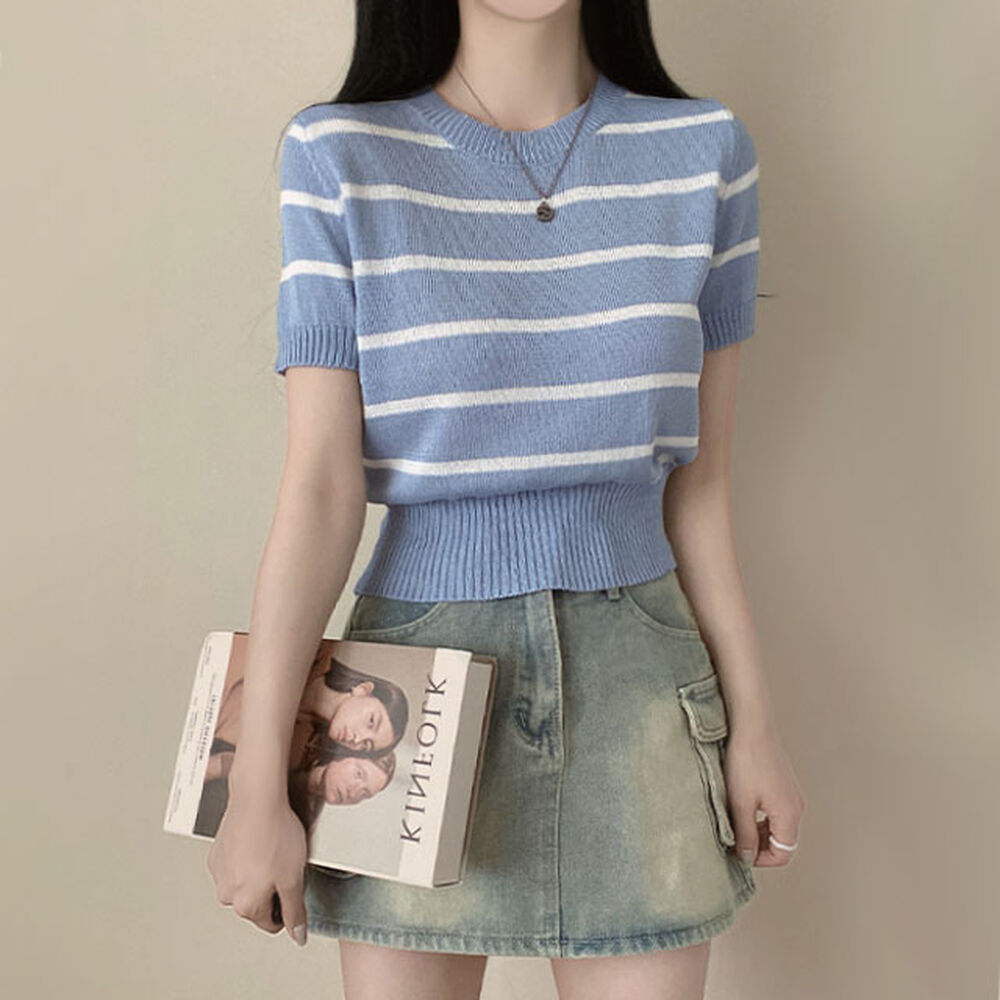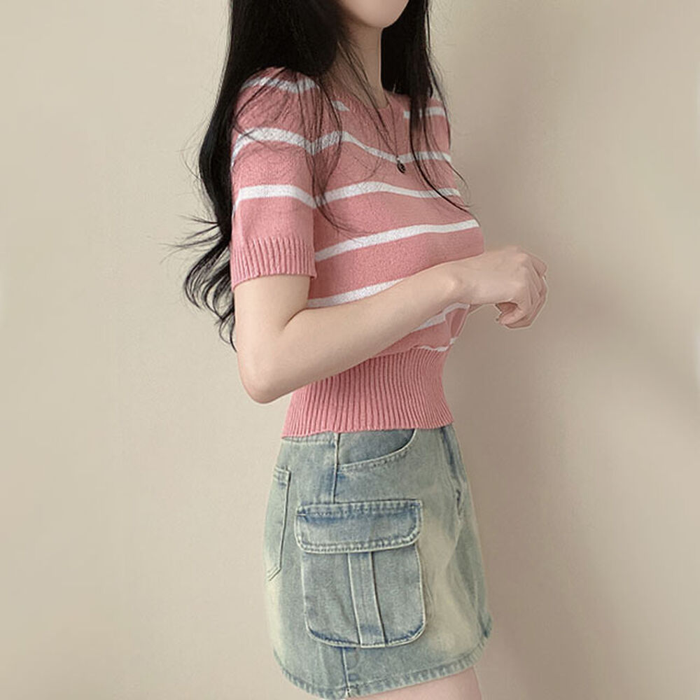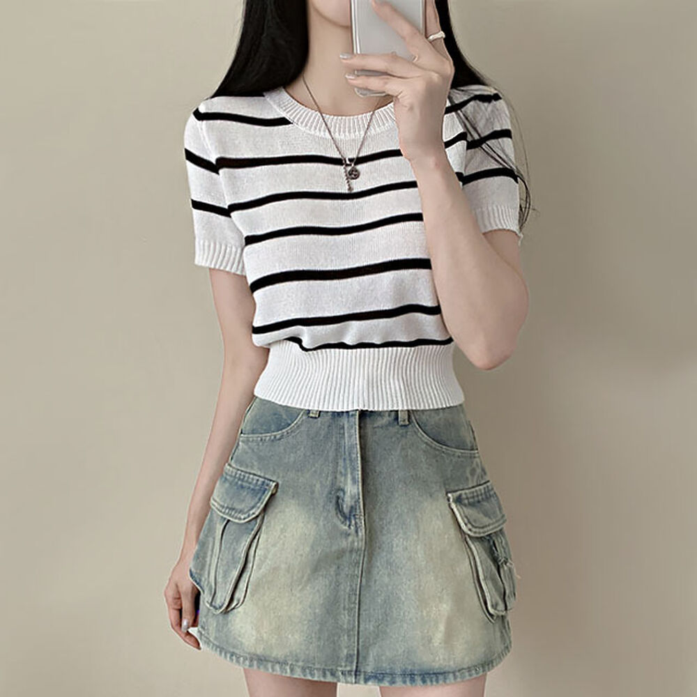 バイカラーストライプクロップドラウンドネック半袖サマーニットTシャツ