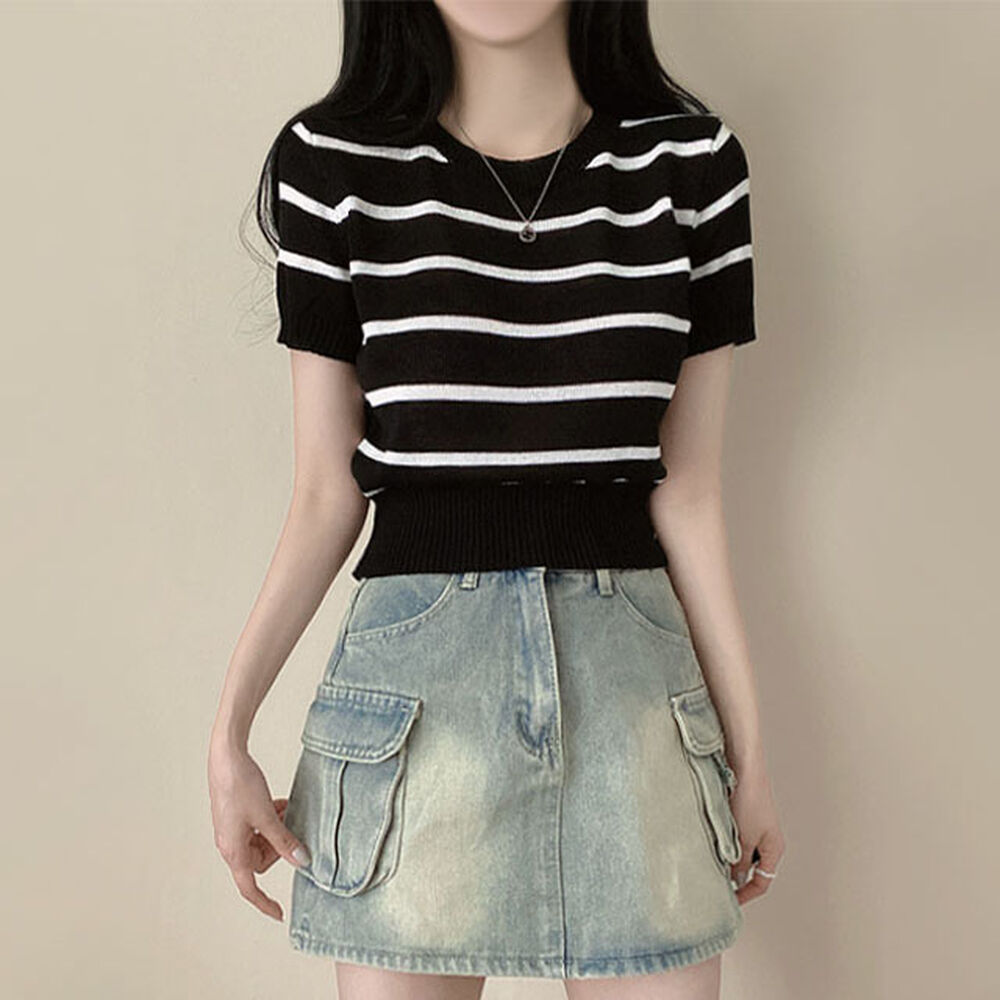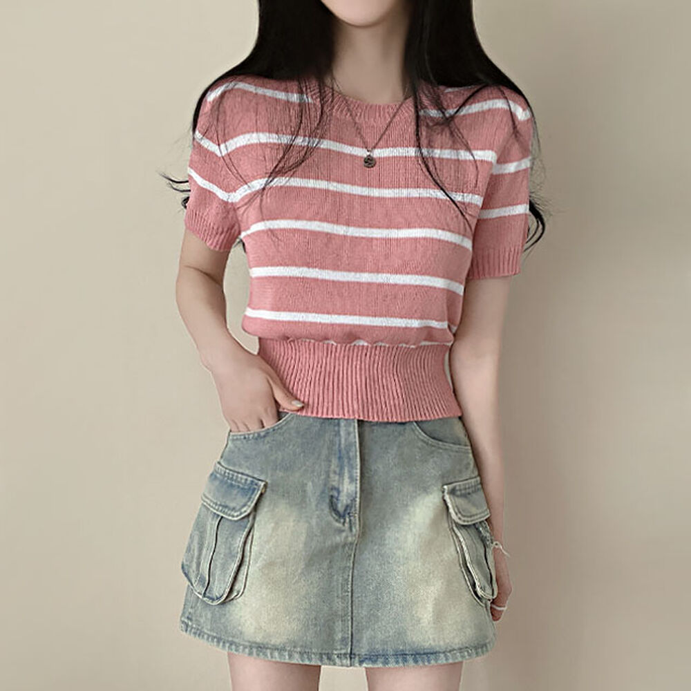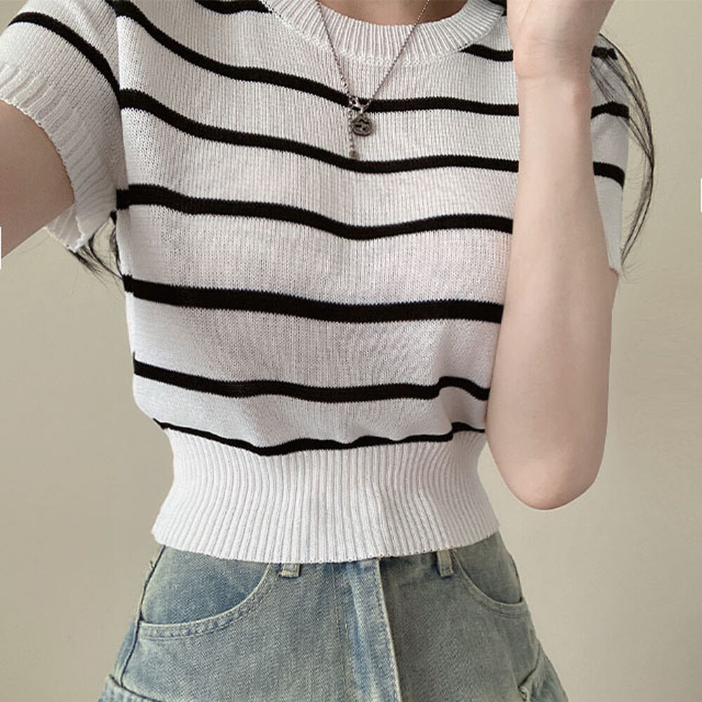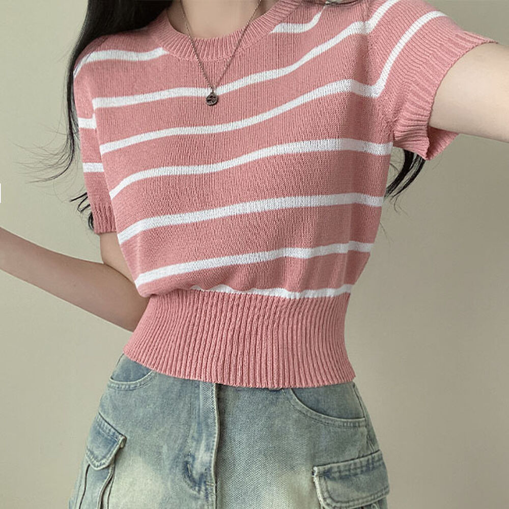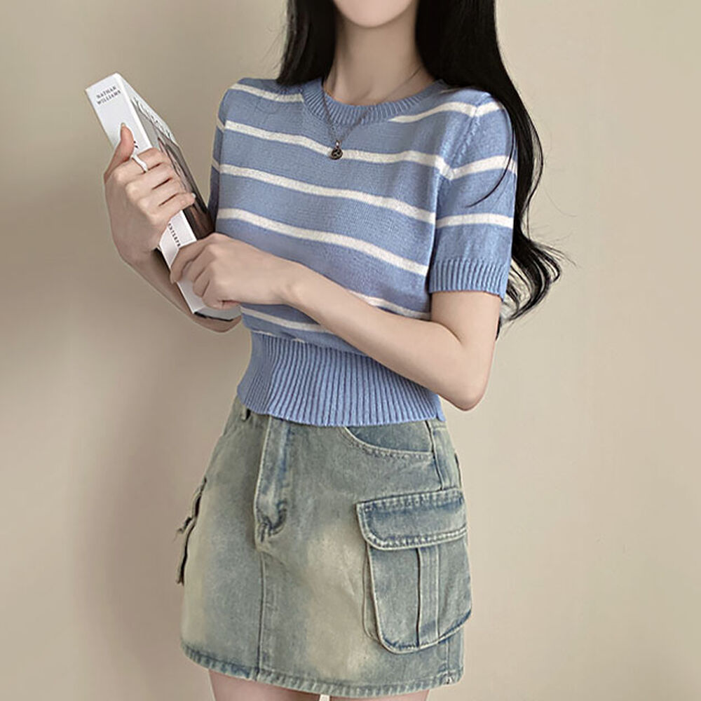 バイカラーストライプクロップドラウンドネック半袖サマーニットTシャツ