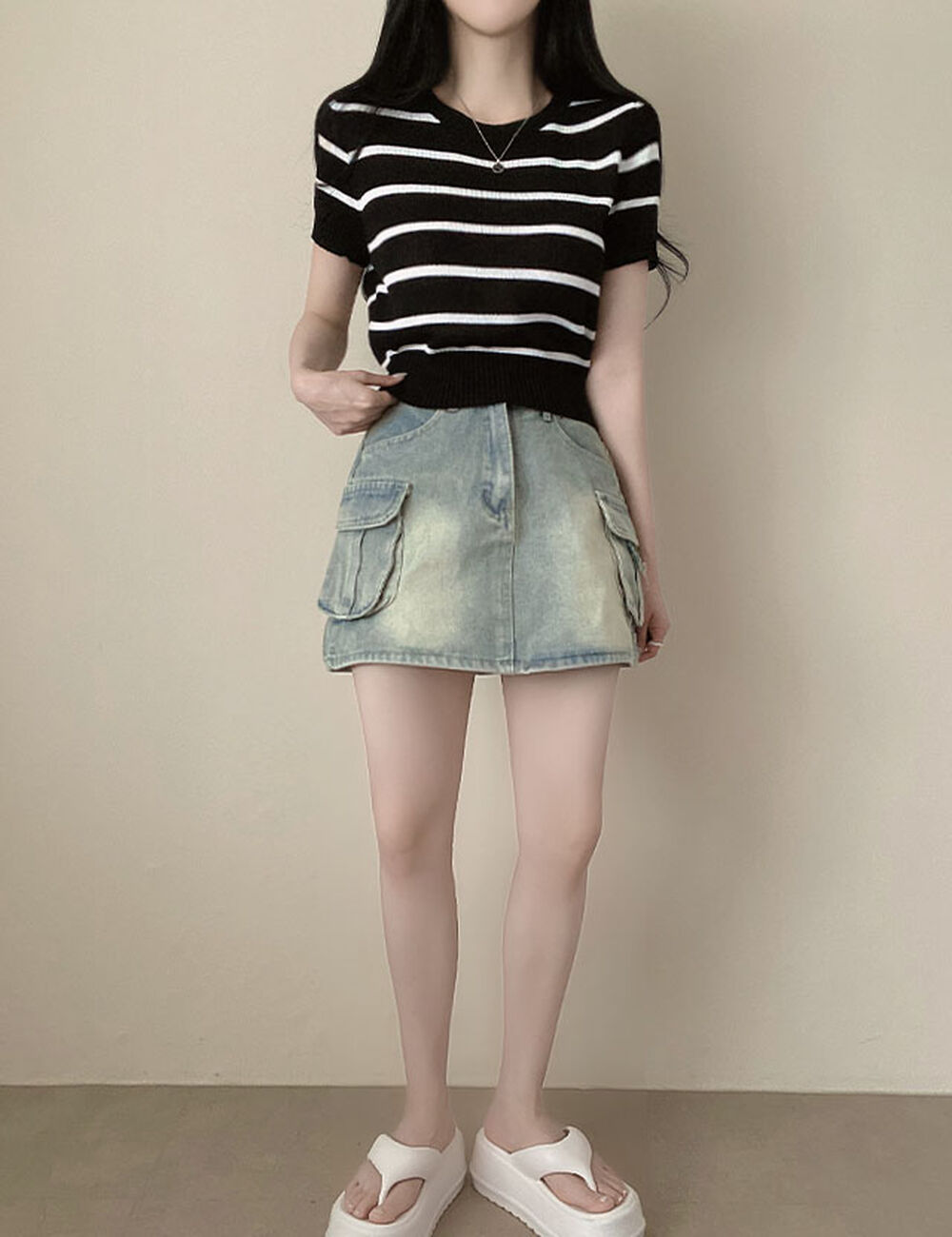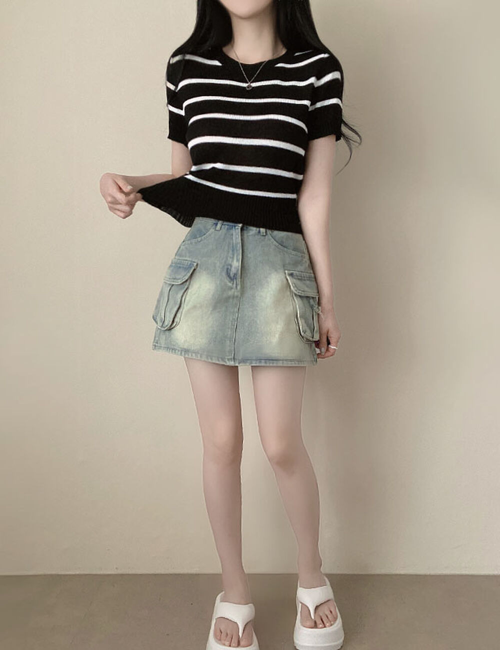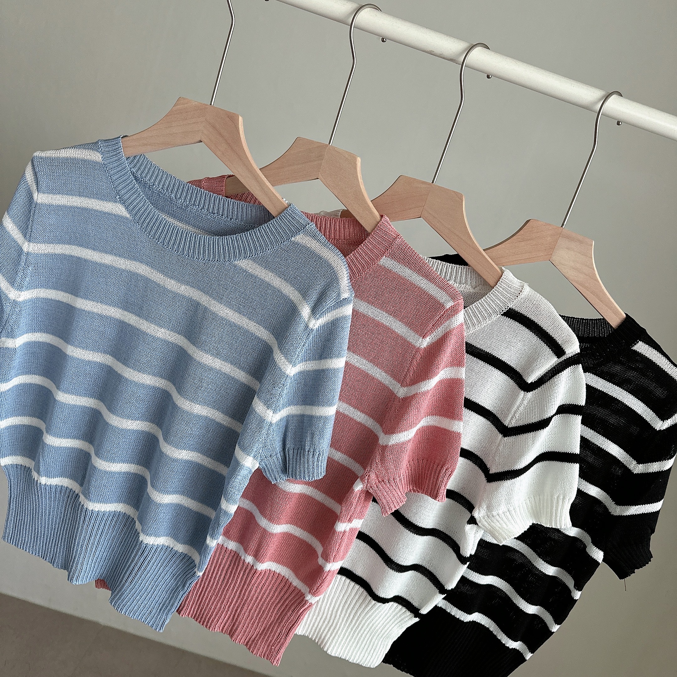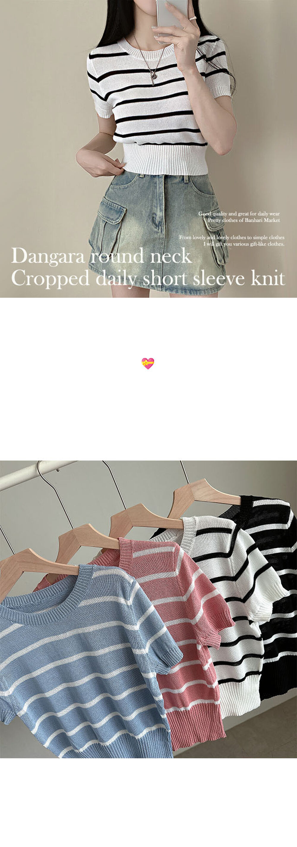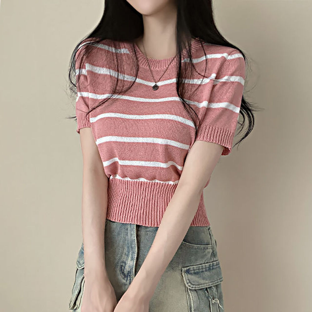 バイカラーストライプクロップドラウンドネック半袖サマーニットTシャツ