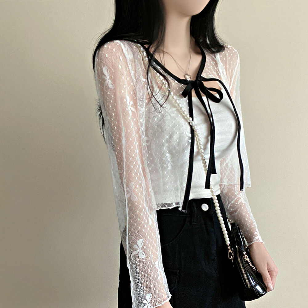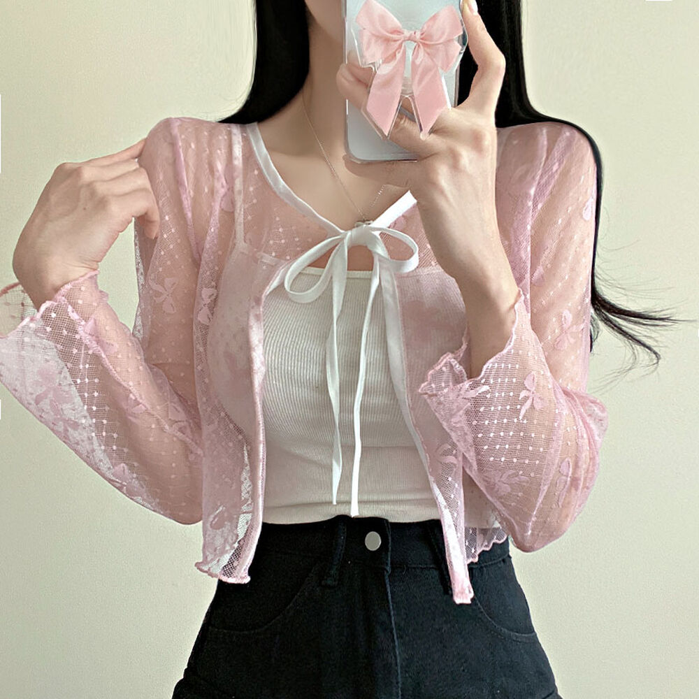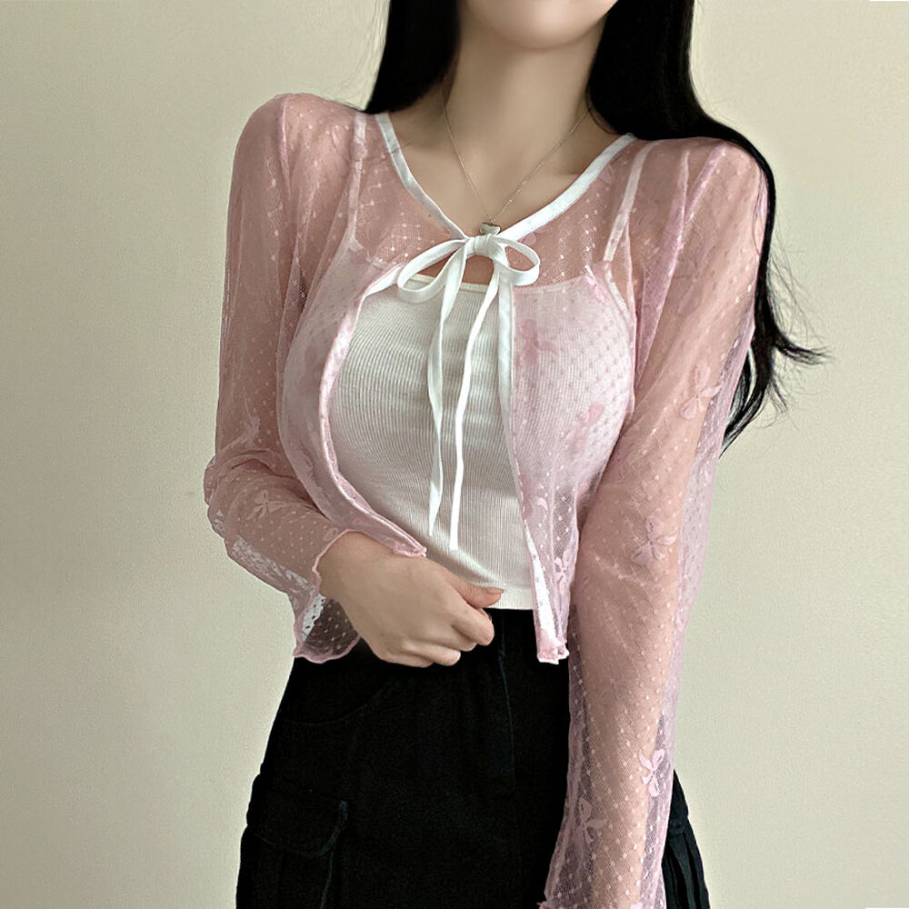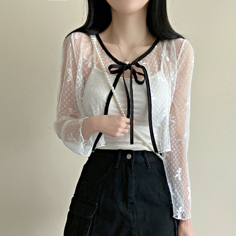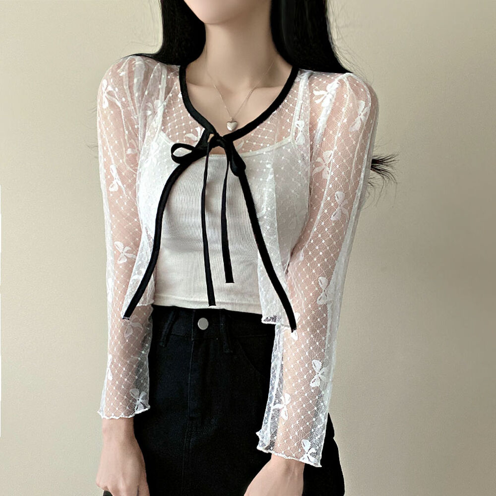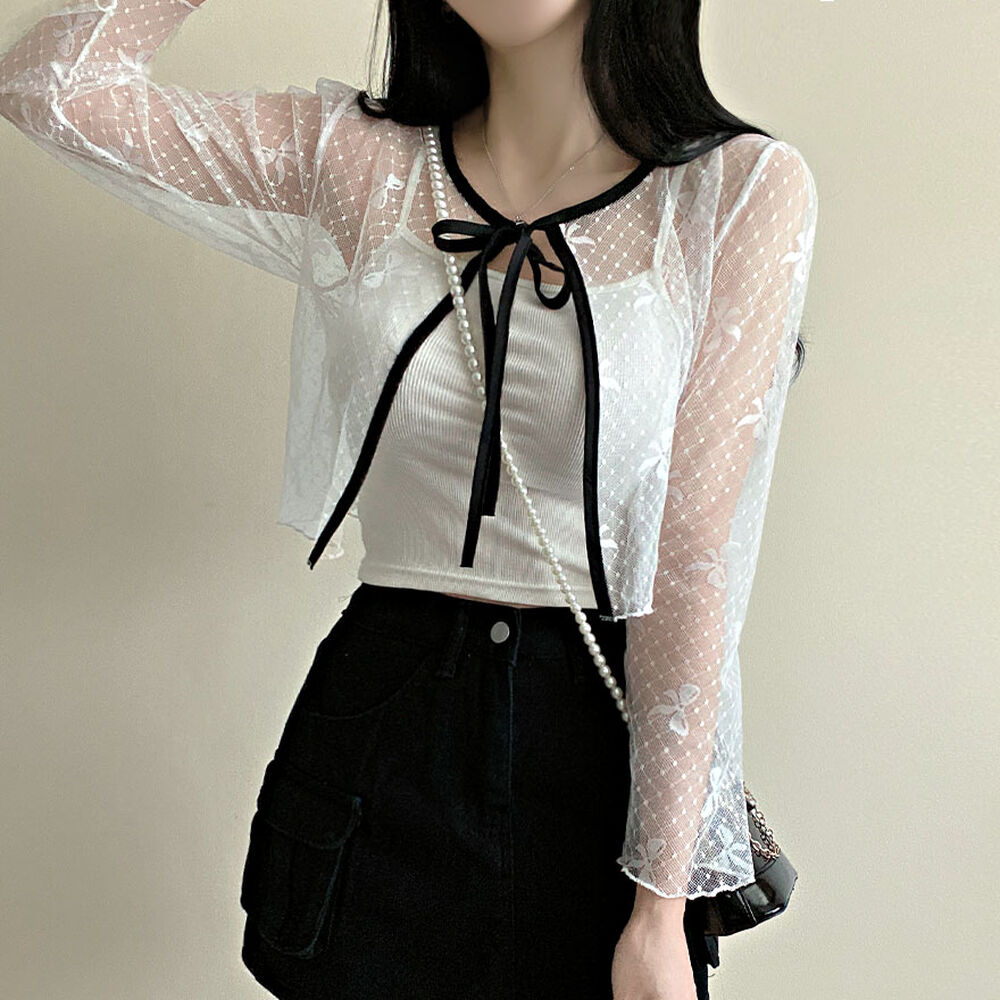 バイカラーリボンチュールシースルークロップド長袖カーディガン