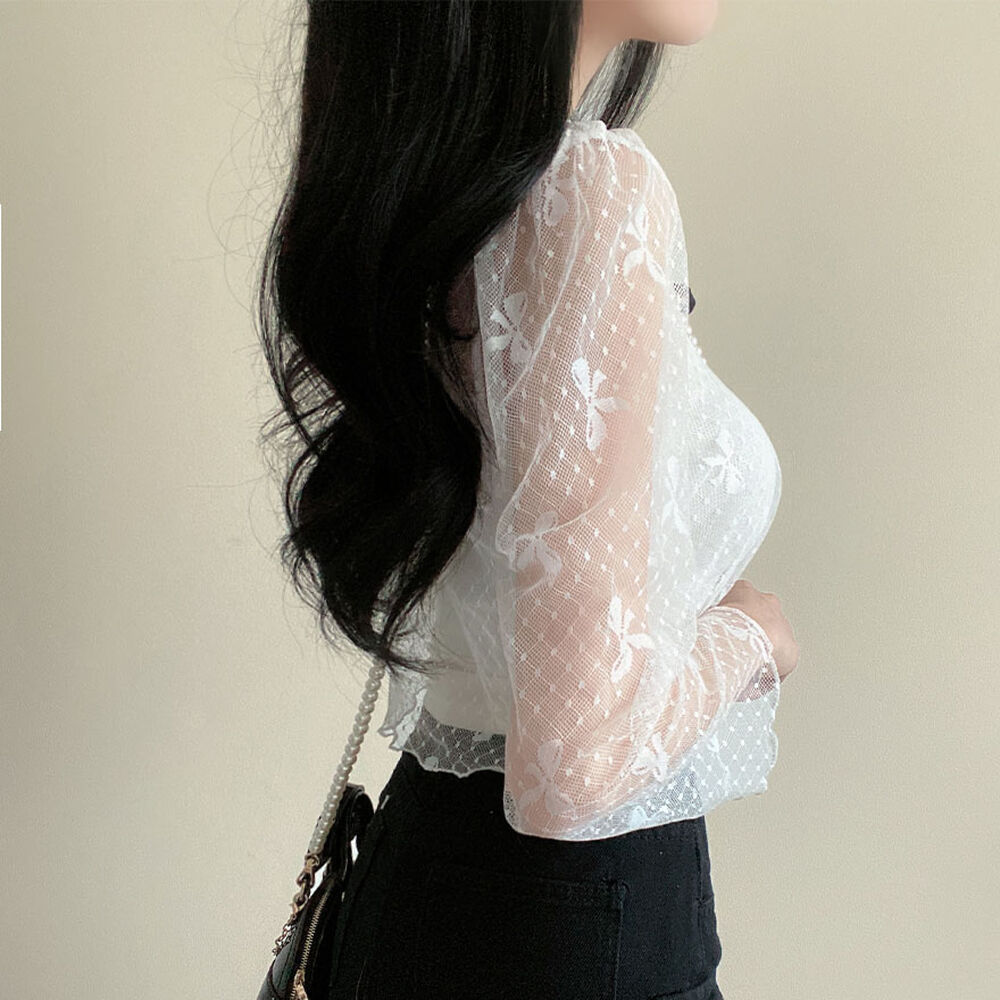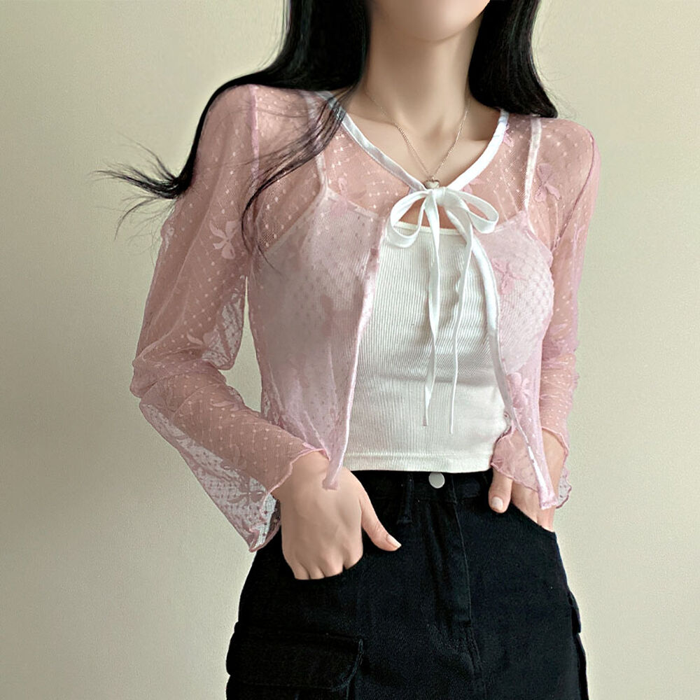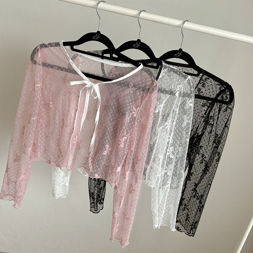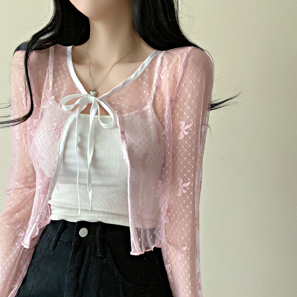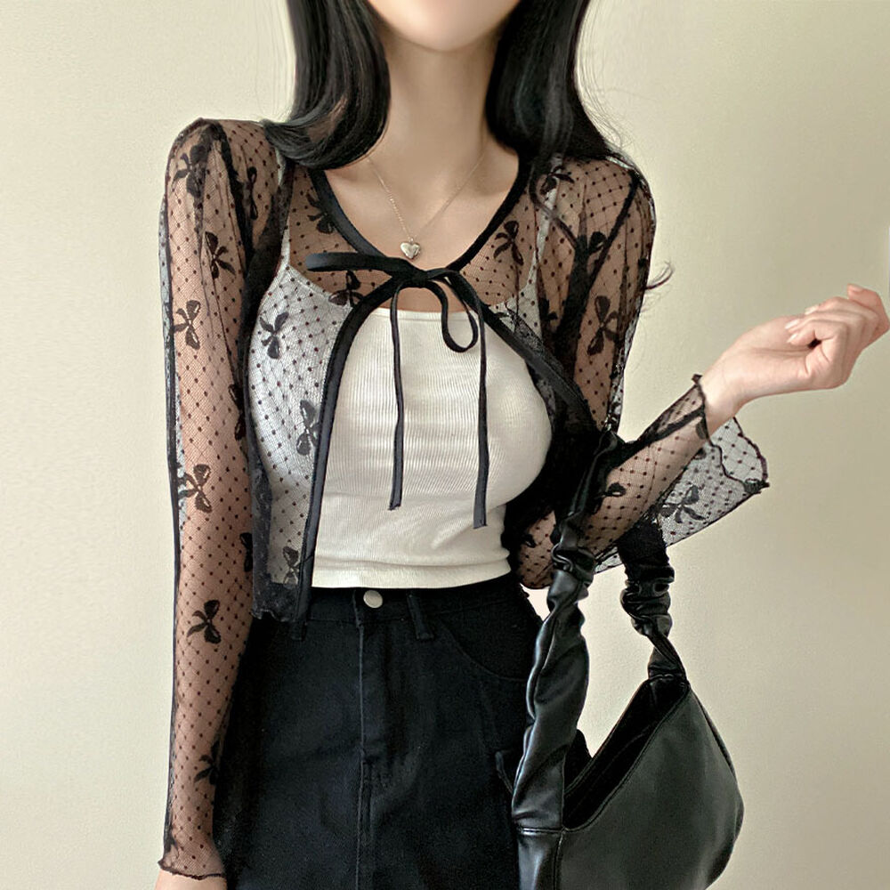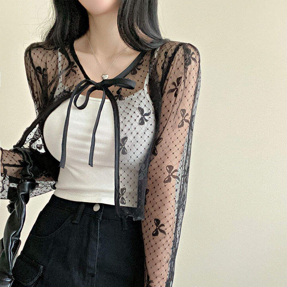 バイカラーリボンチュールシースルークロップド長袖カーディガン