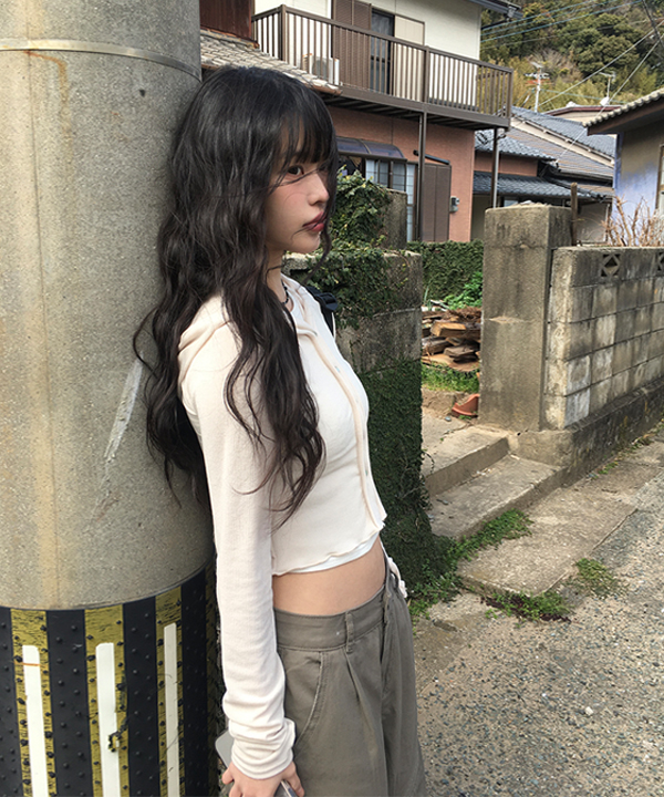 [-3kgフィット] 裾メロウクロップドボタンフード付きカーディガン (3color)