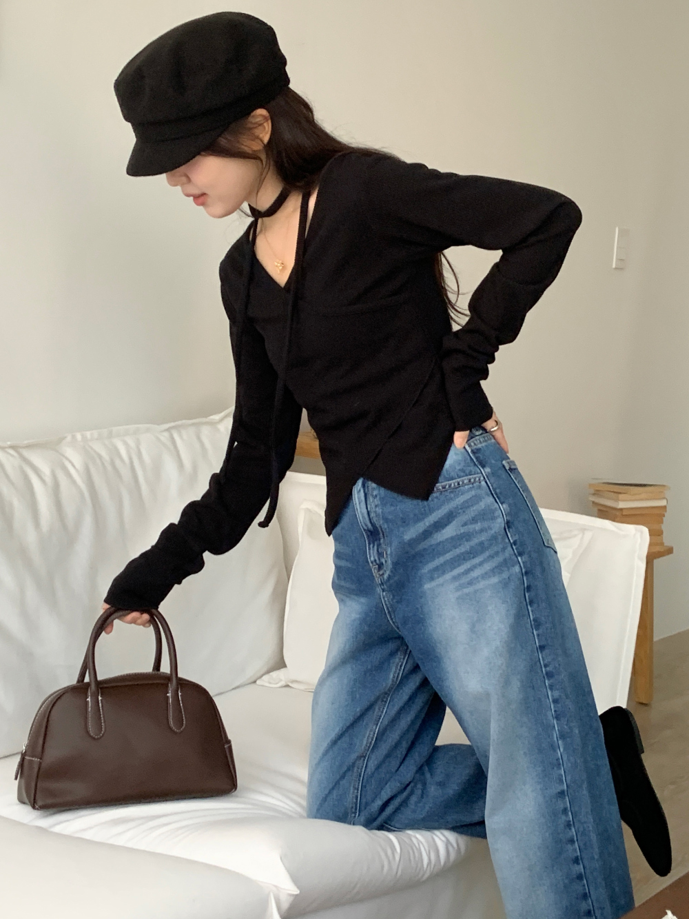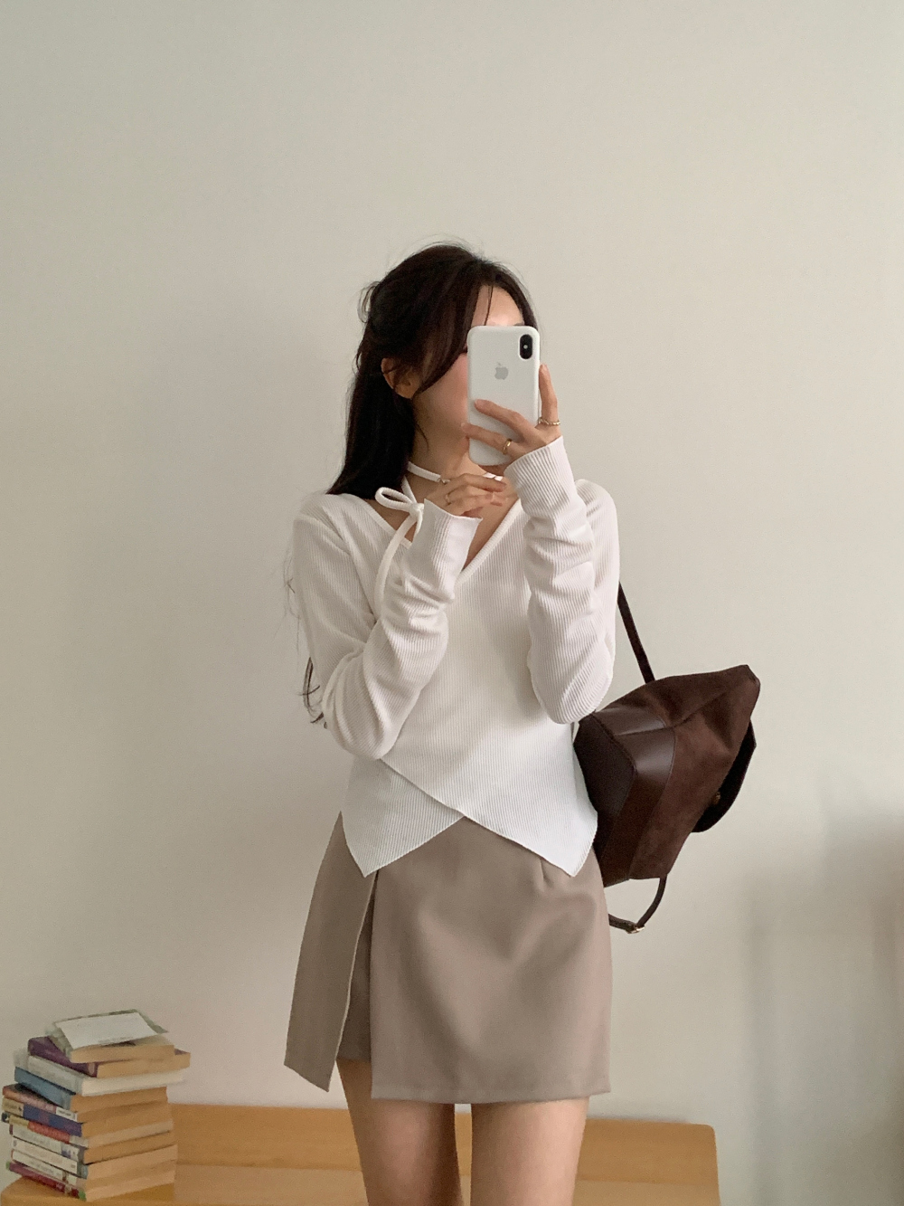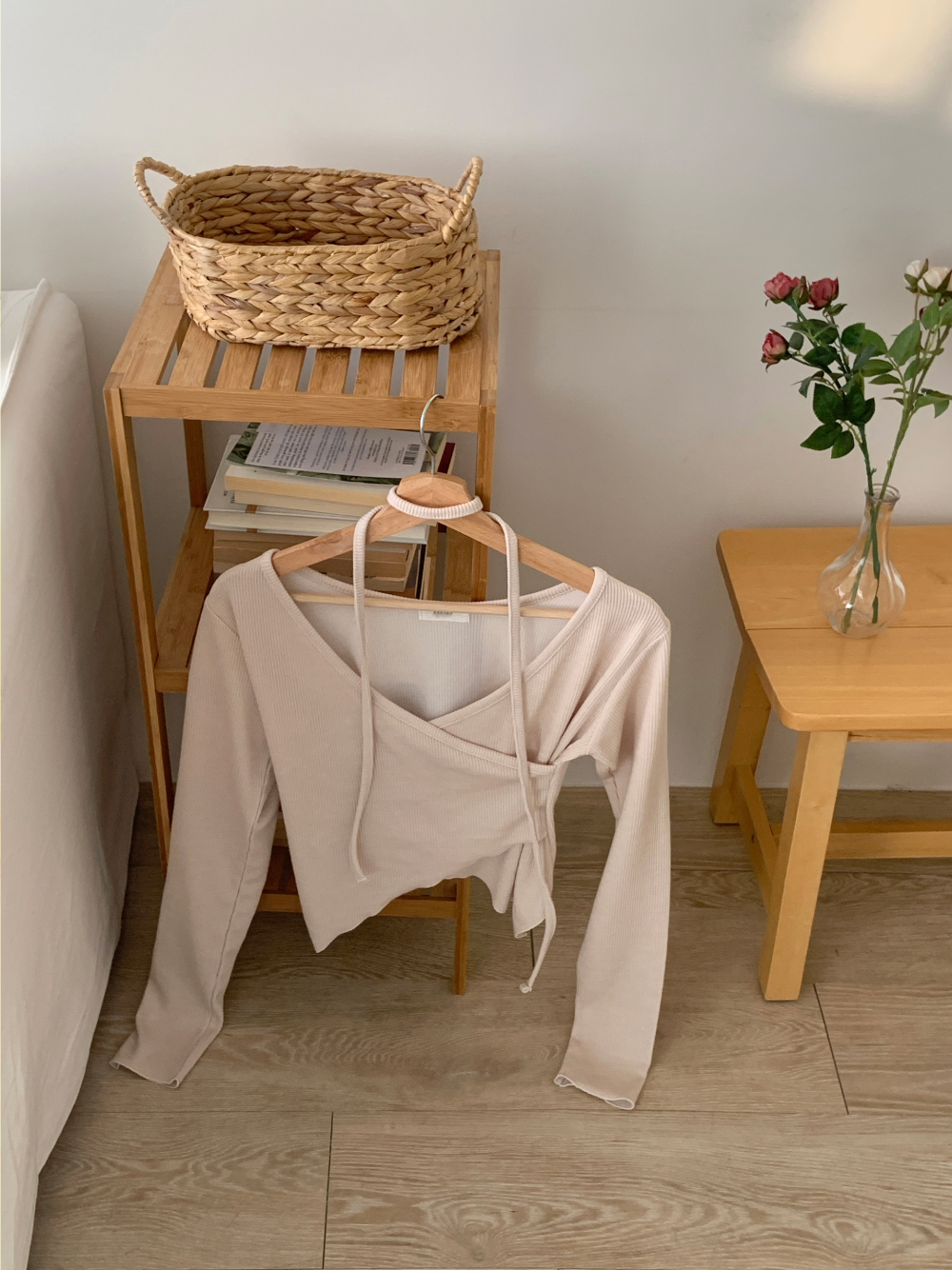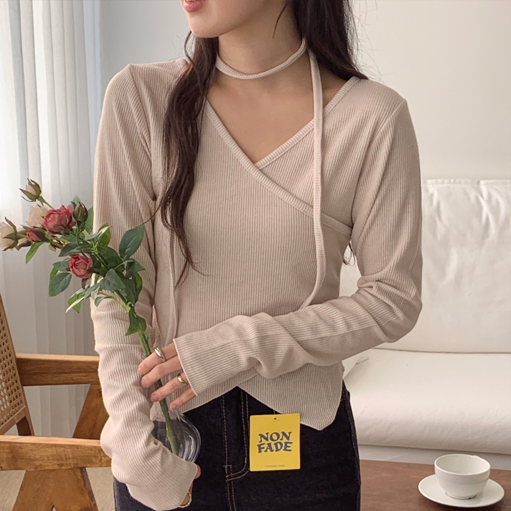 チョーカー紐ラップリブVネッククロップド長袖Tシャツ