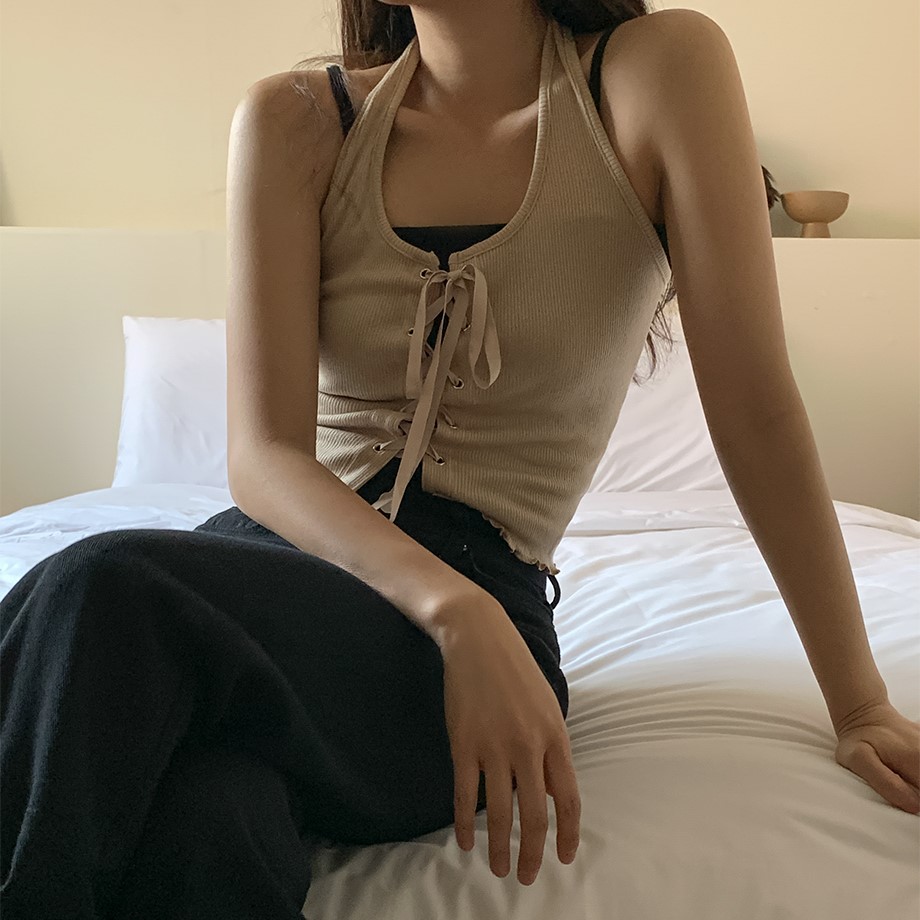 リブリボンアイレットホルターネックレイヤードノースリーブ