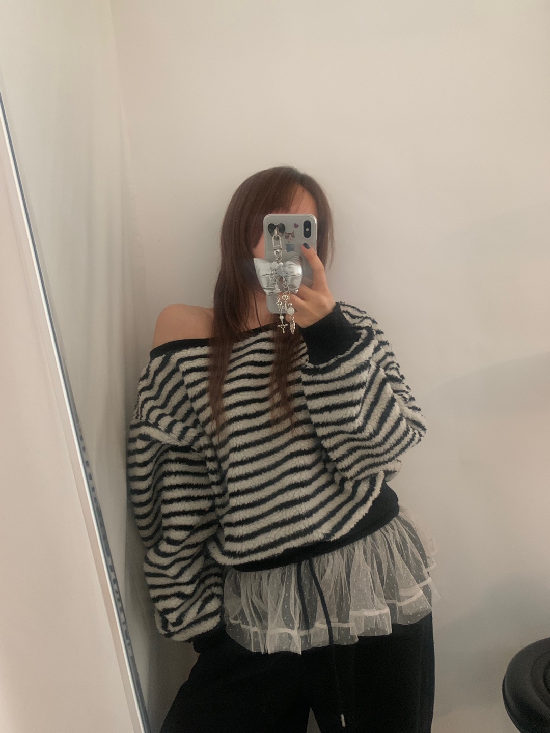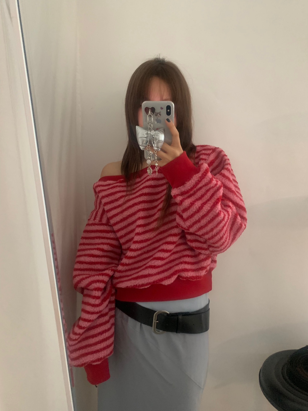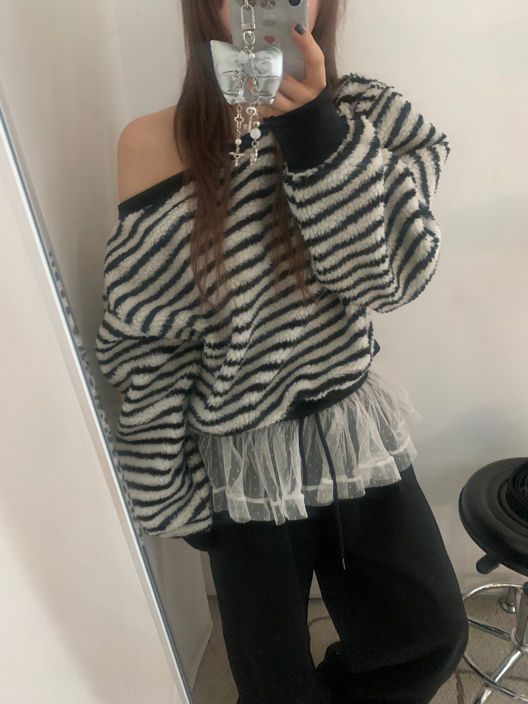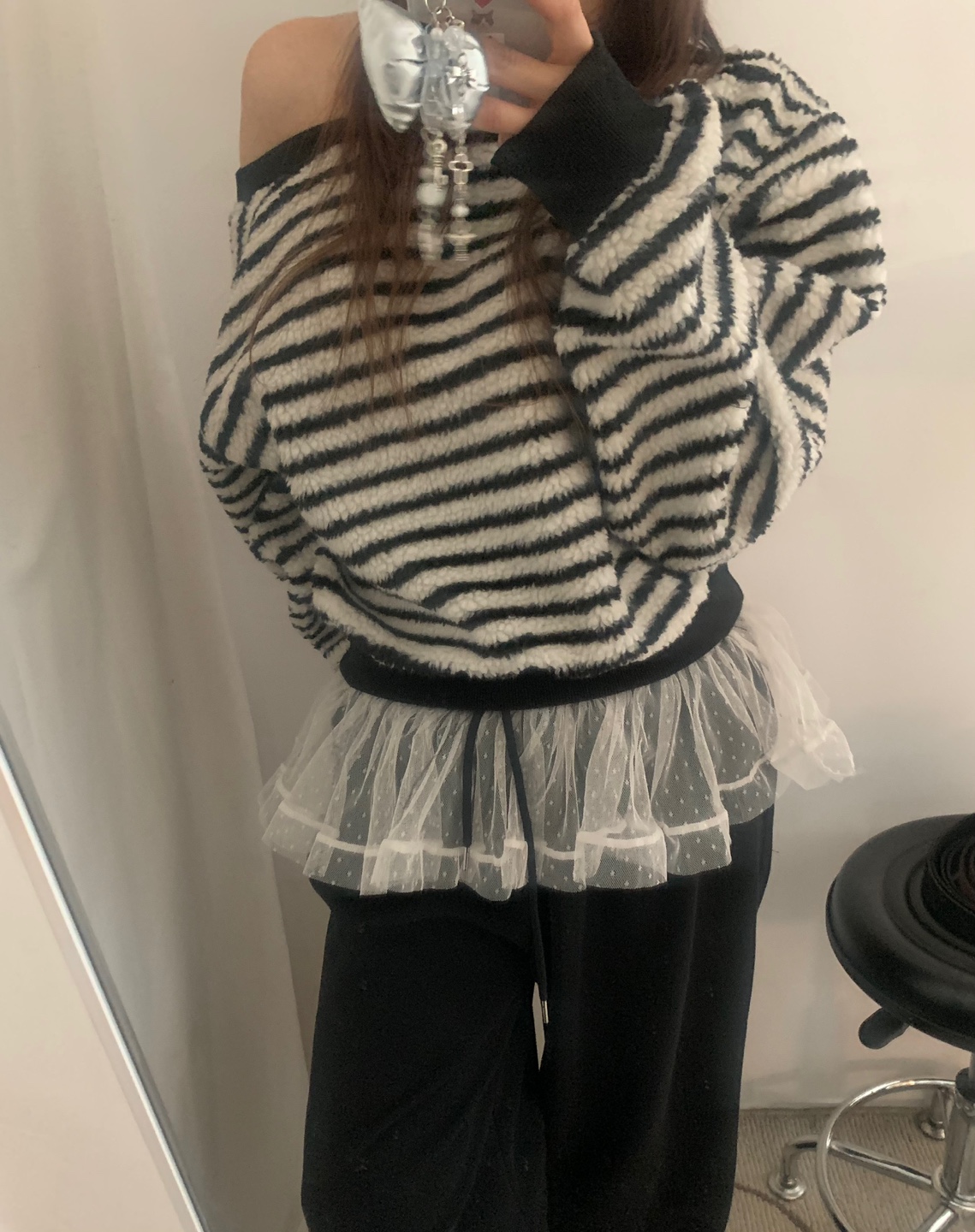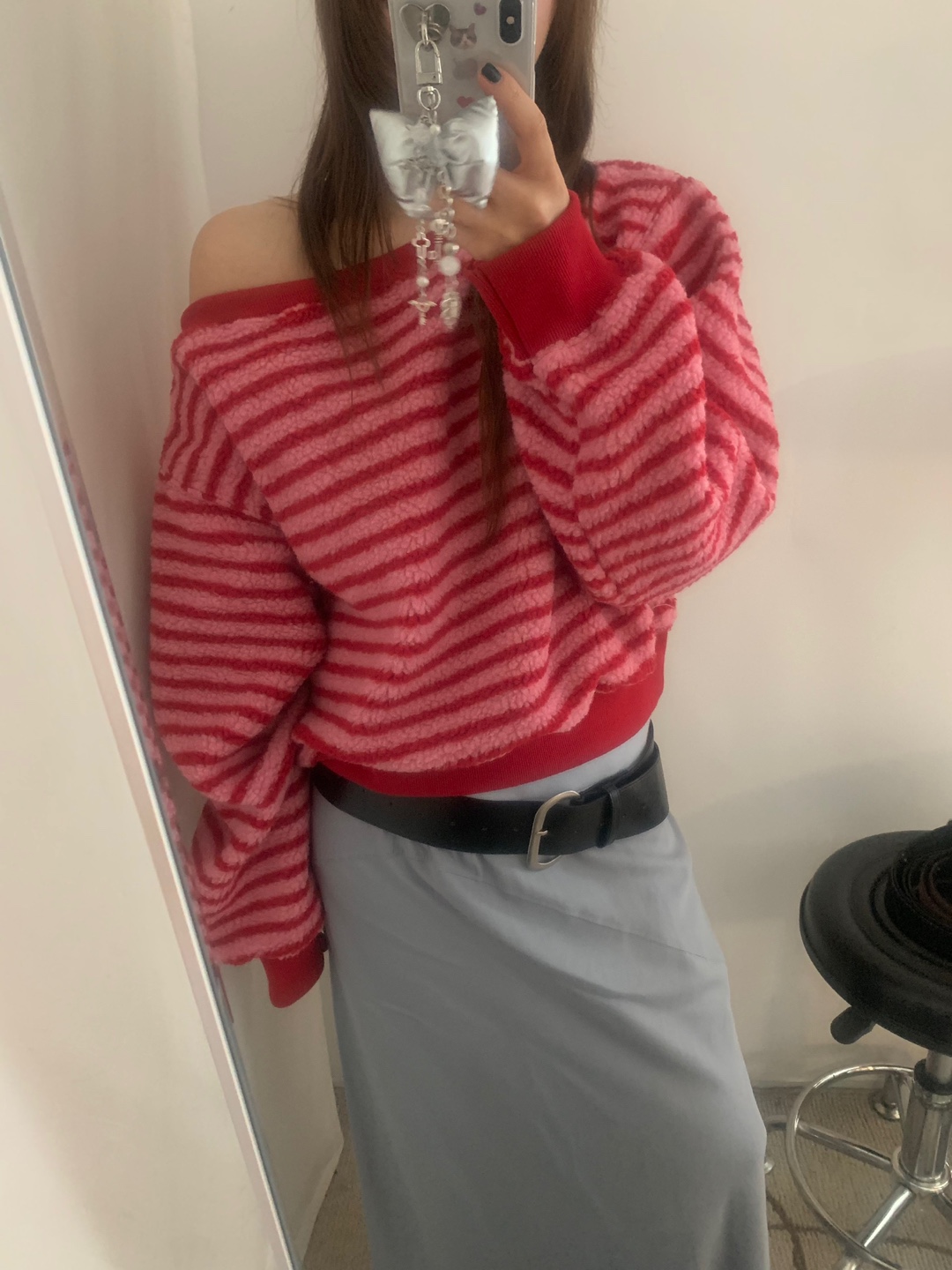 アシンメトリーオフショルストライプスウェットシャツ