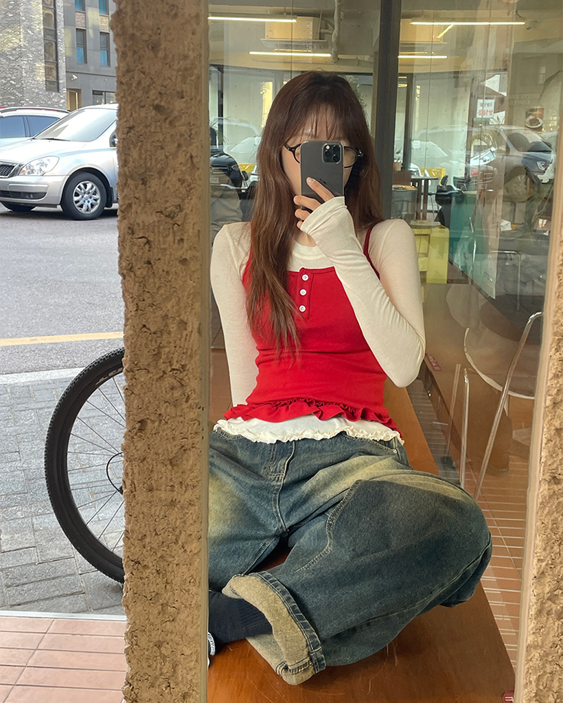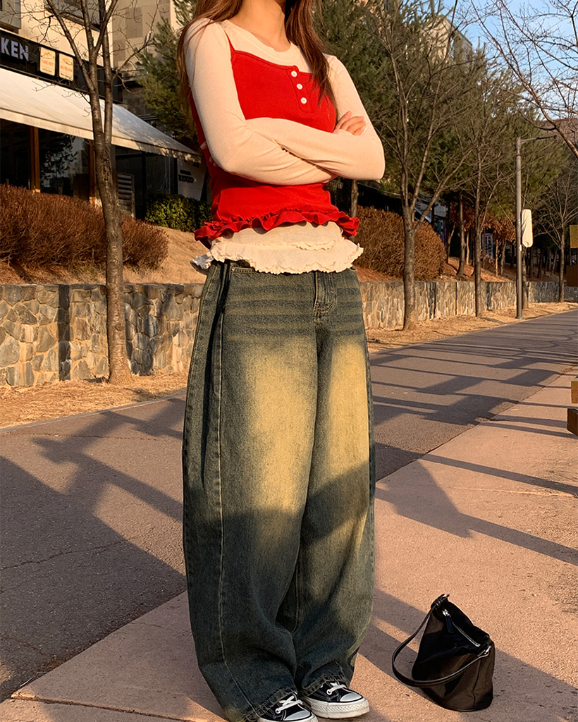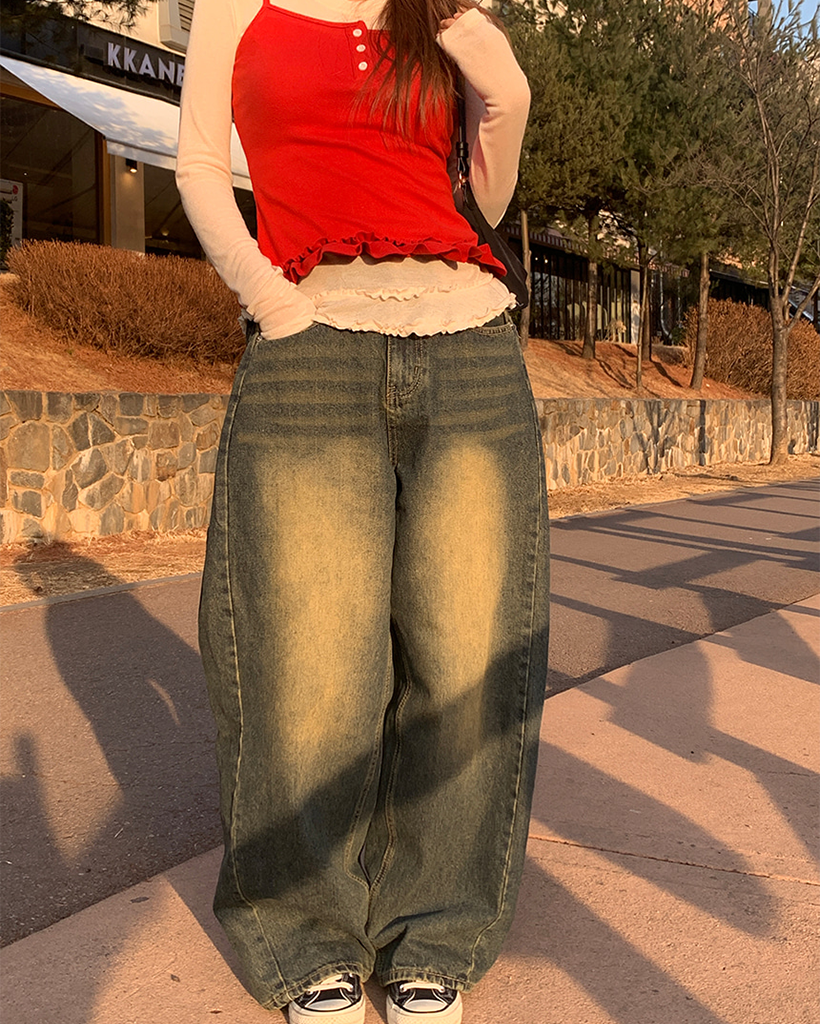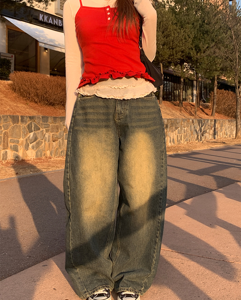 サイドスリットヴィンテージウォッシュワイドデニムパンツ