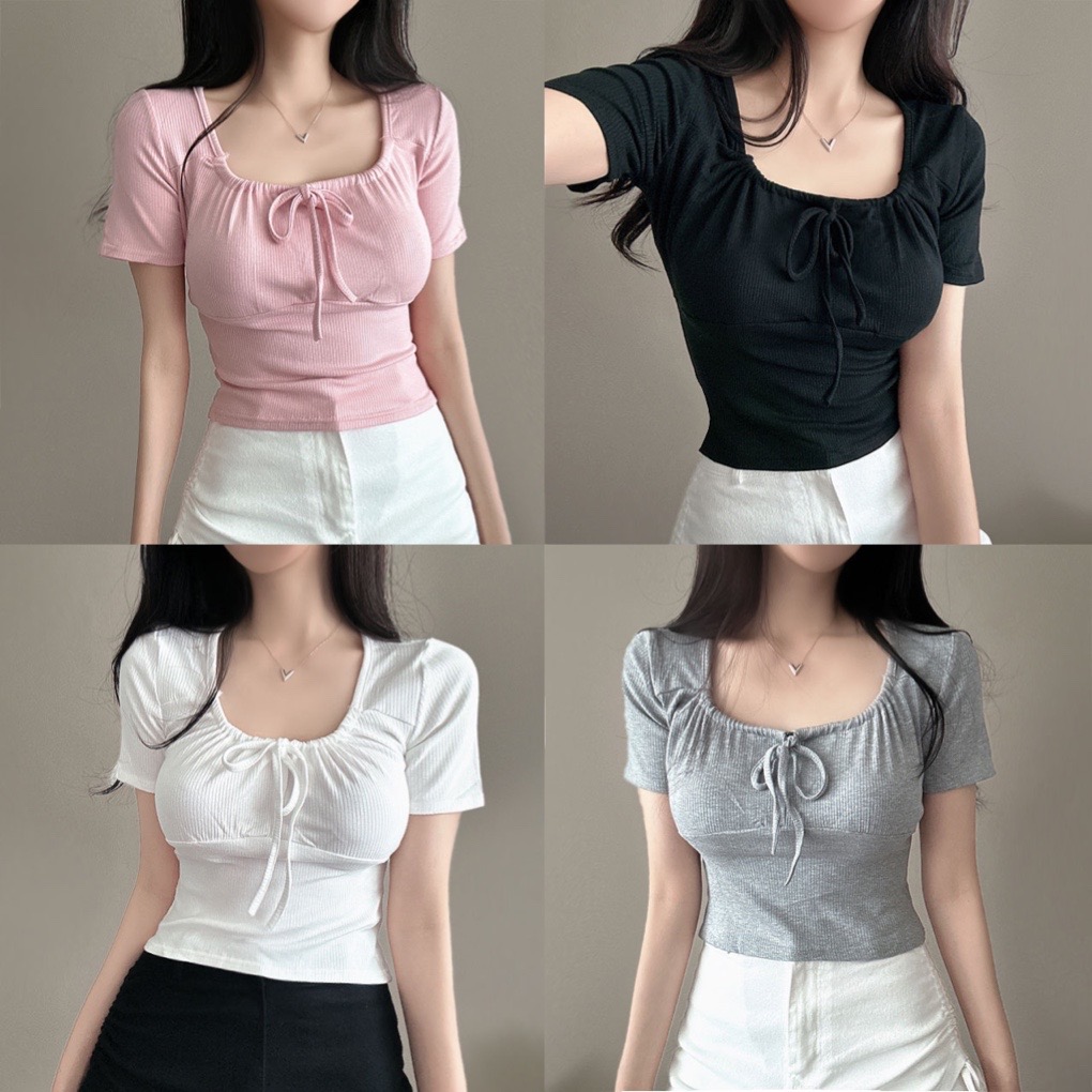 シャーリングスクエアリボンリブクロップド半袖Tシャツ