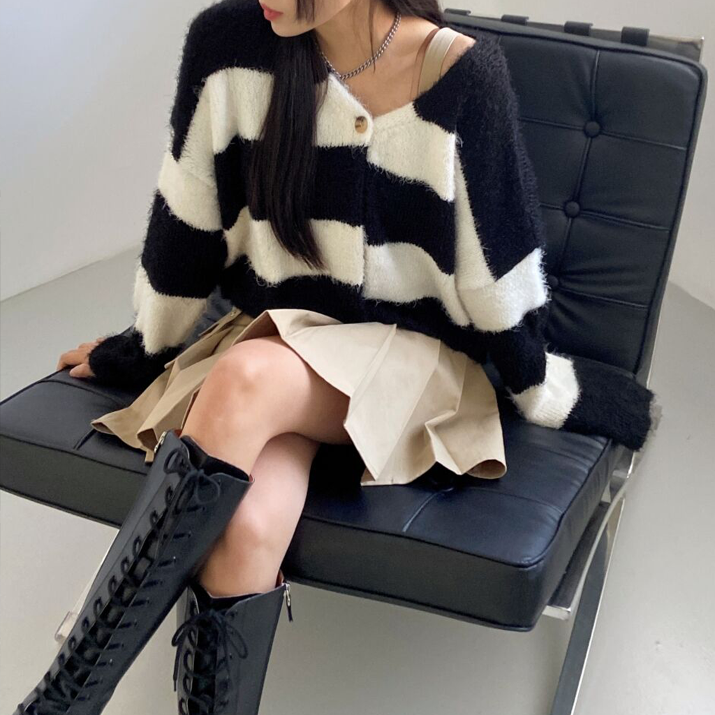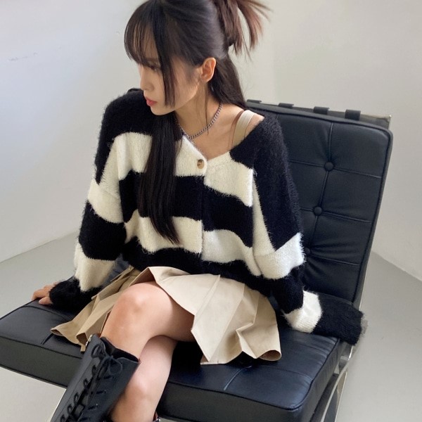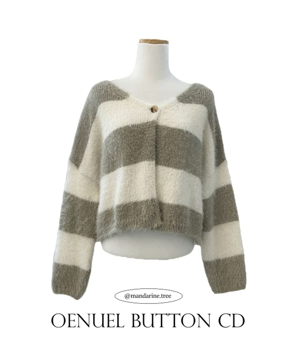 ワンボタンボーダーVネックボレロニットファーカーディガン2color