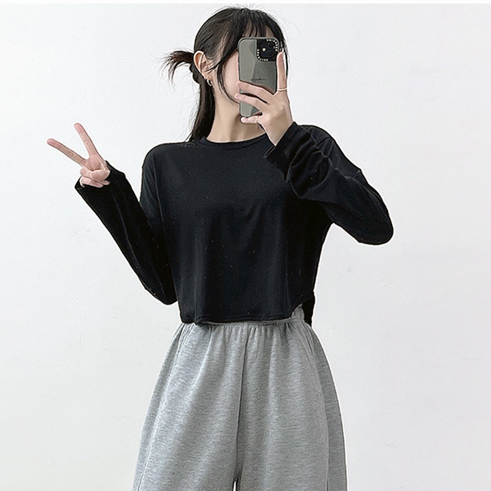 ルーズラウンドセミクロップドレイヤード長袖Tシャツ