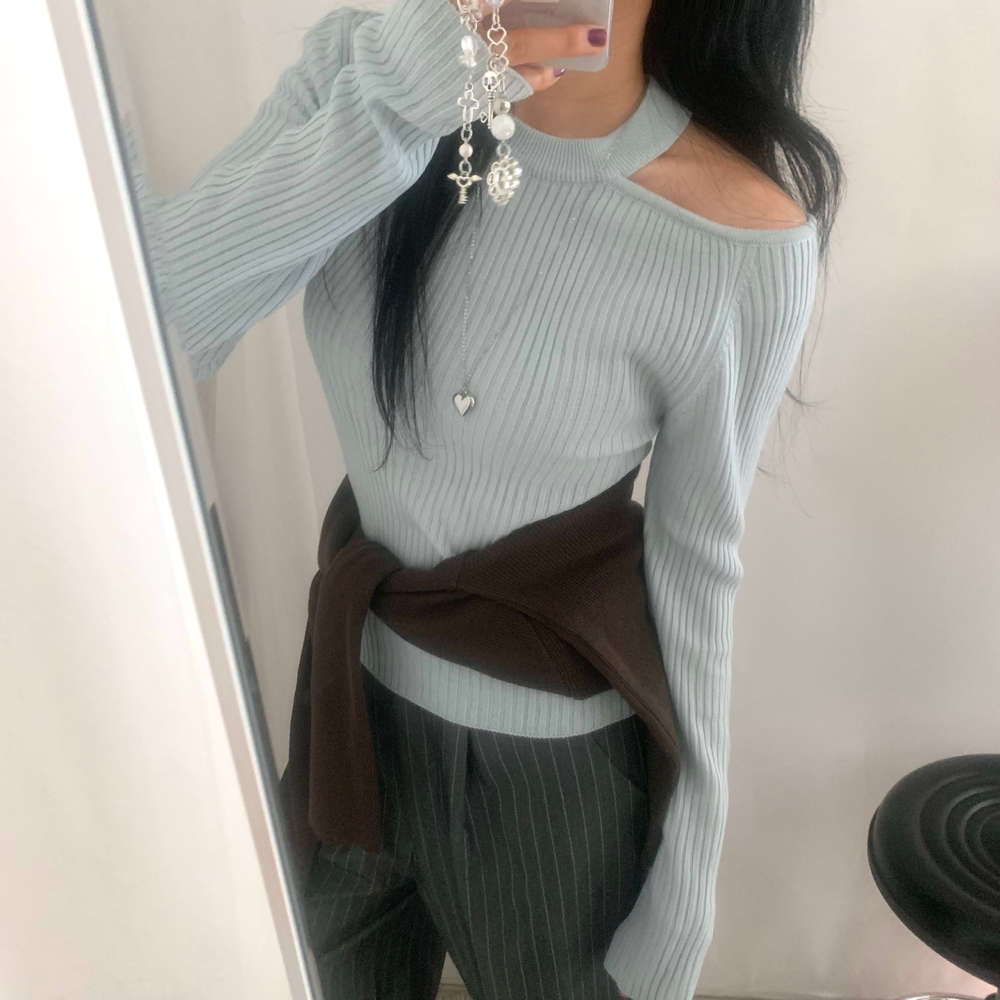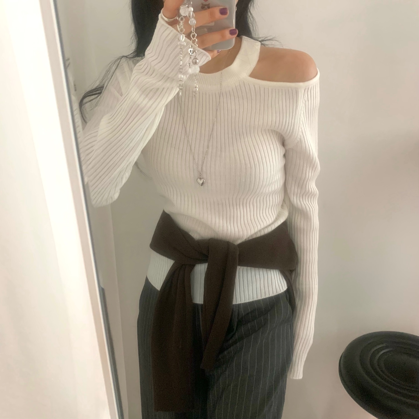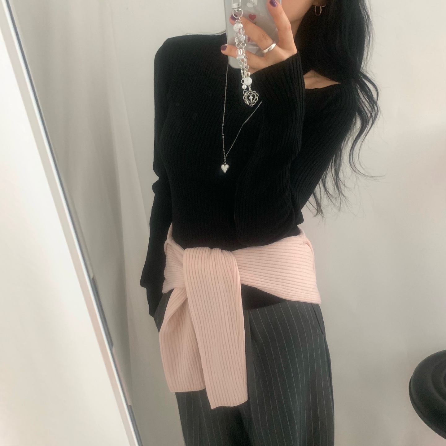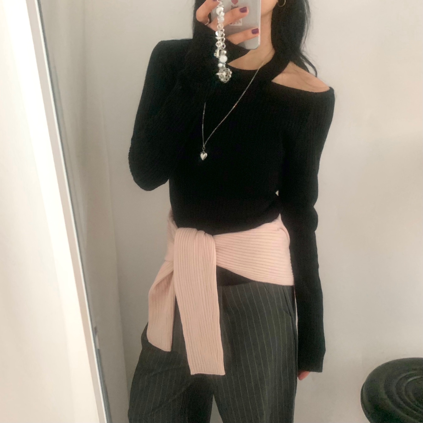 ラウンドネックアシンメトリースリットリブ長袖Tシャツ