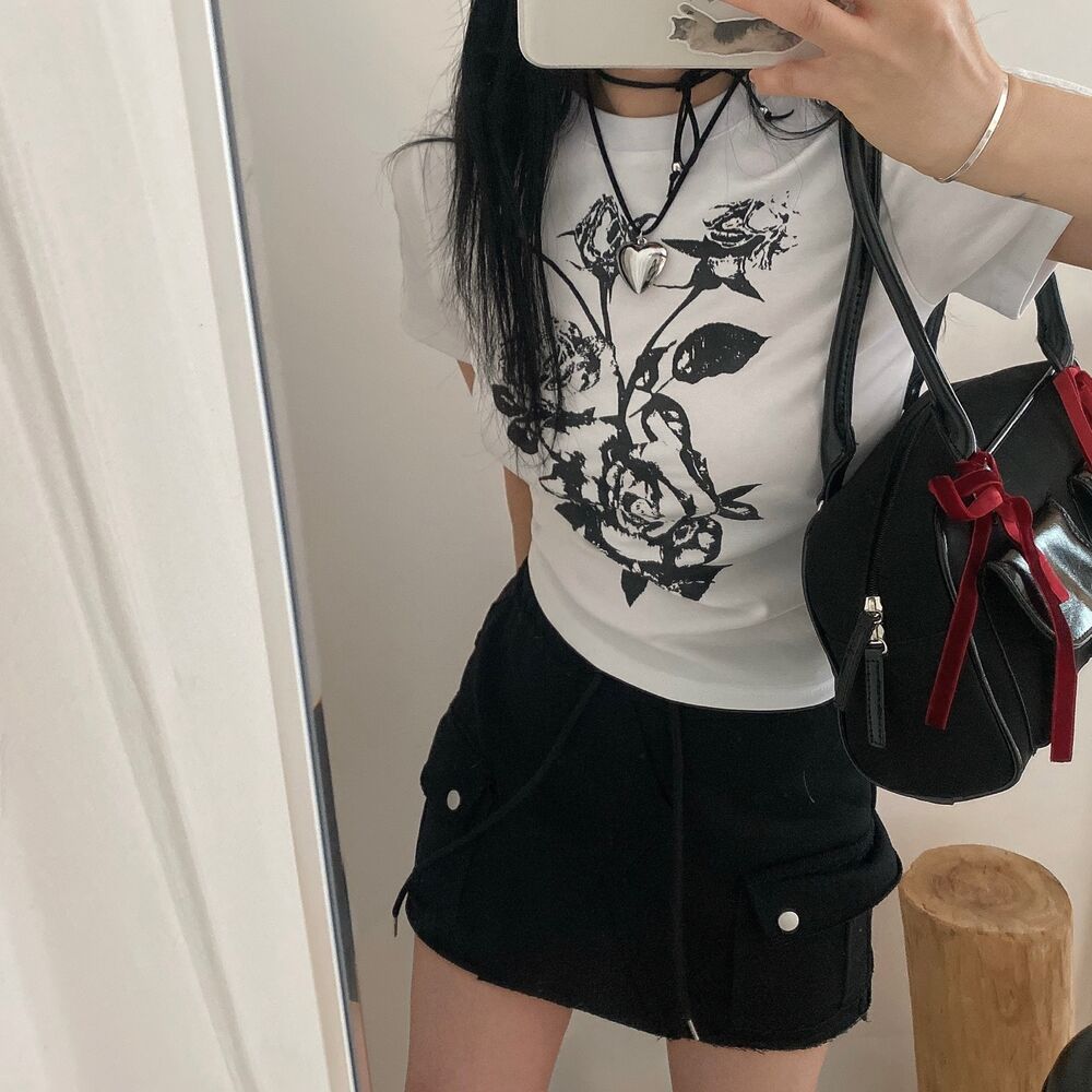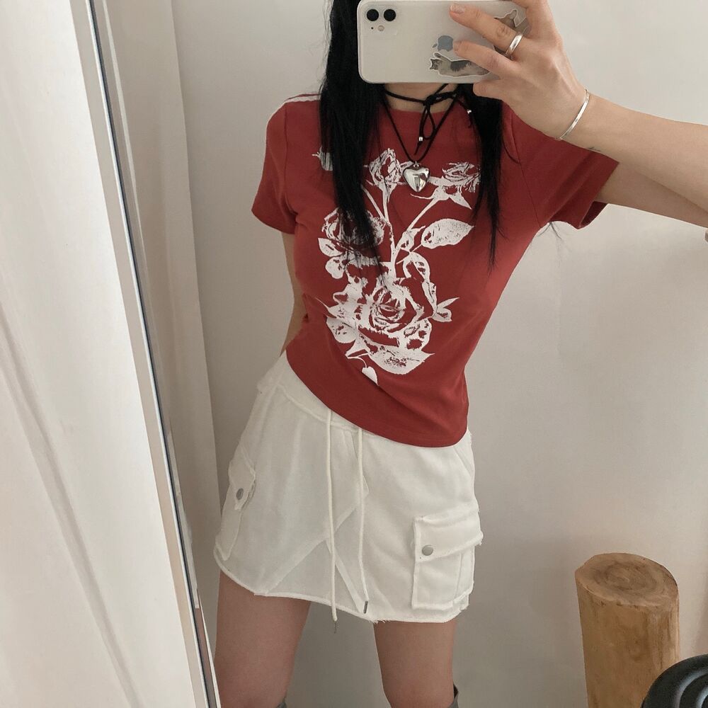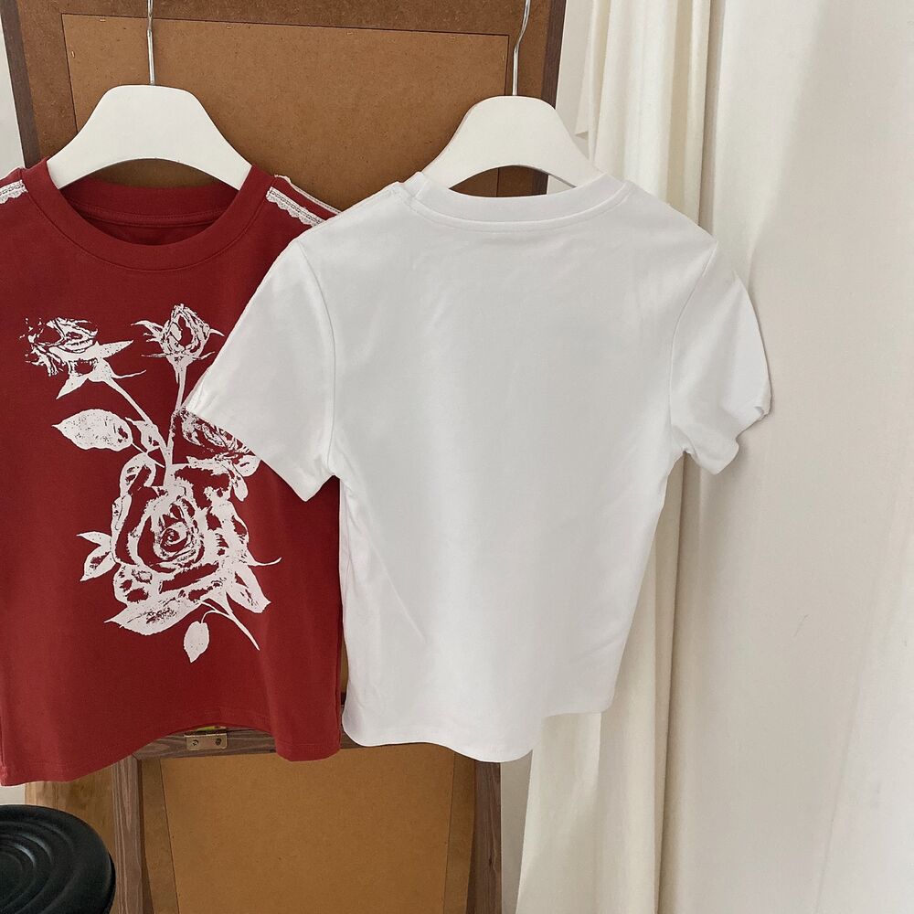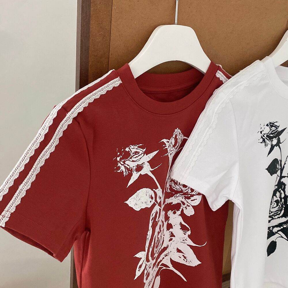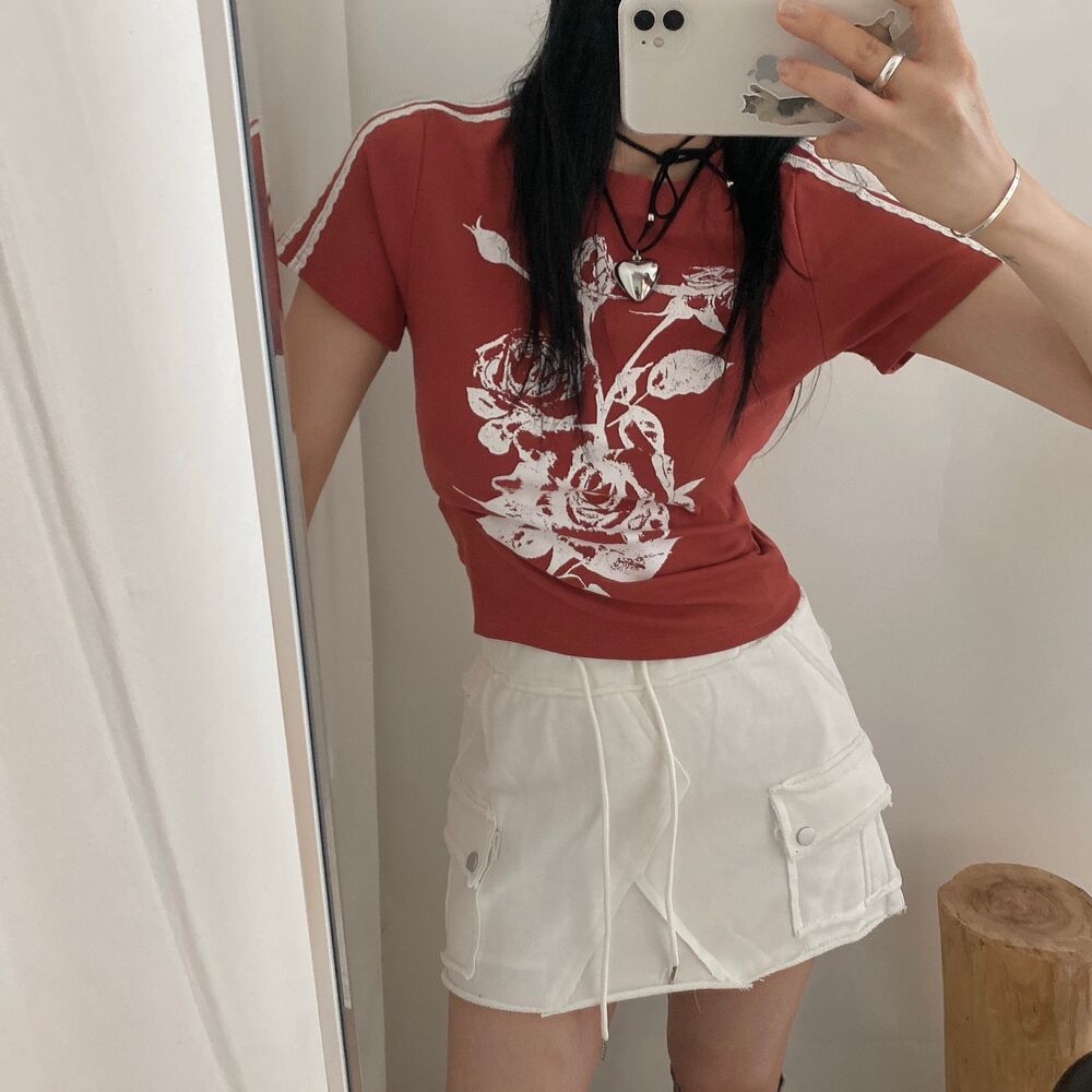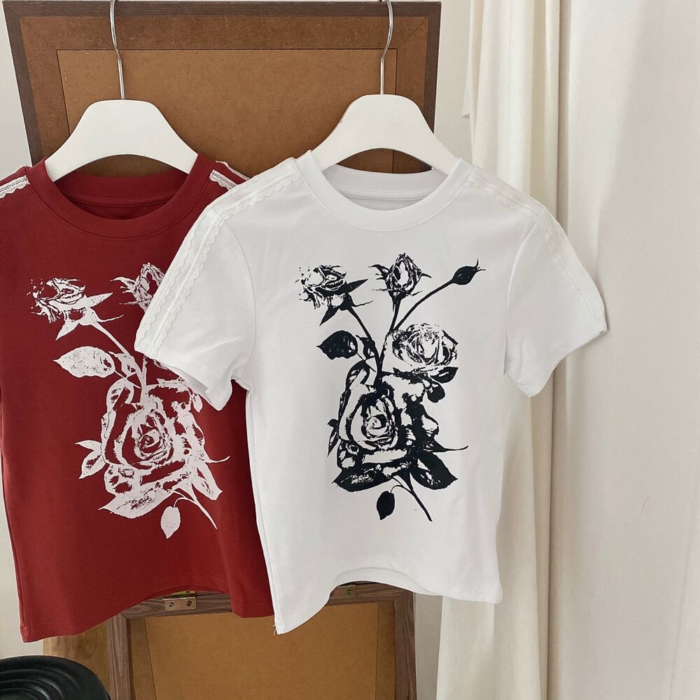 ローズプリントクロップド半袖Tシャツ