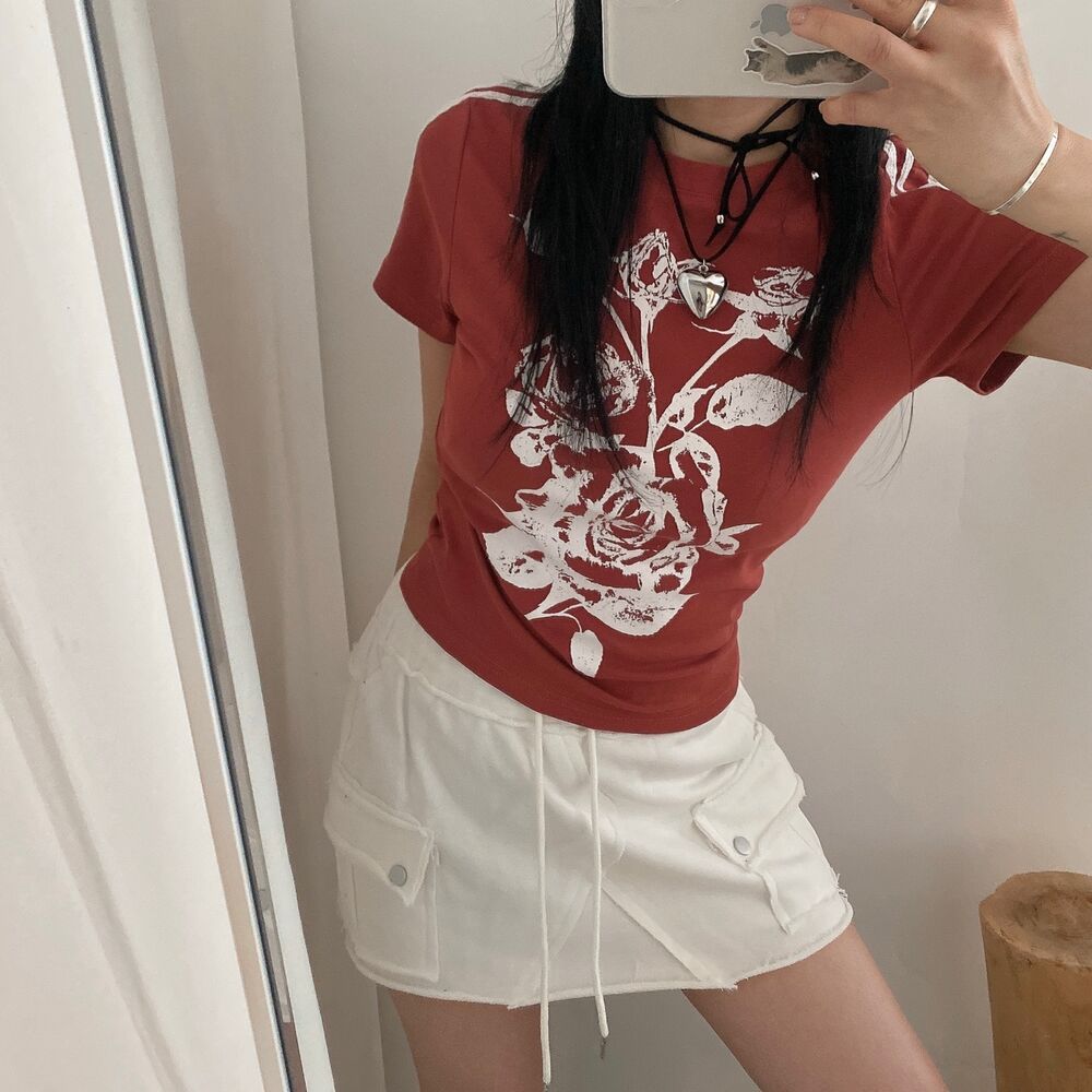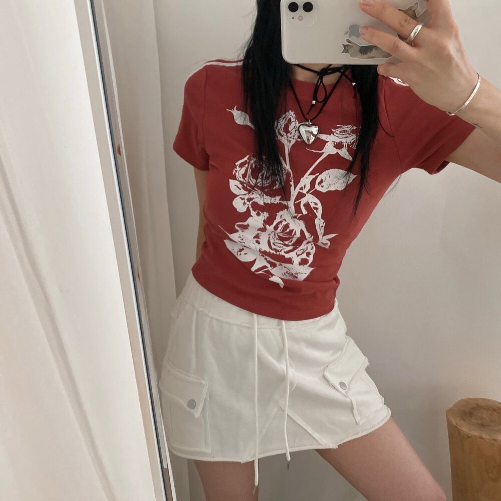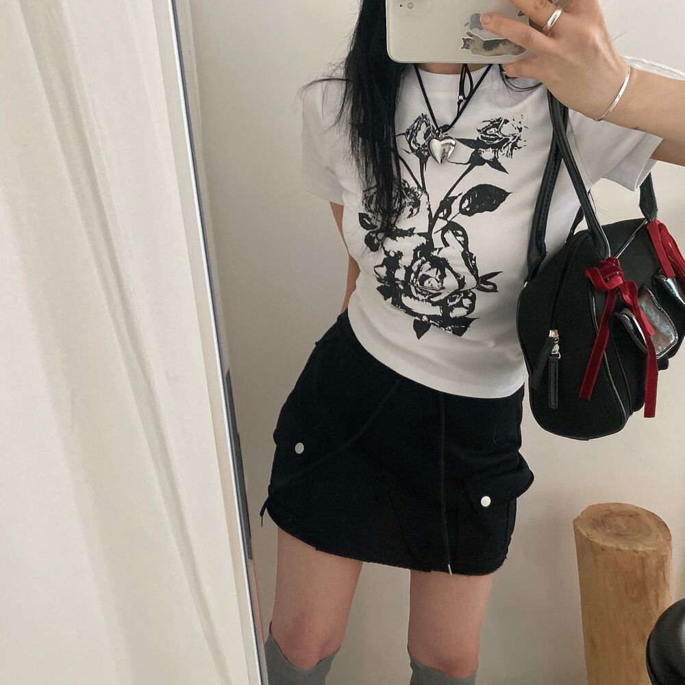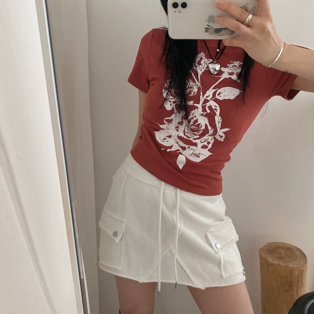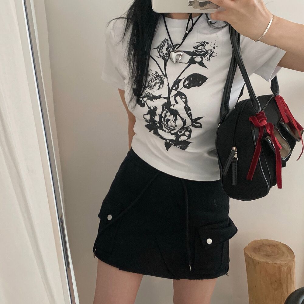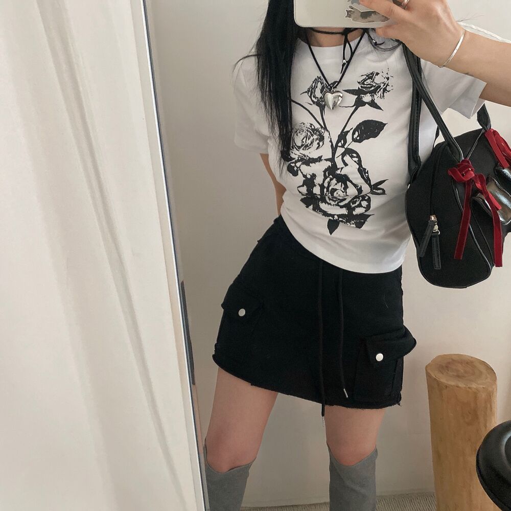 ローズプリントクロップド半袖Tシャツ