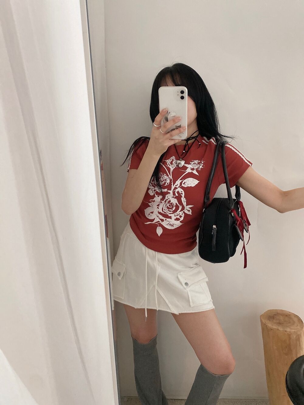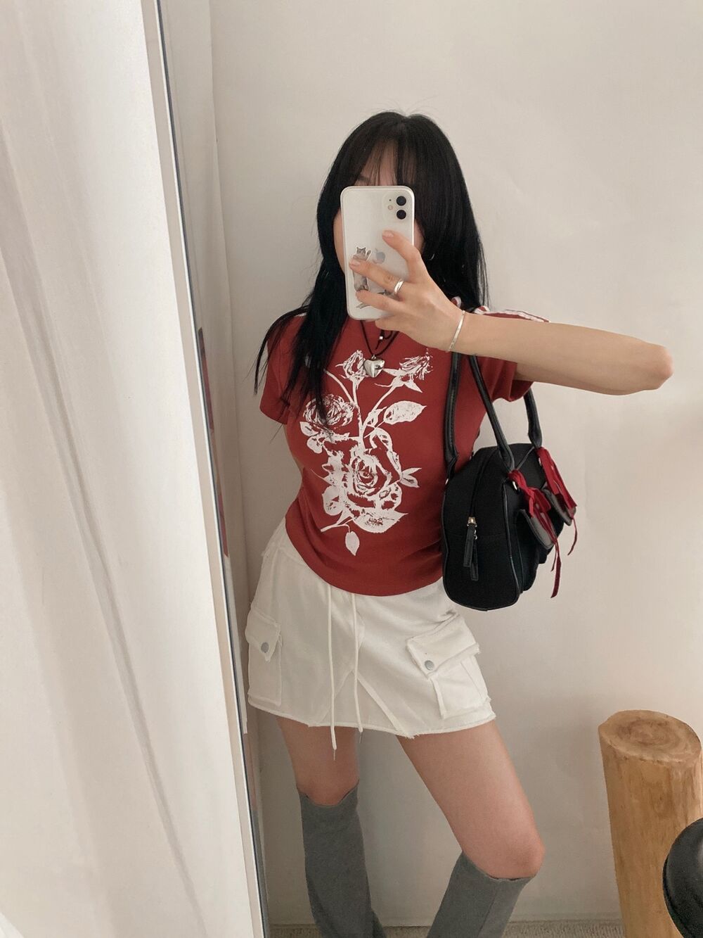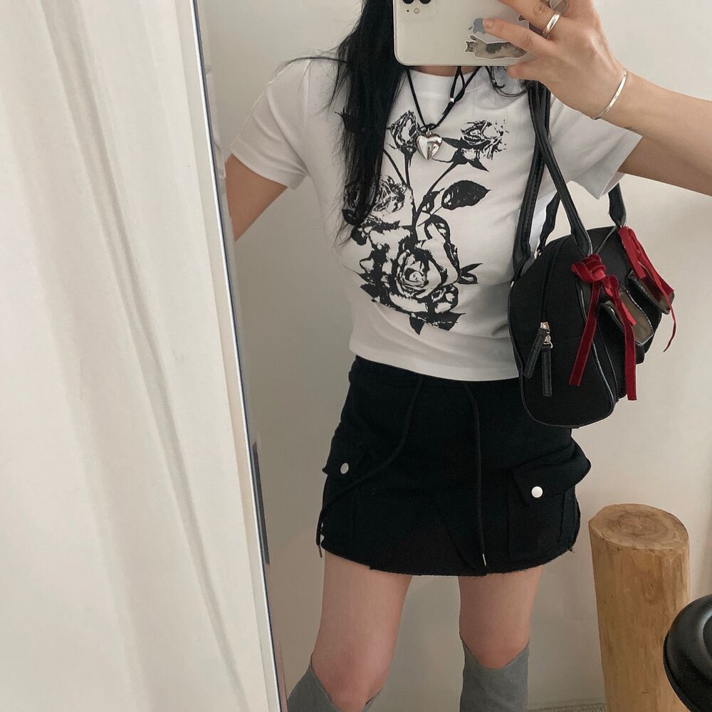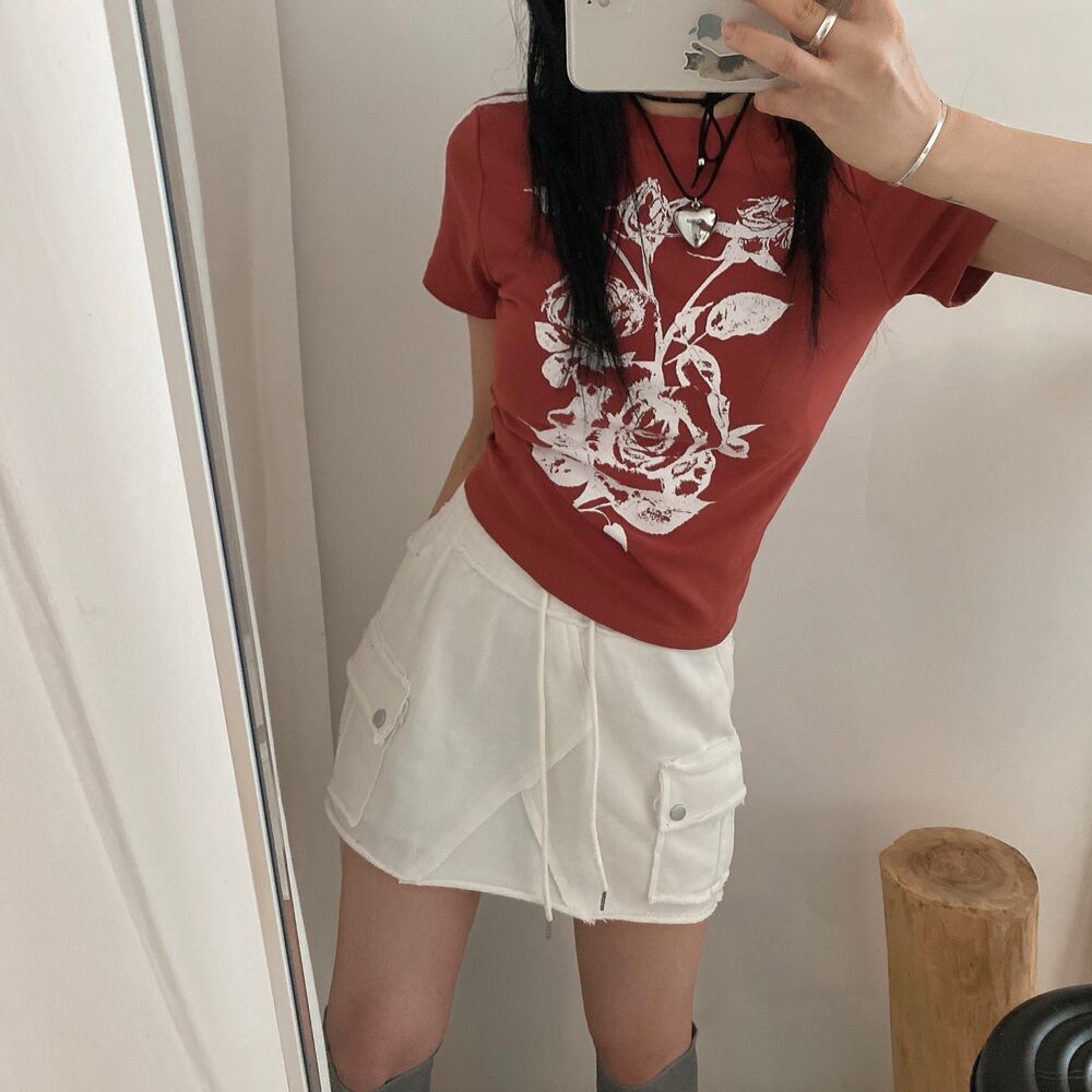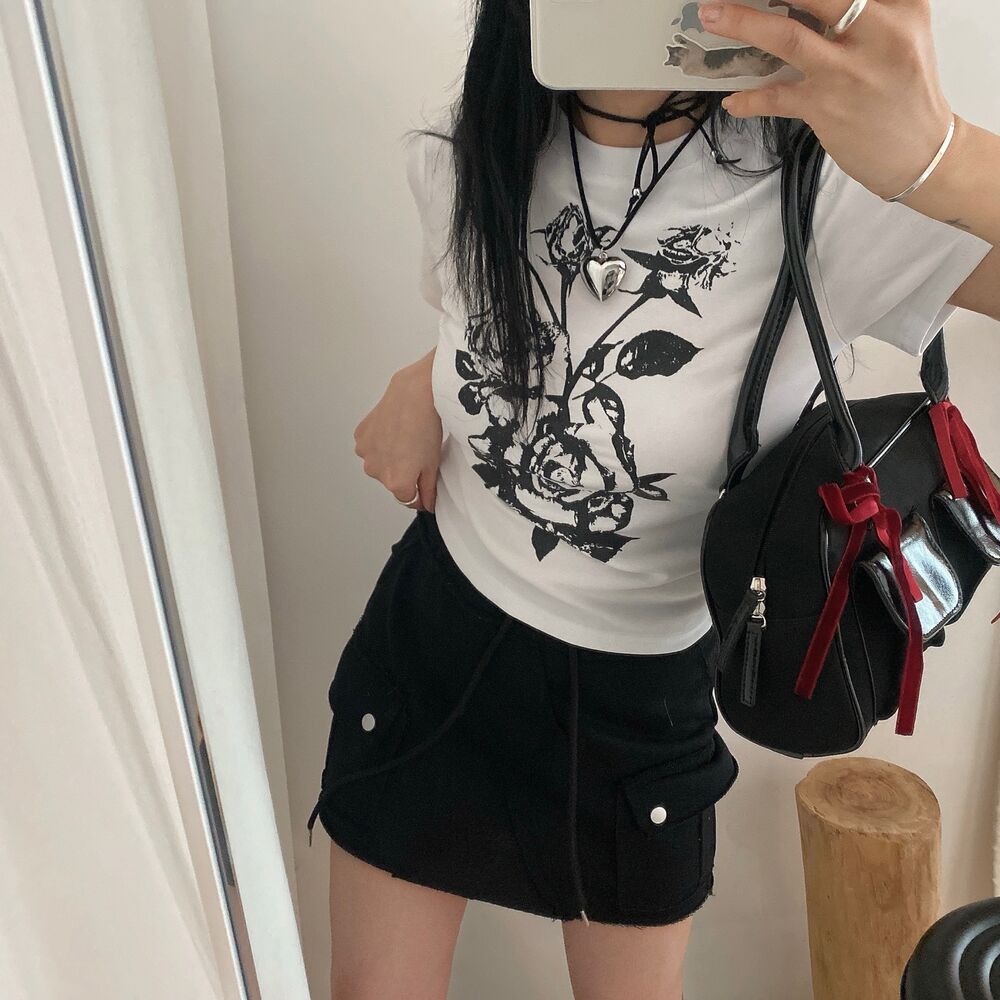 ローズプリントクロップド半袖Tシャツ