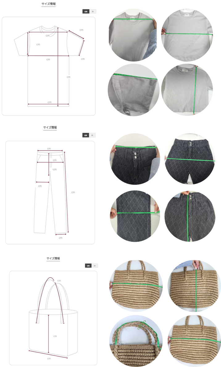 商品情報のサイズ表をご参考の上、測定をお願いいたします。