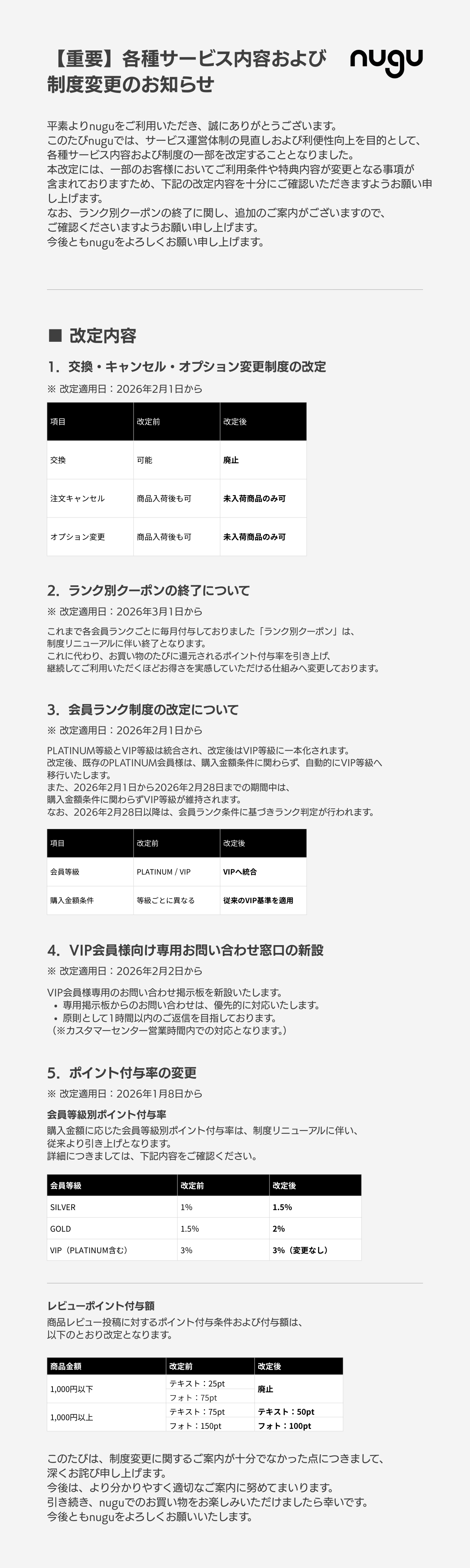 各種サービス内容および制度変更のお知らせ