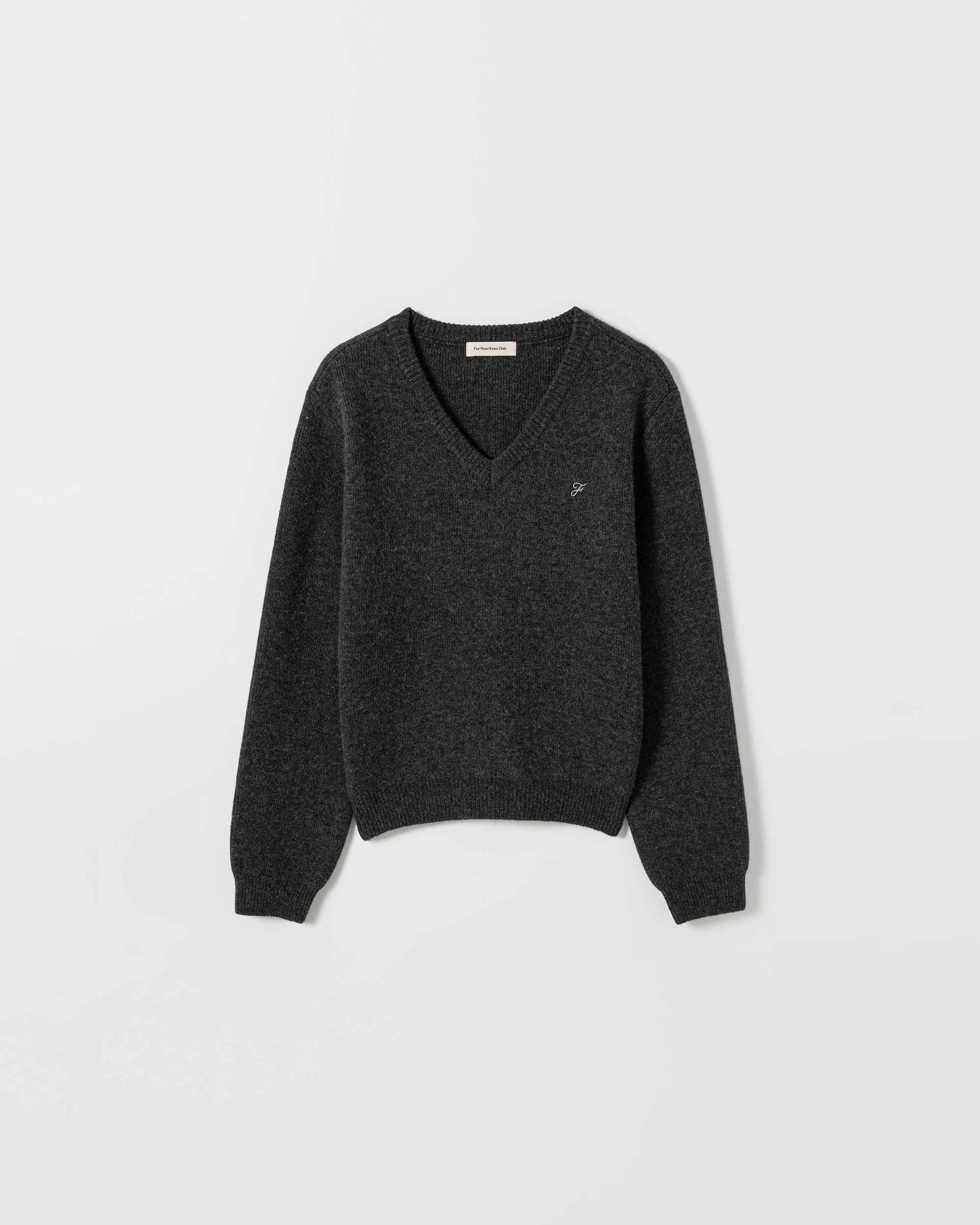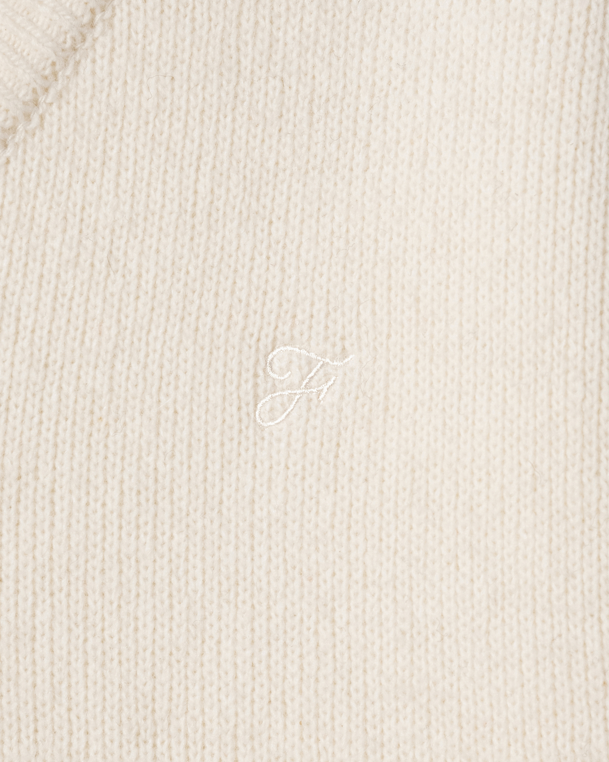 程よいVネックデザインと、フロントに施された F イニシャル刺繍がさりげないアクセントに。