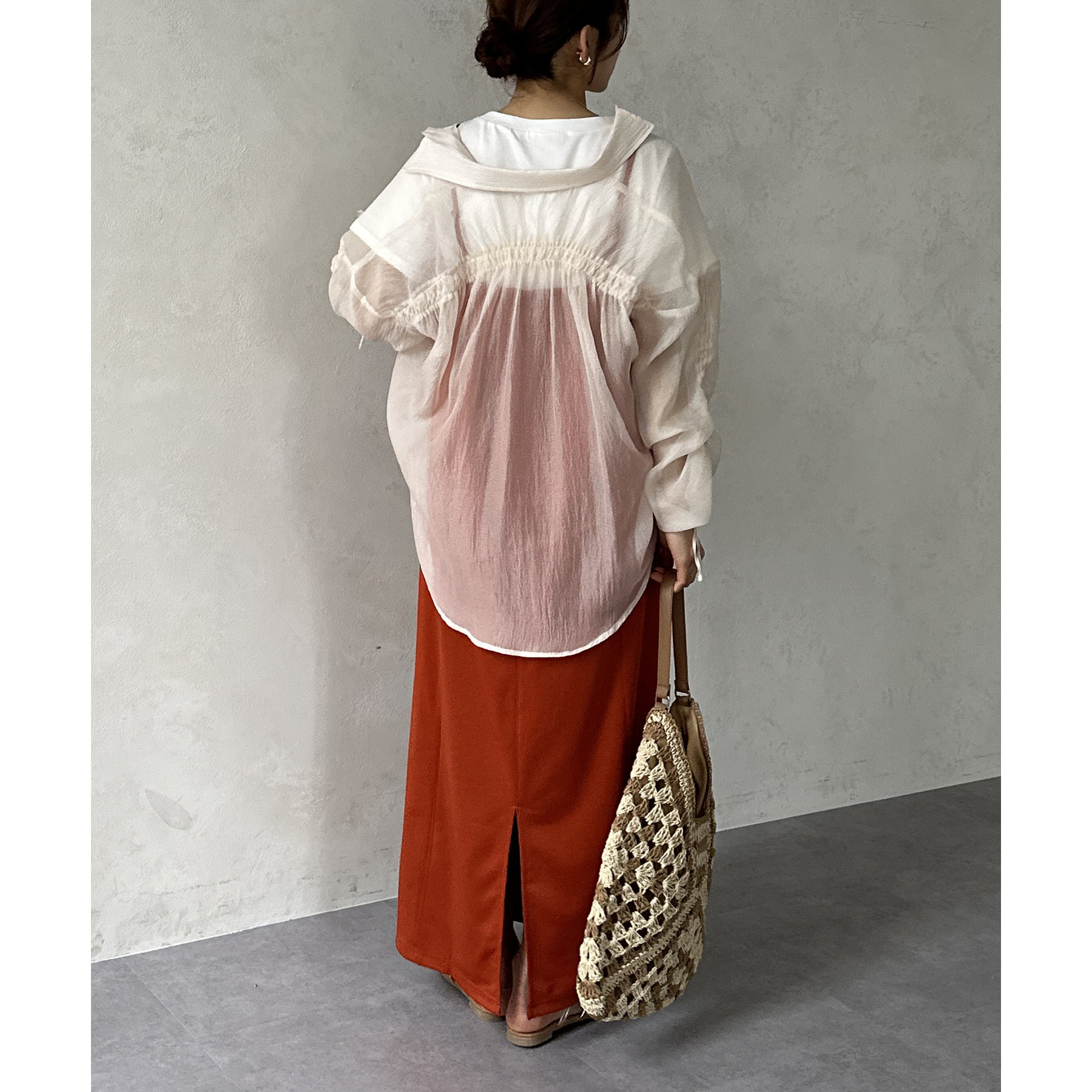 ・タンクトップやTシャツにシアーシャツを合わせて、きれいめカジュアルな