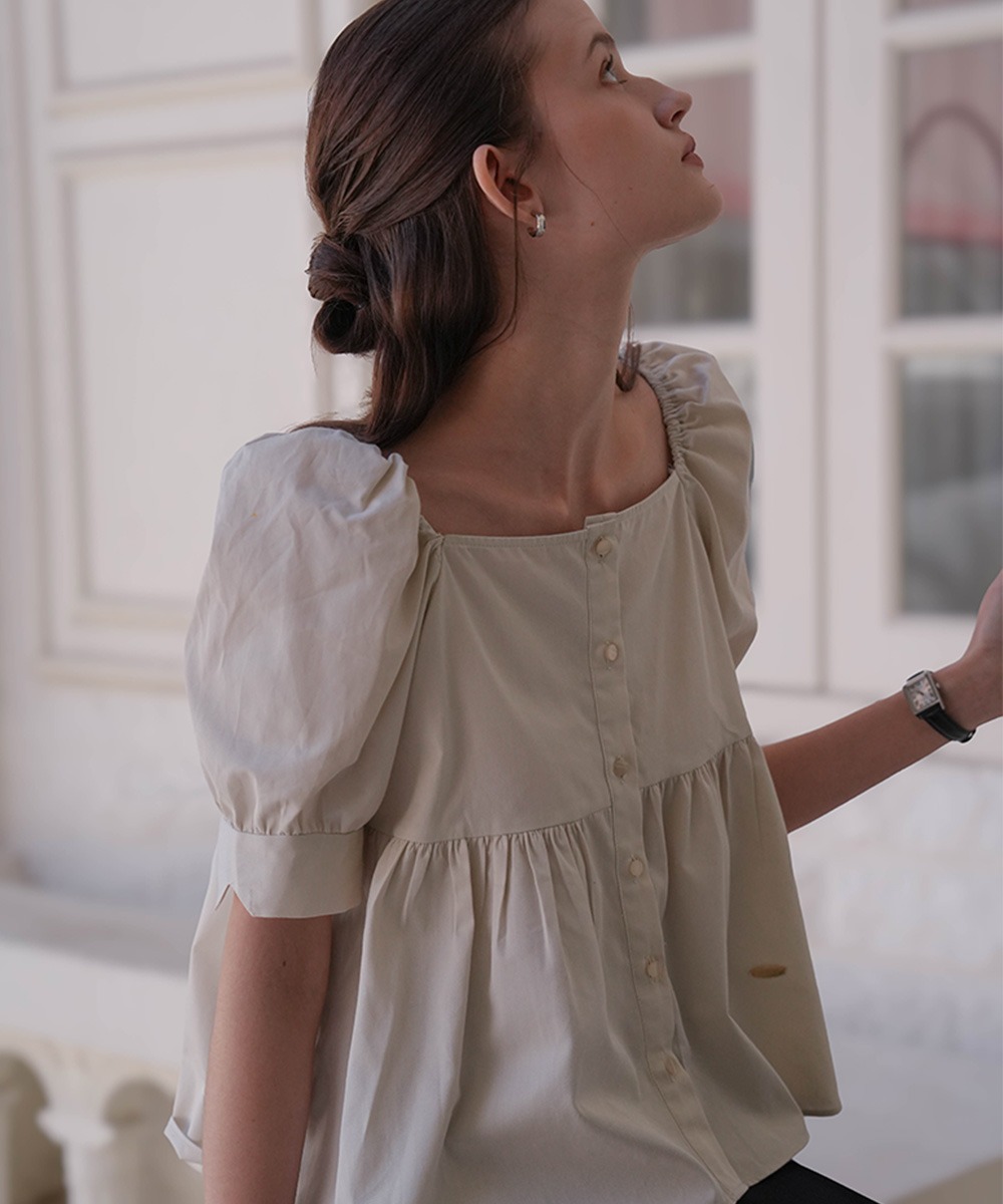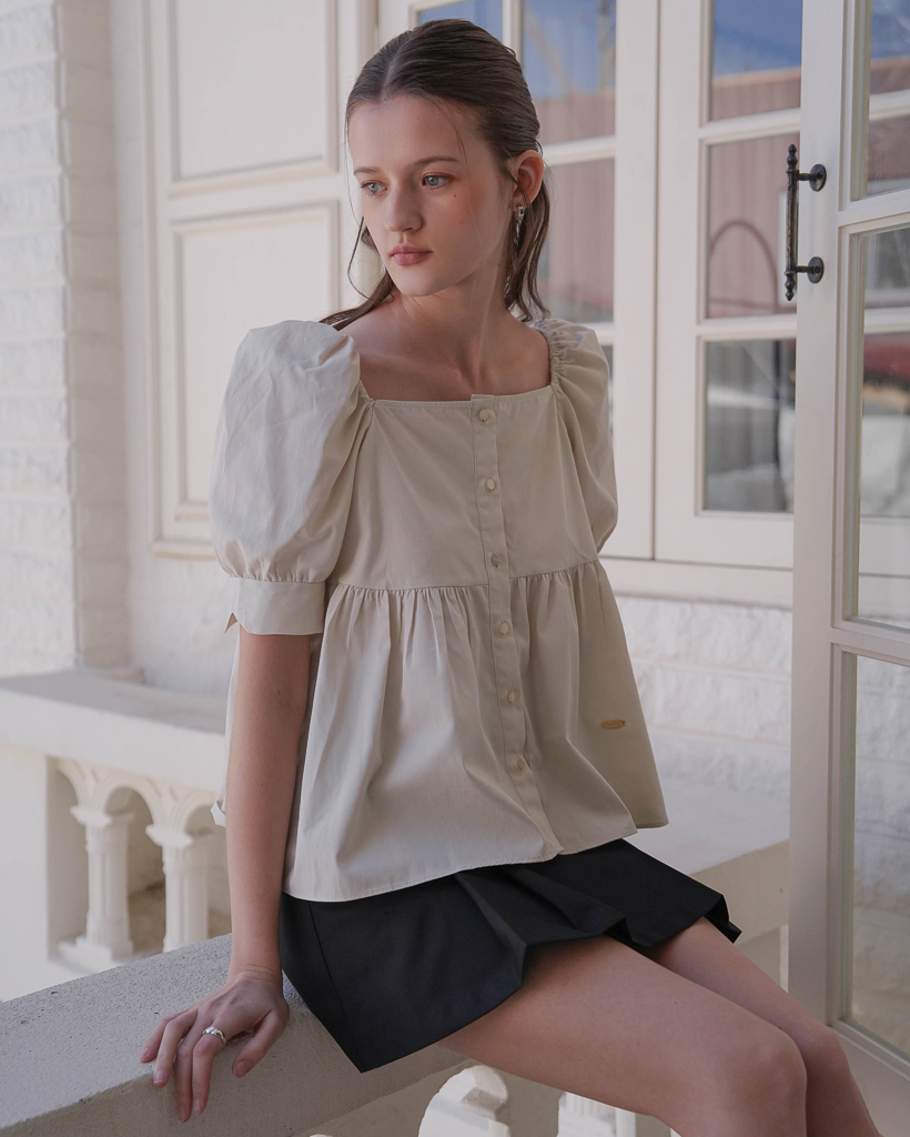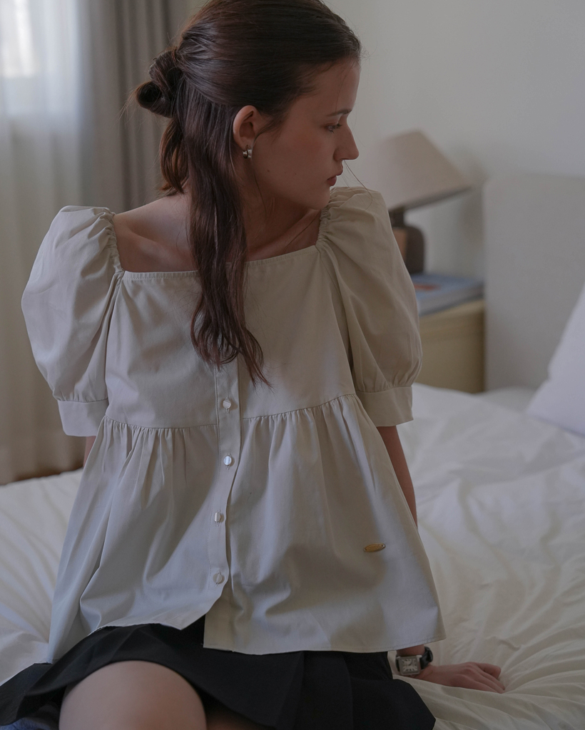 Shirring Puff Sleeve Blouse [Beige]