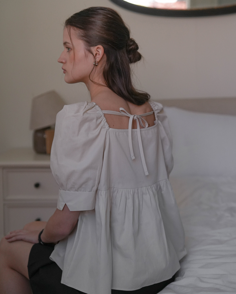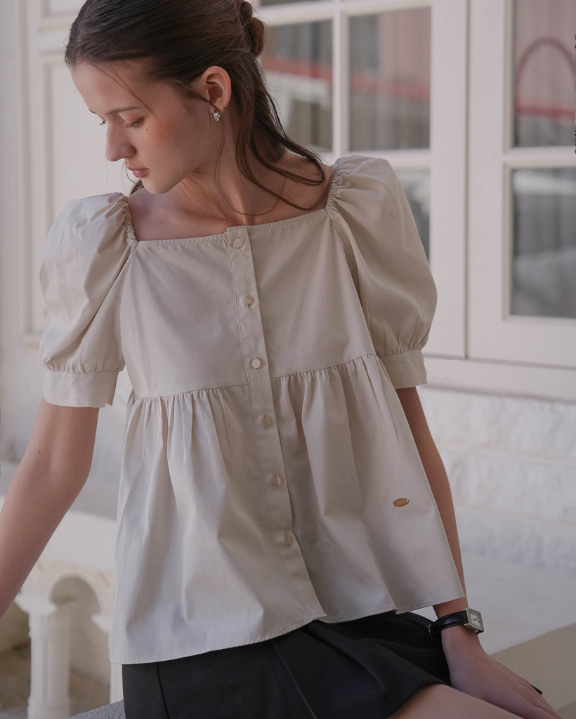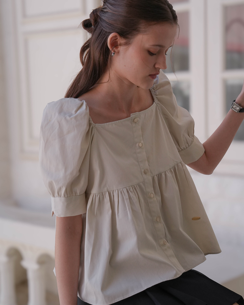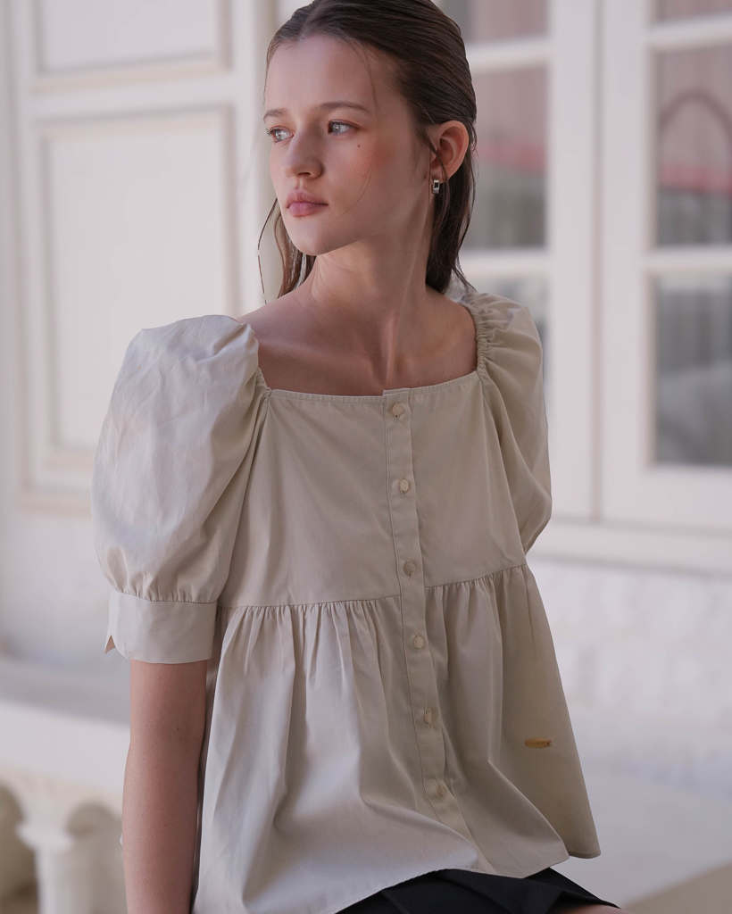 Shirring Puff Sleeve Blouse [Beige]